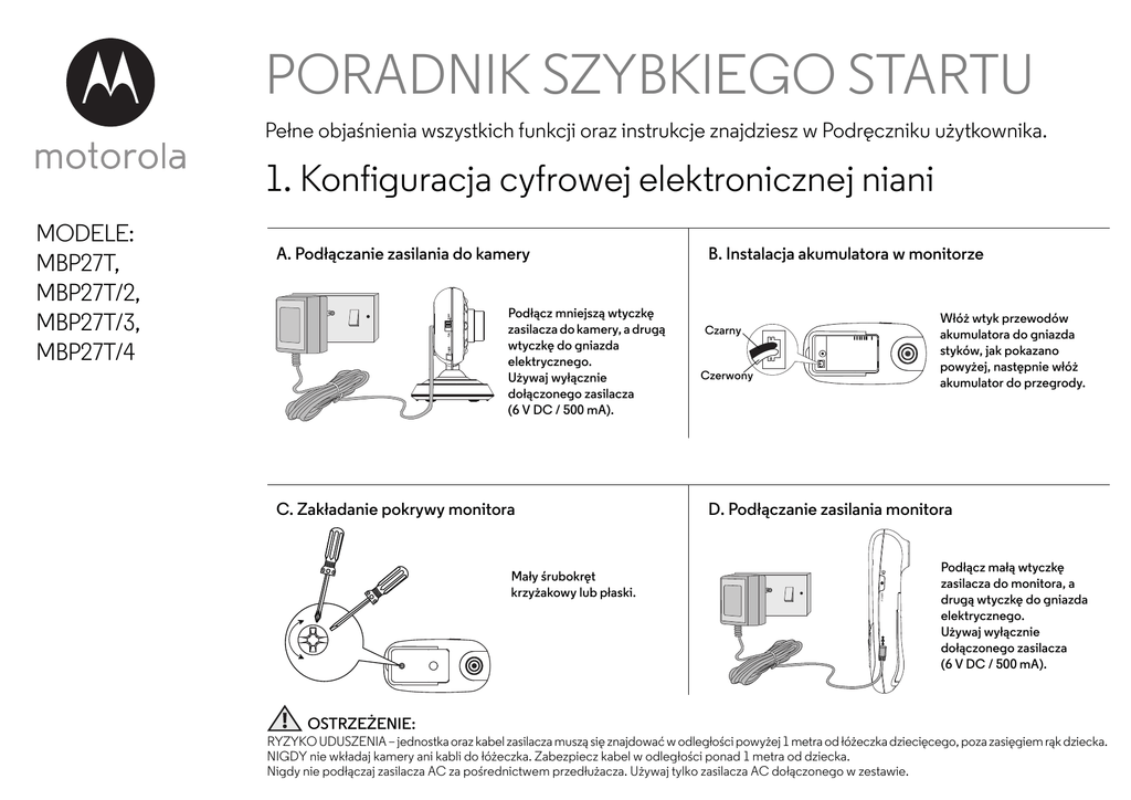 PORADNIK SZYBKIEGO STARTU Pełne objaśnienia wszystkich funkcji oraz instrukcje znajdziesz w Podręczniku użytkownika. 1. Konfiguracja cyfrowej elektronicznej niani A. Podłączanie zasilania do kamery Podłącz mniejszą wtyczkę zasilacza do kamery, a drugą wtyczkę do gniazda elektrycznego. Używaj wyłącznie dołączonego zasilacza (6 V DC / 500 mA). C. Zakładanie pokrywy monitora Mały śrubokręt krzyżakowy lub płaski. B. Instalacja akumulatora w monitorze Włóż wtyk przewodów akumulatora do gniazda styków, jak pokazano powyżej, następnie włóż akumulator do przegrody. Czarny Czerwony D. Podłączanie zasilania monitora POWER MODELE: MBP27T, MBP27T/2, MBP27T/3, MBP27T/4 Podłącz małą wtyczkę zasilacza do monitora, a drugą wtyczkę do gniazda elektrycznego. Używaj wyłącznie dołączonego zasilacza (6 V DC / 500 mA). OSTRZEŻENIE: RYZYKO UDUSZENIA – jednostka oraz kabel zasilacza muszą się znajdować w odległości powyżej 1 metra od łóżeczka dziecięcego, poza zasięgiem rąk dziecka. NIGDY nie wkładaj kamery ani kabli do łóżeczka. Zabezpiecz kabel w odległości ponad 1 metra od dziecka. Nigdy nie podłączaj zasilacza AC za pośrednictwem przedłużacza. Używaj tylko zasilacza AC dołączonego w zestawie. 2. Podstawowe funkcje przycisków Monitor PV Wyłącznik zasilania Przyciski W GÓRĘ/G?Ł.+ Przyciski W DÓŁ/GŁ.- > < Przycisk MENU/OK Przycisk Powrót/Zmiana kamery Przycisk cyfrowej regulacji kąta w pionie i poziomie Przycisk ROZMOWY Tryb mierzenia temperatury powierzchniowej Tryb mierzenia temperatury ciała na czole Naciśnij i przytrzymaj, aby włączyć/wyłączyć urządzenie. Naciśnij i przytrzymaj, aby włączyć/wyłączyć wyświetlacz. Naciśnij, aby zwiększyć głośność. Naciśnij, aby przejść w górę w opcjach menu/ustawieniach. Naciśnij, aby przesunąć ekran w górę w trybie cyfrowej regulacji kąta w pionie i poziomie. Naciśnij, aby zmniejszyć głośność. Naciśnij, aby przejść w dół w opcjach menu/ustawieniach. Naciśnij, aby przesunąć ekran w dół w trybie cyfrowej regulacji kąta w pionie i poziomie. Naciśnij, aby otworzyć opcje menu. Naciśnij, aby potwierdzić wybór. Naciśnij, aby przesunąć ekran w prawo w trybie cyfrowej regulacji kąta w pionie i poziomie. Naciśnij, aby powrócić do poprzedniego poziomu menu. Naciśnij, aby przełączyć się pomiędzy kamerami. (Jeżeli w skład zestawu wchodzi więcej niż jedna kamera). Naciśnij, aby przesunąć ekran w lewo w trybie cyfrowej regulacji kąta w pionie i poziomie. Naciśnij, aby włączyć/wyłączyć tryb cyfrowej regulacji kąta w pionie i poziomie Naciśnij i przytrzymaj, aby mówić do swojego dziecka. Naciśnij i przytrzymaj, aby zmierzyć temperaturę powierzchniową płynu. Naciśnij i przytrzymaj, aby zmierzyć temperaturę ciała dziecka. Kamera Wyłącznik Przesuń przełącznik zasilania w dół, aby włączyć jednostkę. Przesuń przełącznik zasilania w górę, aby wyłączyć jednostkę. 3. Informacje ogólne Jeśli produkt nie działa poprawnie... 1. 2. Przeczytaj ten poradnik szybkiego startu lub podręcznik użytkownika. Skontaktuj się z obsługą klienta: +49 (0) 1805 938 802 w Europie E-mail: [email protected] Producent, dystrybutor i sprzedawca: Binatone Electronics International LTD., na oficjalnej licencji produktu. MOTOROLA i logo „M” są znakami towarowymi lub zastrzeżonymi znakami towarowymi Motorola Trademark Holdings, LLC. i są wykorzystywane na mocy licencji. Wszystkie inne znaki towarowe są prawnie chronione. © 2013 Motorola Mobility LLC. Wszystkie prawa zastrzeżone. Wydrukowano w Chinach Wersja 1.0