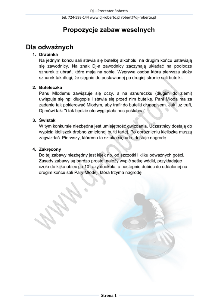 Dj – Prezenter Roberto tel. 724-598-144 www.dj-roberto.pl [email protected] Propozycje zabaw weselnych Dla odważnych 1. Drabinka Na jednym końcu sali stawia się butelkę alkoholu, na drugim końcu ustawiają się zawodnicy. Na znak Dj-a zawodnicy zaczynają układać na podłodze sznurek z ubrań, które mają na sobie. Wygrywa osoba która pierwsza ułoży sznurek tak długi, że sięgnie do postawionej po drugiej stronie sali butelki. 2. Buteleczka Panu Młodemu zawiązuje się oczy, a na sznureczku (długim do ziemi) uwiązuje się np: długopis i stawia się przed nim butelkę. Pani Młoda ma za zadanie tak pokierować Młodym, aby trafił do butelki długopisem. Jak już trafi, Dj mówi tak: ''i tak będzie oto wyglądała noc poślubna''. 3. Świstak W tym konkursie niezbędna jest umiejętność gwizdania. Uczestnicy dostają do wypicia kieliszek drobno zmielonej bułki tartej. Po opróżnieniu kieliszka muszą zagwizdać. Pierwszy, któremu ta sztuka się uda, dostaje nagrodę. 4. Zakręcony Do tej zabawy niezbędny jest kijek np. od szczotki i kilku odważnych gości. Zasady zabawy są bardzo proste: należy wypić setkę wódki, przykładając czoło do kijka obiec go 10 razy dookoła, a następnie dobiec do oddalonej na drugim końcu sali Pary Młodej, która trzyma nagrodę Strona 1