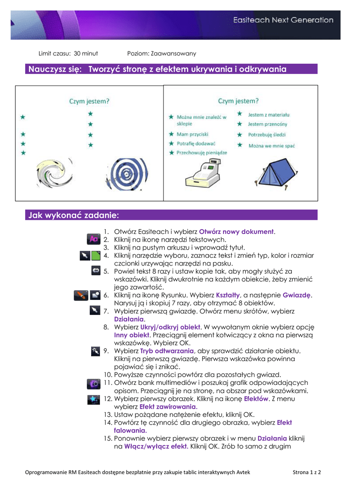 Limit czasu: 30 minut Poziom: Zaawansowany Nauczysz się: Tworzyć stronę z efektem ukrywania i odkrywania Jak wykonać zadanie: Otwórz Easiteach i wybierz Otwórz nowy dokument. Kliknij na ikonę narzędzi tekstowych. Kliknij na pustym arkuszu i wprowadź tytuł. Kliknij narzędzie wyboru, zaznacz tekst i zmień typ, kolor i rozmiar czcionki urzywając narzędzi na pasku. 5. Powiel tekst 8 razy i ustaw kopie tak, aby mogły służyć za wskazówki. Kliknij dwukrotnie na każdym obiekcie, żeby zmienić jego zawartość. 6. Kliknij na ikonę Rysunku. Wybierz Kształty, a następnie Gwiazdę. Narysuj ją i skopiuj 7 razy, aby otrzymać 8 obiektów. 7. Wybierz pierwszą gwiazdę. Otwórz menu skrótów, wybierz Działania. 8. Wybierz Ukryj/odkryj obiekt. W wywołanym oknie wybierz opcję Inny obiekt. Przeciągnij element kotwiczący z okna na pierwszą wskazówkę. Wybierz OK. 9. Wybierz Tryb odtwarzania, aby sprawdzić działanie obiektu. Kliknij na pierwszą gwiazdę. Pierwsza wskazówka powinna pojawiać się i znikać. 10. Powyższe czynności powtórz dla pozostałych gwiazd. 11. Otwórz bank multimediów i poszukaj grafik odpowiadających opisom. Przeciągnij je na stronę, na obszar pod wskazówkami. 12. Wybierz pierwszy obrazek. Kliknij na ikonę Efektów. Z menu wybierz Efekt zawirowania. 13. Ustaw pożądane natężenie efektu, kliknij OK. 14. Powtórz tę czynność dla drugiego obrazka, wybierz Efekt falowania. 15. Ponownie wybierz pierwszy obrazek i w menu Działania kliknij na Włącz/wyłącz efekt. Kliknij OK. Zrób to samo z drugim 1. 2. 3. 4. Oprogramowanie RM Easiteach dostępne bezpłatnie przy zakupie tablic interaktywnych Avtek Strona 1 z 2 obrazkiem. 16. Włącz Tryb odtwarzania, aby sprawdzić, czy wszystko poprawnie działa. Efekt powinien się pojawiać i znikać przy kliknięciu na obrazek. 17. Pamiętaj, aby wykorzystać Tryb odtwarzania do ukrycia wszystkich podpowiedzi i aktywowania efektów. Oprogramowanie RM Easiteach dostępne bezpłatnie przy zakupie tablic interaktywnych Avtek Strona 2 z 2