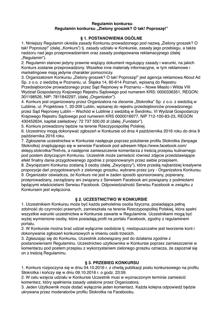 Regulamin konkursu Regulamin konkursu „Zielony groszek? O tak! Poproszę!” § 1. POSTANOWIENIA OGÓLNE 1. Niniejszy Regulamin określa zasady Konkursu prowadzonego pod nazwą „Zielony groszek? O tak! Poproszę!” (dalej „Konkurs”) tj. zasady udziału w Konkursie, zasady jego przebiegu, a także nadzoru nad jego przeprowadzeniem oraz zasady postępowania reklamacyjnego (dalej „Regulamin”). 2. Regulamin stanowi jedyny prawnie wiążący dokument regulujący zasady i warunki, na jakich Konkurs zostanie przeprowadzony. Wszelkie inne materiały informacyjne, w tym reklamowe i marketingowe mają jedynie charakter pomocniczy. 3. Organizatorem Konkursu „Zielony groszek? O tak! Poproszę!” jest agencja reklamowa About Ad Sp. z o.o. z siedzibą w Poznaniu, ul. Śląska 14, 60-614 Poznań, wpisaną do Rejestru Przedsiębiorców prowadzonego przez Sąd Rejonowy w Poznaniu – Nowe Miasto i Wilda VIII Wydział Gospodarczy Krajowego Rejestru Sądowego pod numerem KRS: 0000336351, REGON: 301198526, NIP: 7811842297, (dalej „Organizator”). 4. Konkurs jest organizowany przez Organizatora na zlecenie „Stokrotka” Sp. z o.o. z siedzibą w Lublinie, ul. Projektowa 1, 20-209 Lublin, wpisanej do rejestru przedsiębiorców prowadzonego przez Sąd Rejonowy Lublin – Wschód w Lublinie z siedzibą w Świdniku, VI Wydział Gospodarczy Krajowego Rejestru Sądowego pod numerem KRS 0000016977, NIP 712-100-83-23, REGON 430452634, kapitał zakładowy: 72 737 500,00 zł (dalej „Fundator”). 5. Konkurs prowadzony będzie na terenie Rzeczypospolitej Polskiej. 6. Uczestnicy mogą dokonywać zgłoszeń w Konkursie od dnia 4 października 2016 roku do dnia 9 października 2016 roku. 7. Zgłoszenie uczestnictwa w Konkursie następuje poprzez polubienie profilu Stokrotka (fanpage Stokrotka) znajdującego się w serwisie Facebook pod adresem https://www.facebook.com/ sklepy.stokrotka/?fref=ts, a następnie zamieszczenie komentarza z treścią przepisu kulinarnego pod postem dotyczącym Konkursu. Uczestnik może zamieścić również zdjęcie przedstawiające efekt finalny dania przygotowanego zgodnie z proponowanym przez siebie przepisem. 8. Zwycięzcami Konkursu zostaną 3 osoby (dalej „Zwycięzcy”), które prześlą najbardziej kreatywne propozycje dań przygotowanych z zielonego groszku, wybrane przez jury - Organizatora Konkursu. 9. Organizator oświadcza, że Konkurs nie jest w żaden sposób sponsorowany, popierany, przeprowadzany, zarządzany ani związany z Serwisem Facebook ani powiązany z podmiotami będącymi właścicielami Serwisu Facebook. Odpowiedzialność Serwisu Facebook w związku z Konkursem jest wyłączona. § 2. UCZESTNICTWO W KONKURSIE 1. Uczestnikiem Konkursu może być każda pełnoletnia osoba fizyczna, posiadająca pełną zdolność do czynności prawnych, zamieszkała na terenie Rzeczypospolitej Polskiej, która spełni wszystkie warunki uczestnictwa w Konkursie zawarte w Regulaminie. Uczestnikami mogą być wyżej wymienione osoby, które posiadają profil na portalu Facebook, zgodny z regulaminem portalu. 2. W Konkursie można brać udział wyłącznie osobiście tj. niedopuszczalne jest tworzenie kont i dokonywanie zgłoszeń konkursowych w imieniu osób trzecich. 3. Zgłaszając się do Konkursu, Uczestnik zobowiązany jest do działania zgodnie z postanowieniami Regulaminu. Uczestnictwo użytkownika w Konkursie poprzez zamieszczenie w komentarzu pod postem przepisu z wykorzystaniem zielonego groszku oznacza, że zapoznał się on z treścią Regulaminu. § 3. PRZEBIEG KONKURSU 1. Konkurs rozpoczyna się w dniu 04.10.2016 r. z chwilą publikacji postu konkursowego na profilu Stokrotka i kończy się w dniu 09.10.2016 r. o godz. 23:59. 2. W celu wzięcia udziału w Konkursie Uczestnik musi w wyznaczonym terminie zamieścić komentarz, który spełnienia zasady ustalone przez Organizatora. 3. Jeden Użytkownik może dodać wyłącznie jeden komentarz. Każda kolejna odpowiedź będzie ukrywana przez moderatorów profilu Stokrotka na Facebooku. 4. Zwycięzcami Konkursu zostaną 3 wybrane przez jury osoby, które zamieszczą najciekawszy przepis w komentarzu pod postem dotyczącym Konkursu. 5. W przypadku braku kontaktu z którymkolwiek ze Zwycięzców, nagrodę otrzymają następni w kolejności, wskazani przez jury Uczestnicy. 6. Wyniki konkursu zostaną opublikowane w dniu 10.010.2016 r. na profilu Stokrotki na Facebooku (https://www.facebook.com/sklepy.stokrotka/?) w formie komentarza pod postem konkursowym. 7. Organizator zastrzega sobie prawo do wykluczenia z udziału w Konkursie Uczestników, których działania są sprzeczne z prawem, dobrymi obyczajami lub Regulaminem Konkursu, w szczególności Użytkowników: a) niedziałających osobiście, lecz przez osoby trzecie; b) wykorzystujących dodatkowe adresy poczty elektronicznej do występowania w imieniu/ zgłaszania rzekomo różnych Uczestników; c) tworzących fikcyjne konta/ profile w serwisie Facebook; d) zamieszczających pod postem komentarze zawierające treści wulgarne, sprzeczne z prawem, dobrymi obyczajami lub naruszające prawa osób trzecich, jak również przedstawiające lub opisujące sytuacje lub zdarzenia, które mogą powodować zagrożenie dla zdrowia lub życia ludzi lub zwierząt. 8. Organizator zastrzega sobie prawo do usuwania treści (postów) zamieszczanych przez Uczestników w przypadku, gdy posty te zawierają treści sprzeczne z prawem, dobrymi obyczajami, wulgarne, naruszające dobra osobiste lub prawa osób trzecich. § 4. NAGRODY W KONKURSIE 1. Nagrodą w Konkursie są 3 bony o wartości 50 zł na zakupy w Stokrotce. 2. Zwycięzcy Konkursu zostaną wymienieni w komentarzu pod postem konkursowym i będą poproszeni o przesłanie wiadomości prywatnych, w celu podania danych niezbędnych do przekazania nagrody. 3. Zwycięzca nie może wymienić nagród na inne, na ich wartość pieniężną ani przenieść praw do ich otrzymania na osoby trzecie. Nagroda zostanie przesłana 