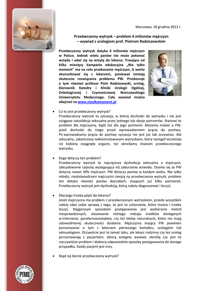 Warszawa, 18 grudnia 2013 r. Przedwczesny wytrysk – problem 4 milionów mężczyzn – wywiad z urologiem prof. Piotrem Radziszewskim Przedwczesny wytrysk dotyka 4 milionów mężczyzn w Polsce. Jednak wielu panów nie może pokonać wstydu i udać się na wizytę do lekarza. Trwająca od kilku miesięcy kampania edukacyjna „Nie tylko moment” ma na celu przekonanie mężczyzn, iż warto skonsultować się z lekarzem, ponieważ istnieją skuteczne rozwiązania problemu PW. Przekonuje o tym również profesor Piotr Radziszewski, urolog, Kierownik Katedry i Kliniki Urologii Ogólnej, Onkologicznej i Czynnościowej Warszawskiego Uniwersytetu Medycznego. Cały wywiad można obejrzeć na www.nieylkomoment.pl Co to jest przedwczesny wytrysk? Przedwczesny wytrysk to sytuacja, w której dochodzi do wytrysku i nie jest osiągana satysfakcja seksualna przez jednego lub oboje partnerów. Stanowi to problem dla mężczyzny, bądź też dla jego partnerki. Możemy mówić o PW, jeżeli dochodzi do niego przed wprowadzeniem prącia do pochwy. Po wprowadzaniu prącia do pochwy sytuacja nie jest już tak oczywista. Akt seksualny, zakończony niekontrolowanym wytryskiem, który nastąpił wcześniej niż kobieta osiągnęła orgazm, też określamy mianem przedwczesnego wytrysku. Kogo dotyczy ten problem? Przedwczesny wytrysk to najczęstsza dysfunkcja seksualna u mężczyzn, zdecydowanie częściej występująca niż zaburzenia wzwodu. Ocenia się że PW dotyczy nawet 30% mężczyzn. PW dotyczy panów w każdym wieku. Nie tylko młodzi, niedoświadczeni mężczyźni cierpią na przedwczesny wytrysk, problem ten dotyka również panów dojrzałych, mających już kilka partnerek. Przedwczesny wytrysk jest dysfunkcją, którą należy diagnozować i leczyć. Dlaczego trzeba pójść do lekarza? Jeżeli mężczyzna ma problem z przedwczesnym wytryskiem, przede wszystkim należy zdać sobie sprawę z tego, że jest to schorzenie, które można i trzeba leczyć. Najgorszym sposobem postępowania jest wybieranie metod niesprawdzonych, stosowanie różnego rodzaju środków dostępnych w Internecie, parafarmaceutyków, czy też leków naturalnych, które nie mają udowodnionej skuteczności działania. Mężczyzna mający PW powinien porozmawiać o tym z lekarzem pierwszego kontaktu, urologiem lub seksuologiem. Oczywiście jest to temat tabu, ale lekarz rodzinny czy tez urolog porozmawiają z pacjentem, zbiorą wstępny wywiad, określą czy jest to rzeczywiście problem i dobiorą odpowiednie sposoby postępowania do danego przypadku. Każdy pacjent jest inny. Skąd się bierze przedwczesny wytrysk? Wytrysk nasienia to skomplikowany proces fizjologiczny, będący pod kontrolą zarówno obwodowego, jaki i ośrodkowego układu nerwowego. Aby doszło do wytrysku musi zaistnieć cały szereg zdarzeń, począwszy od zdarzeń czuciowych, czyli od czucia na poziomie prącia, a skończywszy na zdarzeniach emocjonalnych, czyli zdarzeniach, do których dochodzi w naszym mózgu. PW to zaburzenie przewodnictwa impulsów nerwowych na poziomie ośrodkowego układu nerwowego. Na chwilę obecną nie umiemy stwierdzić, czy jest jakaś jedna konkretna choroba, która doprowadza do PW, ale wiemy, jak możemy zapobiegać PW, czyli wydłużać czas od penetracji do wytrysku. Jak przedwczesny wytrysk wpływa na związek? Jeżeli mężczyzna ma problem z wytryskiem, to cierpi również partnerka, ponieważ taki związek nie jest szczęśliwy. Najgorszym scenariuszem jest wzajemne obwinianie się – jest to błędem, ponieważ przedwczesny wytrysk jest chorobą, którą trzeba leczyć. W efekcie partnerzy odsuwają się od siebie, zaczynają unikać seksu, który staje się dla obojga aktem frustrującym. Seks, który powinien być czymś radosnym, cementującym związek, pogłębia napięcie, frustrację, zwiększa cierpienie. Taki związek nie jest w stanie długo, normalnie funkcjonować. Czy kampania „Nie tylko moment” pomoże mężczyznom uporać się z problemem przedwczesnego wytrysku. Myślę, że kampania pomoże mężczyznom pokonać wstyd. Już teraz przychodzą do mnie mężczyźni z pytaniem, jak walczyć z przedwczesnym wytryskiem. Jest to niewątpliwie zaletą kampanii – realnie wpływa na zgłaszalność pacjentów do gabinetu. Mam nadzieję, że dzięki długofalowej edukacji społeczeństwa będziemy w stanie pomóc coraz większej liczbie pacjentów. Więcej informacji na: www.nietylkomoment.pl