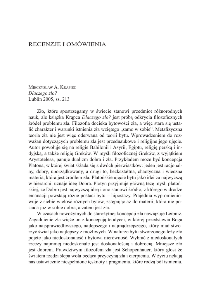 Recenzje i omówienia 255 RECENZJE I OMÓWIENIA MIECZYSŁAW A. KRĄPIEC Dlaczego zło? Lublin 2005, ss. 213 Zło, które spostrzegamy w świecie stanowi przedmiot różnorodnych nauk, ale książka Krąpca Dlaczego zło? jest próbą odkrycia filozoficznych źródeł problemu zła. Filozofia docieka bytowości zła, a więc stara się ustalić charakter i warunki istnienia zła wziętego „samo w sobie”. Metafizyczna teoria zła nie jest więc oderwana od teorii bytu. Wprowadzeniem do rozważań dotyczących problemu zła jest przednaukowe i religijne jego ujęcie. Autor powołuje się na religie Babilonii i Asyrii, Egiptu, religię perską i indyjską, a także religię Greków. W myśli filozoficznej Greków, z wyjątkiem Arystotelesa, panuje dualizm dobra i zła. Przykładem może być koncepcja Platona, w której świat składa się z dwóch pierwiastków: jeden jest racjonalny, dobry, uporządkowany, a drugi to, bezkształtna, chaotyczna i wieczna materia, która jest źródłem zła. Platońskie ujęcie bytu jako idei za najwyższą w hierarchii uznaje ideę Dobra. Plotyn przyjmuje główną tezę myśli platońskiej, że Dobro jest najwyższą ideą i ono stanowi źródło, z którego w drodze emanacji powstają różne postaci bytu – hipostazy. Prajednia wypromieniowuje z siebie wielość różnych bytów, zstępując aż do materii, która nie posiada już w sobie dobra, a zatem jest zła. W czasach nowożytnych do starożytnej koncepcji zła nawiązuje Leibniz. Zagadnienie zła wiąże on z koncepcją teodycei, w której przedstawia Boga jako najsprawiedliwszego, najlepszego i najmądrzejszego, który miał stworzyć świat jako najlepszy z możliwych. W naturze bytu stworzonego leży zło pojęte jako niedoskonałość i bytowa nierówność. Wybrać z niedoskonałych rzeczy najmniej niedoskonałe jest doskonałością i dobrocią. Mniejsze zło jest dobrem. Prawdziwym filozofem zła jest Schopenhauer, który głosi że światem rządzi ślepa wola będąca przyczyną zła i cierpienia. W życiu nękają nas ustawicznie niespełnione tęsknoty i pragnienia, które rodzą ból istnienia. 256 Recenzje i omówienia Życie ludzkie jest tylko krótkim snem, wyskokiem w dziedzinę nieuświadomionej ślepej woli. Ślepa wola nieustannie popycha nas ku życiu po to, aby zrozumieć bezsens własnego życia. Analizując świat i występujące w nim zdarzenia, ostatecznym jego tłumaczeniem jest istnienie bezrozumnej siły i ślepej woli. Świat jest zatem z natury zły. Teoria Schopenhauera, a także myśl Leibniza oraz nurt filozofii platońskiej i neoplatońskiej stoją na stanowisku, że zło ma pozytywną naturę. Rozumowanie to wspiera się na przekonaniu, że sposób naszego poznania jest adekwatny do sposobu bytowania. Krąpiec wybiera inną drogę związaną z poznaniem zdroworozsądkowym, w której braki w bycie traktuje się jako przejaw zła. I tak w porządku naturalnym jest to brak zdrowia, wzroku jak i inne braki cielesne, ale mogą też występować braki moralne, i taki stan rzeczy nazywamy złem. Teoria braku wskazuje na swoistą strukturę bytu. I tak dla Arystotelesa jest to koncepcja bytu złożonego z formy i materii, dla św. Tomasza koncepcja bytu złożonego z istoty i istnienia. W obu wypadkach mamy do czynienia ze złożeniem czynników różnorodnych, niepełnych układających się w relacje aktu do możności, tak że każdy element doskonalony jest możnością, a doskonalący jest aktem czyli formą. Forma jest tym elementem doskonalącym. Brakiem nazywamy zatem „nieobecność jakiejś formy w podmiocie zdolnym ją posiadać”. Poznanie braku jest zatem uwarunkowane uprzednim poznaniem natury bytu. Poznanie natury danej rzeczy dokonać się może jedynie przez uformowanie właściwego sobie pojęcia o danej rzeczy. Wypracowane pojęcie natury danego bytu pozwala wyrokować o nieobecności jakieś cechy występującej w bycie jako brak tej oto natury. Utworzenie pojęcia ogólnego właściwego danej naturze jest uwarunkowane powolnym, indukcyjnym poznawaniem relacji i związków koniecznych jakie mają miejsce w naturze bytu czyli relacji konstytuujących daną rzecz. Jeśli poznamy zespół relacji konstytuujących naturę rzeczy, wówczas zdolni jesteśmy dostrzec niewystępowanie jakiegoś elementu w poszczególnym konkrecie, którego abstrakcyjna natura właśnie tę cechę posiada. Wówczas nieobecność danej cechy w konkrecie będzie brakiem. Poznanie konkretnego zła mające miejsce w podmiocie wymaga zatem poznania idei, będących wzorem rzeczy istniejących w umyśle Boga. Bóg stworzył świat poprzez intelekt, dlatego konieczne jest, aby w umyśle boskim istniała forma, na podobieństwo której, świat został stworzony. Poznanie natury rzeczy sięga zatem Boskich idei. Pierwszym etapem i podstawą wyznaczania braku jakieś rzeczy jest poznawcze ujęcie elementów istotnych konstytuujących daną rzecz. W ten sposób można dostrzec, czy rzecz ma braki, czy też ich nie posiada. Nie ma rzeczy z brakami cech istotnych, gdyż przekreślałoby to bytowość danej rzeczy. Zło rozumiane jako rzeczywisty brak jakiegoś elementu nie może istnieć jako Recenzje i omówienia 257 pozytywna natura bytowa. Poznanie braku, a przez to samo ustalanie natury zła wymaga, aby poznając rzeczy na drodze indukcji, nie ustalać jedynie cech istotnych, ale i te, które należą do integralności rzeczy oraz jej doskonałości. W aspektach integralnych, w których stwierdza się przynależność poszczególnych części jedności bytowej nie trudno ustalić nieobecność jakiegoś elementu integralnego. Źródłem spostrzeżenia zła jest brak w czynnikach integrujących jakiś byt materialny jak i w aspektach doskonałościowych. Byt w aspektach doskonałościowych nie działa sam, przez swoją istotę, lecz działa poprzez swoje władze, pojęte jako konieczne właściwości, poprzez które substancja może skontaktować się ze światem. Władze te są