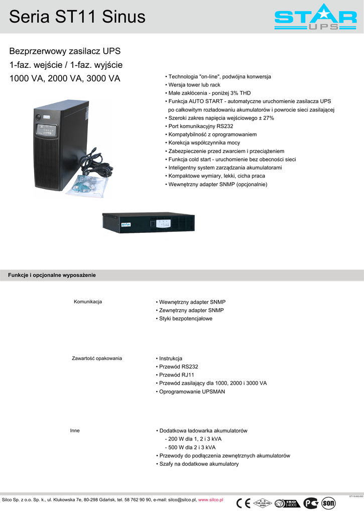 Seria ST11 Sinus Bezprzerwowy zasilacz UPS 1-faz. wejście / 1-faz. wyjście 1000 VA, 2000 VA, 3000 VA • Technologia "on-line", podwójna konwersja • Wersja tower lub rack • Małe zakłócenia - poniżej 3% THD • Funkcja AUTO START - automatyczne uruchomienie zasilacza UPS po całkowitym rozładowaniu akumulatorów i powrocie sieci zasilającej • Szeroki zakres napięcia wejściowego ± 27% • Port komunikacyjny RS232 • Kompatybilność z oprogramowaniem • Korekcja współczynnika mocy • Zabezpieczenie przed zwarciem i przeciążeniem • Funkcja cold start - uruchomienie bez obecności sieci • Inteligentny system zarządzania akumulatorami • Kompaktowe wymiary, lekki, cicha praca • Wewnętrzny adapter SNMP (opcjonalnie) Funkcje i opcjonalne wyposażenie Komunikacja • Wewnętrzny adapter SNMP • Zewnętrzny adapter SNMP • Styki bezpotencjałowe Zawartość opakowania • Instrukcja • Przewód RS232 • Przewód RJ11 • Przewód zasilający dla 1000, 2000 i 3000 VA • Oprogramowanie UPSMAN Inne • Dodatkowa ładowarka akumulatorów - 200 W dla 1, 2 i 3 kVA - 500 W dla 2 i 3 kVA • Przewody do podłączenia zewnętrznych akumulatorów • Szafy na dodatkowe akumulatory Silco Sp. z o.o. Sp. k., ul. Klukowska 7e, 80-298 Gdańsk, tel. 58 762 90 90, e-mail: [email protected], www.silco.pl ST11S-003-003 Seria ST11 Sinus Model Moc (VA) ST11S 1000 ST11S 2000 ST11S 3000 1000 2000 3000 Wejście Napięcie 160 V AC - 280 V AC Częstotliwość 50 / 60 Hz ± 5 % Współczynnik mocy > 0,98 Wyjście Współczynnik mocy 0,7 220 220VVAC AC/ /230V 230 VAC AC / 240 V AC Napięcie Stabilność napięcia ±2% ±2% Częstotliwość 50 / 60 Hz (autodetekcja), ± 0,5 % THD napięcia < 3 % (przy obciążeniu liniowym) Współczynnik szczytu 3:1 Możliwość przeciążania 100 - 120 % przez 60 sekund; 120 - 150 % przez 10 sekund Sprawność całkowita > 88 % Sprawność falownika > 90 % 0 ms Czas transferu Gniazda wyjściowe 3 szt. IEC, 2 szt. Schuko 3 szt. IEC, 1 szt. Schuko 6 szt. IEC, 2 szt. Schuko Akumulatory Rodzaj kwasowo-ołowiowe, bezobsługowe 8 godzin (naładowanie do 90%) Czas ładowania Napięcie Liczba akumulatorów 36 V DC 72 V DC 96 V DC 3 szt. 12 V 7 Ah 6 szt. 12 V 7 Ah 8 szt. 12 V 7 Ah Czas podtrzymania przy obciążeniu 100% przy obciążeniu 50% 5 min. 5 min. 16 min. 12 min. Wyświetlacz Wyświetlacz LED wejście, falownik, bypass, awaria, przeciążenie, niski poz. baterii, autodiagnostyka, obciążenie / poziom akumulatorów Alarmy awaria zasilania, niski poziom baterii, przełączenie na bypass, awaria Zabezpieczenia przed: zwarciem, przegrzaniem, przeciążeniem, zbyt wysokim napięciem, niskim poziomem baterii Komunikacja Porty komunikacyjne RS232 Oprogramowanie do monitorowania i zarządzania, dostarczane w standardzie Otoczenie Temperatura pracy 0 - 40 ºC Wilgotność powietrza 0 - 95 % Hałas z odl. 1 metra < 45 dBA Stopień ochrony IP 20 Wymiary i waga Wersja Tower Waga (kg) Wymiary (mm) 15 29 35 147 x 401 x 223 (sz. x gł. x wys.) 130 x 475 x 360 (sz. x gł. x wys.) 190 x 450 x 360 (sz. x gł. x wys.) Wersja Rack Waga (kg) Wymiary (mm) 16 28 37 483 x 390 x 88 (sz. x gł. x wys.) 483 x 485 x 130 (sz. x gł. x wys.) 483 x 460 x 192 (sz. x gł. x wys.) Normy i certyfikaty EN62040-1-1 (bezpieczeństwo); EN62040-2 (EMC), CE Informacje podane w karcie mają zastosowanie w typowych rozwiązaniach. Zgodnie z polityką ciągłego doskonalenia Silco zachowuje prawo do zmiany specyfikacji technicznej bez wcześniejszego powiadomienia. ST11S-003-003 Silco Sp. z o.o. Sp. k., ul. Klukowska 7e, 80-298 Gdańsk, tel. 58 762 90 90, e-mail: [email protected], www.silco.pl
