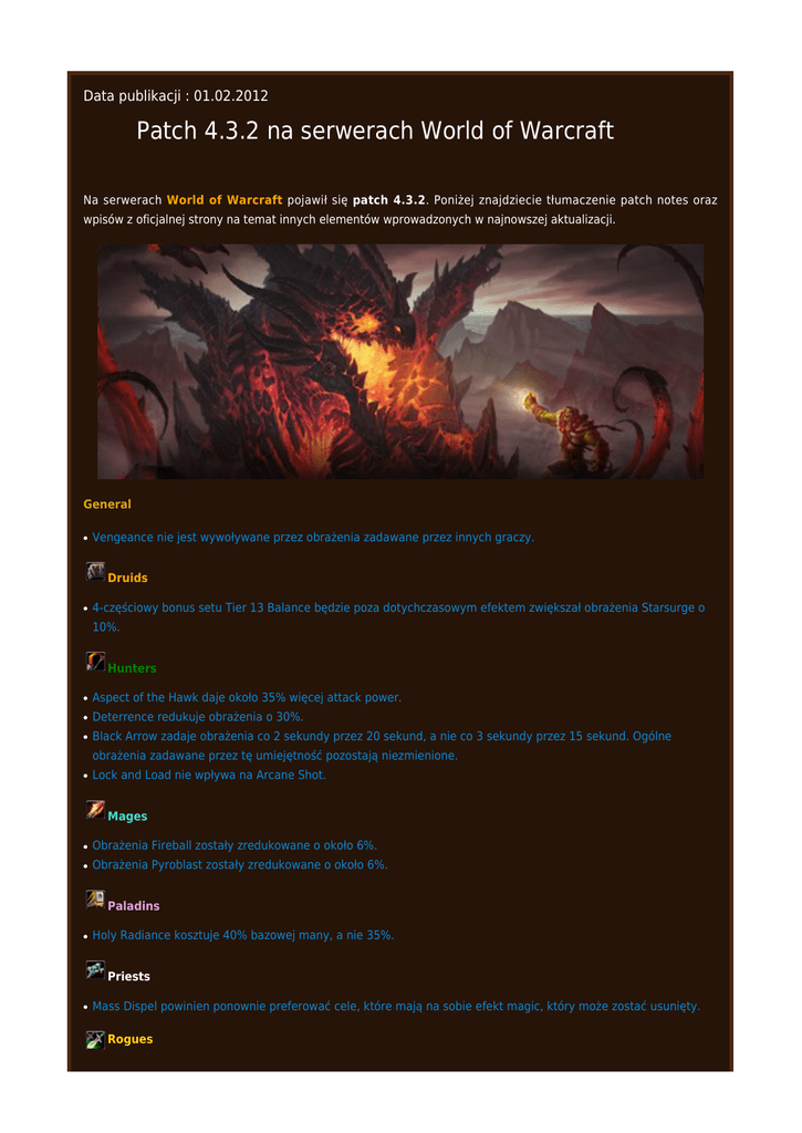 Data publikacji : 01.02.2012 Patch 4.3.2 na serwerach World of Warcraft Na serwerach World of Warcraft pojawił się patch 4.3.2. Poniżej znajdziecie tłumaczenie patch notes oraz wpisów z oficjalnej strony na temat innych elementów wprowadzonych w najnowszej aktualizacji. General ● Vengeance nie jest wywoływane przez obrażenia zadawane przez innych graczy. Druids ● 4-częściowy bonus setu Tier 13 Balance będzie poza dotychczasowym efektem zwiększał obrażenia Starsurge o 10%. Hunters ● Aspect of the Hawk daje około 35% więcej attack power. ● Deterrence redukuje obrażenia o 30%. ● Black Arrow zadaje obrażenia co 2 sekundy przez 20 sekund, a nie co 3 sekundy przez 15 sekund. Ogólne obrażenia zadawane przez tę umiejętność pozostają niezmienione. ● Lock and Load nie wpływa na Arcane Shot. Mages ● Obrażenia Fireball zostały zredukowane o około 6%. ● Obrażenia Pyroblast zostały zredukowane o około 6%. Paladins ● Holy Radiance kosztuje 40% bazowej many, a nie 35%. Priests ● Mass Dispel powinien ponownie preferować cele, które mają na sobie efekt magic, który może zostać usunięty. Rogues ● Adrenaline Rush nie wywołuje global cooldowna. Dungeons & Raids ● Możesz tworzyć grupę raid ze znajomymi Real ID z tej samej frakcji, dzięki czemu możecie wchodzić w kolejkę do Raid Finder w grupie większej niż 5 postaci, robić stare strefy raid w wersji normalnej i heroic oraz uczestniczyć w Battlegroundach. Nie będziecie mogli jednak robić wersji normalnej i heroic strefy Dragon Soul ze znajomymi Real ID z innych serwerów. Więcej informacji... ● Poprawiono kilka błędów i opisów w Dungeon Journal dla strefy Dragon Soul. ● Gracze nie mogą wygrać kilku takich samych przedmiotów z tego samego bossa w Raid Finderze. Przykładowo, gracz, który wybiera Need na dwie części zestawu lub bronie i wygrywa jedną z nich, nie będzie mógł wygrać drugiej z tego samego bossa. ● Dragon Soul ❍ Yor'sahj the Unsleeping ■ Zaklęcie szamana Unleash Life prawidłowo wywołuje efekt Deep Corruption na swym celu. Poprzednie, efekt ten był nakładany na zarówno cel jak i postać korzystającą z tej umiejętności. ❍ Warmaster Blackhorn ■ ❍ Wizualne ostrzeżenie przed umiejętnością Blade Rush Twilight Elite powinno być łatwiejsze do spostrzeżenia. Spine of Deathwing ■ Życie Burning Tendons zostało zredukowane o 15% w 10- i 25-osobowej wersji Heroic. Zmiana ta redukuje ilość burst damage, który niezbędny jest przy tej walce, co powinno pozwolić grupom na większą swobodę przy kompozycji klas. ❍ Madness of Deathwing ■ Zaklęcia kapłana, Leap of Faith, nie może zostać użyte, kiedy jest on pod wpływem działania efektu Carrying Winds. Items ● Obrażenia z Vial of Shadows (Lightning Strike) zostały zredukowane o około jedną trzecią, jednak będą one wywoływane mniej więcej trzy razy częściej. Dokonaliśmy tej zmiany po to, aby utrzymać taki sam DPS przedmiotu przy jednoczesnym zredukowaniu jego burst damage'a, szczególnie w PvP. ● Efekt Maw of the Dragonlord może być wywołany przez leczenie zaklęciem Holy Word: Sanctuary. User Interface ● Naprawiono błąd, który sprawiał, że ustawienia Mature Language Filter resetowały się po wyjściu z gry. ● W grze pojawia się informacja na 15 minut przed tym, jak gracz zostanie rozłączony przez ustawienia kontroli rodzicielskiej [parental control]. Wprowadzenie najnowszej aktualizacji wiąże się także z rozpoczęciem nerfowania strefy raid Dragon Soul. Poniżej przedstawiamy tłumaczenie wpisu, który jakiś czas temu pojawił się na łamach oficjalnej strony World of Warcraft. W czasie przerwy technicznej 31 stycznia, strefa raid Dragon Soul zostanie spowita zaklęciem "Power of the Aspects", które zredukuje życie oraz zadawane obrażenia wszystkich przeciwników o 5%. Czar ten będzie z czasem stawał się coraz bardziej potężny, aby zmniejszyć poziom trudności i zwiększyć dostępność strefy. "Power of the Aspects" będzie działało zarówno w wersji normalnej i Heroic, jednak nie dotknie Looking for Raid. Może ono zostać wyłączone w rozmowie z Lordem Afrasastraszem, który znajduje się na początku Dragon Soul, jeśli grupa zdecyduje się na walkę bez wsparcia smoczych aspektów. Osoby, które robiły Firelands i/lub Icecrown wiedzą, że z czasem dopasowujemy poziom trudności. Z wielu powodów, grupy mogą mieć problemy z daną walką, a naszym zamierzeniem jest to, aby dopasować content tak, aby zapewnić możliwość dalszego robienia postępów, cieszenia się raidowaniem oraz zdobywania przedmiotów. W Icecrown etapami buffowaliśmy graczy i mimo, że następowały one powoli (i istniała możliwość wyłączenia buffa), doprowadziło to do mylnych przekonań dotyczących możliwości postaci, a po wyjściu ze strefy raid, gracze czuli się mniej efektywni. W Firelands chcieliśmy to poprawić przez nerfowanie contentu, a nie buffowanie graczy, jednak dokonaliśmy tego w sposób jednorazowy, co zniechęciło graczy, którzy nie potrzebowali tak drastycznej zmiany. W przypadku Dragon Soul chcemy wziąć to co najlepsze z obu tych rozwiązań, dlatego etapami będziemy nerfować content, dzięki czemu wszystko będzie zależało od graczy a my będziemy oferować wsparcie przez dłuższy czas, pozostawiając możliwość wyłączenia buffa po rozmowie z Lordem Afrasastraszem. Mamy nadzieję, że dalej będziecie dobrze się bawić w Dragon Soul oraz, że te zmiany pozwolą wam na spróbowanie wyższego poziomu trudności lub pokonanie kolejnego bossa. W najnowszym patchu do World of Warcraft gracze zyskują możliwość tworzenia grupy raid ze znajomymi z Real ID. Więcej informacji poniżej. Ostatnio wprowadziliśmy możliwość tworzenia grup między serwerami dla znajomych z Real ID, a w patchu 4.3.2 dodamy tę samą funkcjonalność przy formowaniu raidów, abyście mogli robić starsze normalne i heroic st