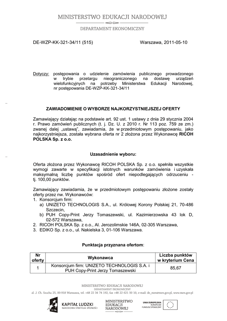 DE-WZP-KK-321-34/11 (515) Warszawa, 2011-05-10 Dotyczy: postępowania o udzielenie zamówienia publicznego prowadzonego w trybie przetargu nieograniczonego na dostawę urządzeń wielofunkcyjnych na potrzeby Ministerstwa Edukacji Narodowej, nr postępowania DE-WZP-KK-321-34/11 ZAWIADOMIENIE O WYBORZE NAJKORZYSTNIEJSZEJ OFERTY Zamawiający działając na podstawie art. 92 ust. 1 ustawy z dnia 29 stycznia 2004 r. Prawo zamówień publicznych (t. j. Dz. U. z 2010 r. Nr 113 poz. 759 ze zm.) zwanej dalej „ustawą”, zawiadamia, że w przedmiotowym postępowaniu, jako najkorzystniejsza, została wybrana oferta nr 2 złożona przez Wykonawcę RICOH POLSKA Sp. z o.o. Uzasadnienie wyboru: Oferta złożona przez Wykonawcę RICOH POLSKA Sp. z o.o. spełniła wszystkie wymogi zawarte w specyfikacji istotnych warunków zamówienia i uzyskała maksymalną liczbę punktów spośród ofert niepodlegających odrzuceniu tj. 100,00 punktów. Zamawiający zawiadamia, że w przedmiotowym postępowaniu złożone zostały oferty przez nw. Wykonawców: 1. Konsorcjum firm: a) UNIZETO TECHNOLOGIS S.A., ul. Królowej Korony Polskiej 21, 70-486 Szczecin, b) PUH Copy-Print Jerzy Tomaszewski, ul. Kazimierzowska 43 lok D, 02-572 Warszawa, 2. RICOH POLSKA Sp. z o.o., Al. Jerozolimskie 146A, 02-305 Warszawa, 3. EDIKO Sp. z o.o., ul. Nakielska 3, 01-106 Warszawa. Punktacja przyznana ofertom: Nr oferty Wykonawca Liczba punktów w kryterium Cena 1 Konsorcjum firm: UNIZETO TECHNOLOGIS S.A. i PUH Copy-Print Jerzy Tomaszewski 85,67 2 RICOH POLSKA Sp. z o.o. 100 3 EDIKO Sp. z o.o. 92,36 Na podstawie art. 92 ust. 1 pkt 4 ustawy, Zamawiający zawiadamia, że w niniejszym postępowaniu, stosownie do art. 94 ust. 2. pkt 3 ustawy, Zamawiający może zawrzeć umowę w sprawie zamówienia publicznego w terminie krótszym niż 5 dni od dnia przesłania zawiadomienia o wyborze najkorzystniejszej oferty, gdyż w przedmiotowym postępowaniu nie wykluczono żadnego wykonawcy i nie odrzucono żadnej oferty. 2