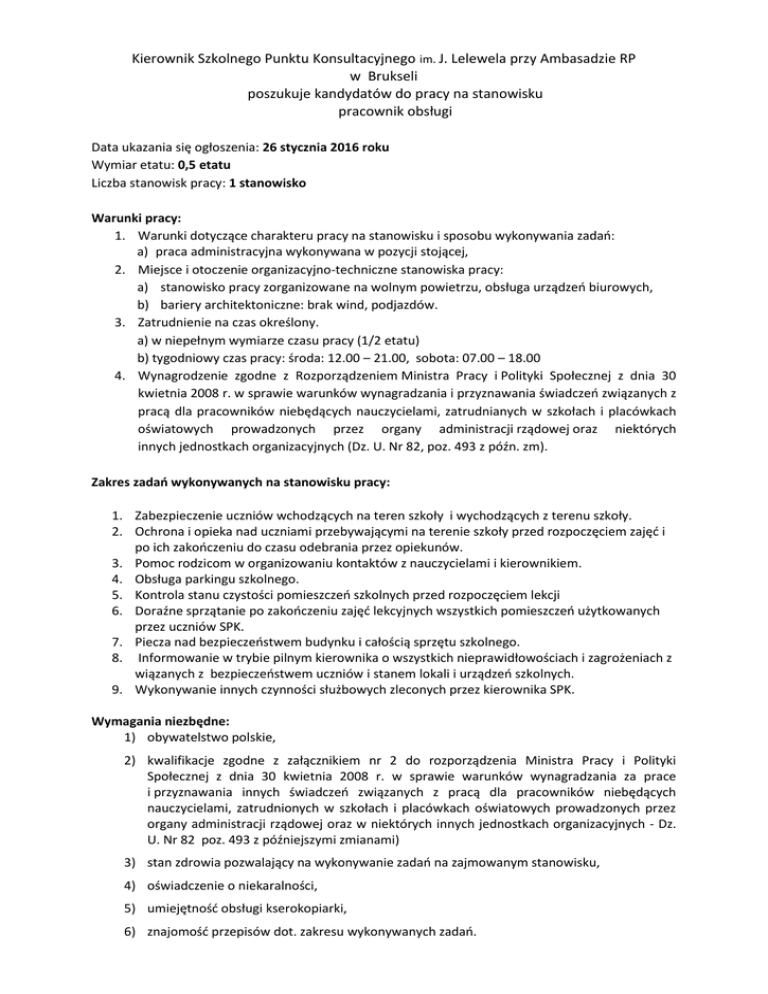 Kierownik Szkolnego Punktu Konsultacyjnego im. J. Lelewela przy Ambasadzie RP w Brukseli poszukuje kandydatów do pracy na stanowisku pracownik obsługi Data ukazania się ogłoszenia: 26 stycznia 2016 roku Wymiar etatu: 0,5 etatu Liczba stanowisk pracy: 1 stanowisko Warunki pracy: 1. Warunki dotyczące charakteru pracy na stanowisku i sposobu wykonywania zadań: a) praca administracyjna wykonywana w pozycji stojącej, 2. Miejsce i otoczenie organizacyjno-techniczne stanowiska pracy: a) stanowisko pracy zorganizowane na wolnym powietrzu, obsługa urządzeń biurowych, b) bariery architektoniczne: brak wind, podjazdów. 3. Zatrudnienie na czas określony. a) w niepełnym wymiarze czasu pracy (1/2 etatu) b) tygodniowy czas pracy: środa: 12.00 – 21.00, sobota: 07.00 – 18.00 4. Wynagrodzenie zgodne z Rozporządzeniem Ministra Pracy i Polityki Społecznej z dnia 30 kwietnia 2008 r. w sprawie warunków wynagradzania i przyznawania świadczeń związanych z pracą dla pracowników niebędących nauczycielami, zatrudnianych w szkołach i placówkach oświatowych prowadzonych przez organy administracji rządowej oraz niektórych innych jednostkach organizacyjnych (Dz. U. Nr 82, poz. 493 z późn. zm). Zakres zadań wykonywanych na stanowisku pracy: 1. Zabezpieczenie uczniów wchodzących na teren szkoły i wychodzących z terenu szkoły. 2. Ochrona i opieka nad uczniami przebywającymi na terenie szkoły przed rozpoczęciem zajęć i po ich zakończeniu do czasu odebrania przez opiekunów. 3. Pomoc rodzicom w organizowaniu kontaktów z nauczycielami i kierownikiem. 4. Obsługa parkingu szkolnego. 5. Kontrola stanu czystości pomieszczeń szkolnych przed rozpoczęciem lekcji 6. Doraźne sprzątanie po zakończeniu zajęć lekcyjnych wszystkich pomieszczeń użytkowanych przez uczniów SPK. 7. Piecza nad bezpieczeństwem budynku i całością sprzętu szkolnego. 8. Informowanie w trybie pilnym kierownika o wszystkich nieprawidłowościach i zagrożeniach z wiązanych z bezpieczeństwem uczniów i stanem lokali i urządzeń szkolnych. 9. Wykonywanie innych czynności służbowych zleconych przez kierownika SPK. Wymagania niezbędne: 1) obywatelstwo polskie, 2) kwalifikacje zgodne z załącznikiem nr 2 do rozporządzenia Ministra Pracy i Polityki Społecznej z dnia 30 kwietnia 2008 r. w sprawie warunków wynagradzania za prace i przyznawania innych świadczeń związanych z pracą dla pracowników niebędących nauczycielami, zatrudnionych w szkołach i placówkach oświatowych prowadzonych przez organy administracji rządowej oraz w niektórych innych jednostkach organizacyjnych - Dz. U. Nr 82 poz. 493 z późniejszymi zmianami) 3) stan zdrowia pozwalający na wykonywanie zadań na zajmowanym stanowisku, 4) oświadczenie o niekaralności, 5) umiejętność obsługi kserokopiarki, 6) znajomość przepisów dot. zakresu wykonywanych zadań. Wymagania dodatkowe: 1) komunikatywność, życzliwość, cierpliwość, punktualność, umiejętność pracy w zespole, łatwość nawiązywania kontaktów, odporność na stres, 2) minimum wykształcenie zawodowe, 3) umiejętność obsługi urządzeń wielofunkcyjnych, przesyłania dokumentów w formie elektronicznej, obsługi poczty e-mail. Dokumenty wymagane przy składaniu aplikacji: 1) curriculum vitae i list motywacyjny, 2) oświadczenie kandydata o wyrażeniu zgody na przetwarzanie danych osobowych do celów rekrutacji, 3) kopie dokumentów potwierdzających wykształcenie, uzyskane kwalifikacje, 4) kopie dokumentów potwierdzających wymagany staż pracy, 5) w przypadku osób nieposiadających obywatelstwa polskiego - kopia dokumentu potwierdzającego znajomość języka polskiego, potwierdzona stosownym dokumentem, 6) kopia dokumentu potwierdzającego niepełnosprawność – w przypadku kandydatów, którzy zamierzają skorzystać z pierwszeństwa w zatrudnieniu, w przypadku, gdy znajdą się w gronie najlepszych kandydatów. Wymagane dokumenty należy przesłać w terminie do 22 lutego 2016 r. na adres: WYDZIAŁ KONSULARNY AMBASADY RP W BRUKSELI Szkolny Punkt Konsultacyjny w Brukseli Rue des Francs 28 1040 Bruxelles z dopiskiem „Konkurs na stanowisko pracownika obsługi SPK w Brukseli” Po w/w terminie Kierownik SPK telefonicznie zaprosi kandydatów wybranych spośród ofert na rozmowy kwalifikacyjne. Informacje dodatkowe: 1) oświadczenia muszą być podpisane własnoręcznie, 2) dokumenty przedkładane w formie kopii powinny być potwierdzone przez kandydata klauzulą „za zgodność z oryginałem”. 3) osoba, która wygra konkurs będzie zobowiązana przed podpisaniem umowy do wykonania badań lekarskich. 4) oferty złożone po terminie (decyduje data stempla pocztowego) lub niezawierające wszystkich dokumentów wymienionych w „wymaganych dokumentach i oświadczeniach”, zostaną odrzucone, 5) w przypadku przedstawienia dokumentów w języku obcym należy dołączyć również ich tłumaczenie na język polski dokonane przez tłumacza przysięgłego, 6) oferty nadesłane, z wyjątkiem oferty wybranego kandydata zostaną komisyjnie zniszczone.