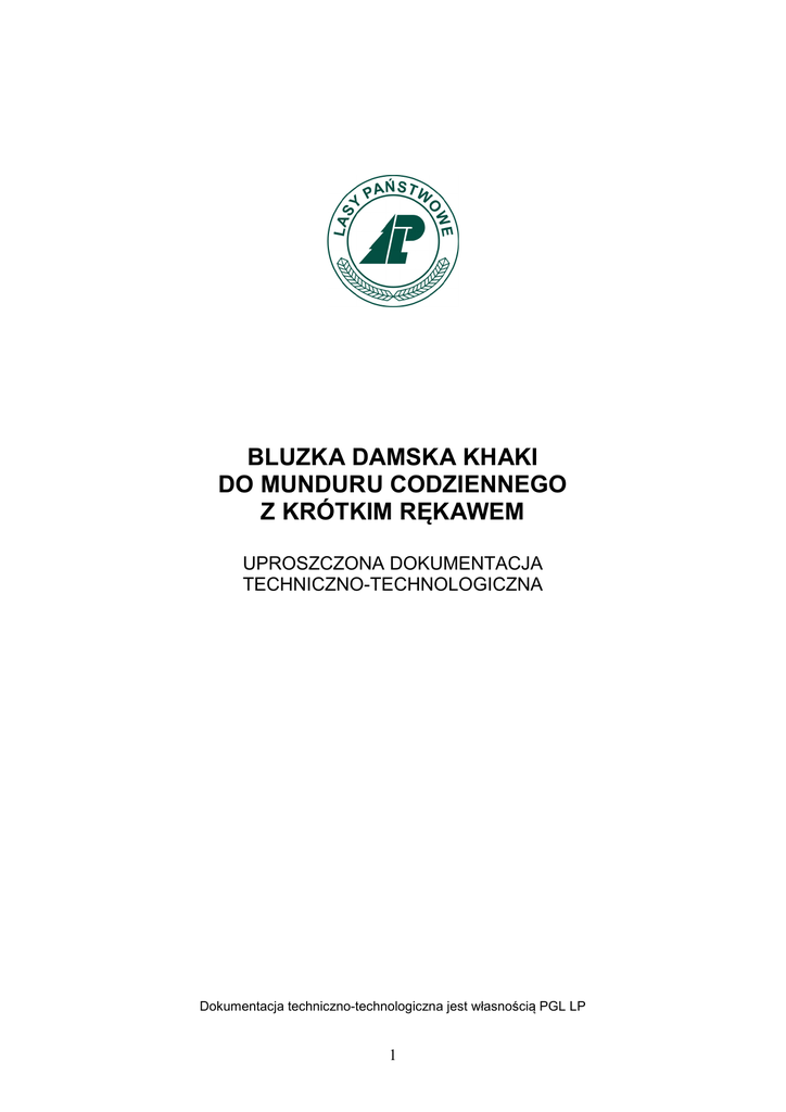 BLUZKA DAMSKA KHAKI DO MUNDURU CODZIENNEGO Z KRÓTKIM RĘKAWEM UPROSZCZONA DOKUMENTACJA TECHNICZNO-TECHNOLOGICZNA Dokumentacja techniczno-technologiczna jest własnością PGL LP 1 SPIS TREŚCI 1. Wstęp 2. Przedmiot dokumentacji 2.1. Opis ogólny 2.2 . Normy i dokumenty związane 3. Rysunek modelowy 4. Wymagania techniczne 4.1. Wykazy materiałów zasadniczych i dodatków 4.2. Dane dotyczące tkaniny 4.3. Ściegi maszynowe 4.4. Do wykonania obowiązują 4.5. Krojenie 5. Opis obróbki 6. Zestawienie elementów składowych 7. Rysunki techniczne – wymiarowe 8. Tabela wymiarów stałych dla wszystkich rozmiarów 9. Tabela wymiarów 10. Karta techniczna wyrobu 11. Warunki obioru - odbiór jakościowy - cechowanie etykiety wszywki, konserwacja - pakowanie , przechowywanie, transport 12. Oznakowanie - wzór etykiety 13. Arkusz ewidencji wprowadzonych zmian 14. Próbki tkanin 15. Załączniki – certyfikaty, wyniki badań laboratoryjnych zastosowanych materiałów (potwierdzenie spełnienia wymagań techniczno-użytkowych) 2 1. WSTĘP Zgodnie z Zarządzeniem Nr 16 Dyrektora Generalnego Lasów Państwowych z dnia 14.03.2005 r. dopuszcza się stosowanie tkanin o składzie surowcowym z większym udziałem bawełny do wykonania bluzki damskiej khaki do munduru codziennego z krótkim rękawem. 2. PRZDMIOT DOKUMENTACJI. 2.1. OPIS OGÓLNY Bluzka damska z przodu zapinana na guziki. Kołnierz na odcinanej stójce. Tył z fałdami po bokach z doszywanym karczkiem tyłu. Przód lewy podwinięty 1 + 3 cm do spodu. Przód prawy imitacja plisy na 3,5 cm. Na lewym i prawym przodzie naszyte kieszenie i patki o ściętych rogach. Patki zapinane na guziki Rękawy krótkie, imitacja mankiecika. Dół bluzki podwinięty do spodu na aparacie 0,7 cm. 3 2.2 NORMY I DOKUMENTY ZWIĄZANE PN-P-84518:1996 Wyroby odzieżowe. Terminologia. PN-91/P-01831 Elementy wyrobów odzieżowych. PN-83/P-84501 Wyroby konfekcyjne. Szwy. PN-83/P-84502 Wyroby konfekcyjne. Ściegi. PN-83/P-84506 Wyroby konfekcyjne. Badania odbiorcze. PN-83/P-84507 Wyroby konfekcyjne. Stopnie jakości. PN-EN ISO 3758:2006 Znaki informacyjne o sposobie konserwacji w postaci symboli graficznych PN-P-84509:1997 Wyroby odzieżowe. Pakowanie, przechowywanie, transport. PN-91/P-84504 Wyroby konfekcyjne. Wielkości. lub PN-EN 13402:2005 Wyroby odzieżowe. Wielkości. PN-90/P-84531 Wyroby konfekcyjne. Oznaczenie. PN-90/P-84530 Wyroby konfekcyjne. Składanie. PN-80/P-81101 Nici odzieżowe. Postanowienia ogólne. 4 3. RUSUNEK MODELOWY. 5 4. OPIS TECHNICZNY 4.1. WYKAZ MATERIAŁÓW ZASADNICZYCH I DODATKÓW Lp. 1. Nazwa materiału Symbol Producent Tkanina zasadnicza – biała (52% bawełna, 43% elana) 2. Wkładka z naniesieniem: Kołnierz (1 warstwa) Stójka (1 warstwa) Mankiet (1 warstwa) Plisa (1 warstwa) 3. Nici - dobrane do koloru tkaniny 4. Guziki w kolorze tkaniny zasadniczej – dwudziurkowe Wzrost 170 – 14 szt. Wzrost 175-195 – 15 szt. 5. Zaszewki gorsetowe od rozmiaru 46 do 50 4.2 DANE DOTYCZĄCE TKANINY Skala Pantona: 16-1110 TC Masa powierzchniowa: g/m2 120 Liczba nitek na dm: o/w 452/260 Masa liniowa: o/w tex 8 x 2 Skład surowca: 48% elana, 52% bawełna 4.3 ŚCIEGI MASZYNOWE Szwy wg PN-83/P-84501 Ściegi wg PN-83/P-84502 - Szwy łączące wykonane na maszynach „overlock” i stębnówka winny wynosić 0,7 cm. - Ilość ściegów maszynowych winna wynosić od 4-5 na 1 cm - Przy obrabianiu dziurek po 12-14 ściegów na 1 cm 6 .4.3. DO WYKONANIA OBOWIĄZUJĄ: - szablony, - warunki techniczno-technologiczne, - układy kroju, - zatwierdzony model 4.4. KROJENIE Kroić w oparciu o szablony z zachowaniem znaków na szablonach oraz w oparciu o układy kroju, z zachowaniem nitki pionowej i poziomej, tak jak w układach. . 7 5. OPIS OBRÓBKI 5.1. Tył W tyle ułożyć fałdki wg znaków. Karczki złożyć prawymi stronami tkaniny do środka. Między karczek spodni i wierzchni włożyć tył koszuli i przeszyć szwem 0,7 cm od krawędzi. Karczki przewinąć do góry. 5.2. Przody Przód prawy imitacja plisy. Przód lewy podwijany wg znaków. 5.3 Kieszenie i patki W kieszeni pośrodku zaszyć kontrafałdę, wg znaków rozprasować. Górną krawędź kieszeni podwinąć wg znaków 1 cm 2,5 cm i przestębnować. Dolną krawędź podwinięcia. Kieszenie zaprasować wg szablonu i nałożyć na przody wg znaków i nastębnować 0,1 cm od rawędzi. U góry kieszenie zamocować w trójkąt w celu zabezpieczenia przed pruciem. Patki – na spodnie strony patek wierzchnich nałożyć wkład powlekany i zgrzać. Wierzchy patek z wkładem nałożyć na spody prawymi stronami do wewnątrz i odszyć 0,7 cm od krawędzi. Patkę nałożyć na przód prawy i lewy 1,5 cm od górnej krawędzi kieszeni i przestębnować 0,3 cm od krawędzi. W patkach pośrodku wykonana dziurka pionowa. 5.4. Ramiona Ramiona przodów połączyć z ramionami karczków na maszynie overlock. 5.5. Kołnierz Na spodnią stronę główki kołnierza wierzchniego nałożyć spunktowany wkład z tkaniny powlekanej i zgrzać. Wierzch kołnierza z wkładem nałożyć na spód kołnierza prawymi stronami do wewnątrz i odszyć. Kołnierzy wywrócić, rogi wykonać tak, aby były jednakowe, obciągnąć do spodu. Kołnierz przestębnować 0,3 cm od krawędzi. 8 główkę kołnierza i przeszyć. Stójkę przewinąć do wierzchu i przestębnować 0,1 cm od krawędzi. Wystającą krawędź stójki spodniej wszyć do wykroju szyi. Krawędzią stójki wierzchniej nakryć stębnówkę wszycia i przestębnować brzegiem. 5.6. Rękawy i mankiety W dole rękawa wykonać imitację mankiecika szer. 3,0 cm. Rękawy wszyć do wykroju pachy na maszynie overlock 5-nitkowym. Boki koszuli i rękawów połączyć maszyną overlock 5-nitkowym, wszywając jednocześnie w prawy bok znaki ostrzegawcze ze składami surowcowymi w odległości 6,5 cm od pachy, a w odległości 12 cm od podwiniętego dołu łatkę brakarską. Zamocować u dołu szew zszycia rękawów. 5.7. Dziurki Dziurki w prawym przodzie i patkach wykonać wg tabeli w