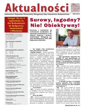 Informator Kujawsko-Pomorskiej Okręgowej Izby Inżynierów Budownictwa Uwaga! Na str. 4 zaproszenia na Dni Budowlanych do Bydgoszczy, Inowrocławia i Włocławka WŁADZE KONTAKTY Biuro KUP OIIB, 85-030 Bydgoszcz, ul. B. Rumińskiego 6 (Dom Technika), tel. (52) 366 70 50, fax 366 70 59., e-mail: [email protected] www.kup.piib.org.pl Biuro Izby pracuje w godzinach: Pon. 700-1500 Wt. 900-1700 Śr. 800-1600 Czw. 700-1500 Pt. 700-1500 Przyjęcia interesantów w godzinach: Wt. 1000-1700 Śr. 1000-1600 Czw. 800-1400 Punkty Informacyjne Izby: 86-300 Grudziądz, ul. J. Piłsudskiego 20, tel. (56) 46 101 70, fax 46 288 44 88-100 Inowrocław, ul. Orłowska 48, tel./fax (52) 357 46 66 87-100 Toruń, ul. Piernikarska 6, tel. (56) 56 662-90-77, tel./fax 56 6629073 87-800 Włocławek, Pl. Wolności 1, tel./fax (54) 232 62 50 Punkt konsultacyjny Izby: 87-300 Brodnica, ul. Ogrodowa 12, tel. (56) 49 410 90 Dyżury członków władz: Przewodniczący Rady – poniedziałek, godz. 1400-1500 Zastępca Przewodniczącego Rady – poniedziałek, godz. 1400-1500 Przewodniczący Komisji Kwalifikacyjnej – środa, godz. 1500-1600 Sekretarz Komisji Kwalifikacyjnej – wtorek, godz. 1500-1700 Przewodniczący Sądu Dyscyplinarnego – wtorek, godz. 1500-1600 Rzecznik Odpowiedzialności Zawodowej – środa, godz. 1400-1600 Sekretarz Rady – środa, godz. 1500-1600 Skarbnik Rady – co drugi wtorek, godz. 1500-1700 W siedzibie Izby i w punktach informacyjnych dostępne są do wglądu materiały dotyczące umów FIDIC oraz zeszyty „Warunki techniczne wykonania i odbioru robót budowlanych” wydane przez Instytut Techniki Budowlanej. NR 9/2015 Surowy, łagodny? Nie! Obiektywny! Rozmowa z wieloletnim egzaminatorem kandydatów do uprawnień budowlanych w specjalności drogowej i wiceprzewodniczącym Okręgowej Komisji Kwalifikacyjnej KUP OIIB, Wojciechem Klateckim Wojciech Klatecki –– Na wstępie może przedstawmy pana, jako fachowca z branży. Wojciech Klatecki: - Jestem inżynierem budownictwa drogowego od roku 1975. Ukończyłem Technikum Kolejowe w Bydgoszczy, a następnie bydgoską Wyższą Szkołę Inżynierską. Mam uprawnienia bez ograniczeń i do projektowania, i do wykonawstwa w specjalności drogowej. Jestem egzaminatorem w Izbie od 2003 roku, członkiem Okręgowej Komisji Kwalifikacyjnej od 2006 roku, a od roku 2010 wiceprzewodniczącym tejże komisji. Po technikum pracowałem siedem lat w Oddziale Zmechanizowanych Robót Drogowych Dyrekcji Okręgowej Kolei Państwowych w Gdańsku i zaocznie studiowałem na WSI. Jeśli miałbym co nieco powiedzieć o swoim dorobku zawodowym, to jestem m.in. autorem przebudowy Magistrali Węglowej od Herbów do Tczewa i mogę powiedzieć, że przeszedłem tę trasę całą po torze w kierunku Gdańska i wdrożyłem tam opracowaną na licencji szwedzkiej metodę układania torów bezstykowych. –– Co to znaczy? WK: - To znaczy, że między rozjazdami, na odległości 10-15 km nie zobaczy pan mechanicznych połączeń szyn. Szyny są jednolite. –– Jak to się robiło? WK: - Tajemnica polegała na bardzo stabilnym przytwierdzaniu łączonych kilkusetmetrowych odcinków szyn do podkładów i bardzo dokładnym ich obsypywaniu tłuczniem na podłożu, w odpowiednich Fot. T. Kozłowski warunkach temperaturowych, a następnie zgrzewaniu tych odcinków. Dzięki temu proces wydłużenia szyn był minimalny i nie występowało zjawisko wypaczania i wyginania. –– Jako egzaminator rozpocznie Pan niedługo 25. sesję egzaminacyjną na uprawnienia budowlane. Czy może Pan, patrząc z tej perspektywy, powiedzieć mi, jaki powinien być idealny egzaminator? Surowy? WK: - Powinien być przede wszystkim obiektywny. Spoczywa na nas spora odpowiedzialność, bo dopuszczamy ludzi do wykonywania najważniejszych funkcji w zawodzie zaufania publicznego i musimy być pewni, że kandydat do tego zawodu jest wyposażony w odpowiednią do swoich zadań wiedzę i umiejętności. Surowość… ani w tym nie pomaga, ani nie przeszkadza. –– A zdarzało się Panu, że kandydat podczas egzaminu Pana zwyczajnie wkurzał i chciał go Pan jakoś specjalnie „przemaglować”? WK: - Nie, raczej starałem się zawsze ustalić stan faktyczny co do wiedzy i umiejętności kandydata. Przed ostatnimi zmianami zasad przyznawania uprawnień, mieliśmy już dość dobrze wypracowany sposób sprawdzania gotowości kandydata do zawodu, bo na podstawie złożonego dziennika praktyk mogliśmy sformułować indywidualne pytania, dotyczące właśnie tej praktyki. Czasami jednak trudno było uwolnić się od uczucia irytacji, gdy okadokończenie na str. 2. Informator Kujawsko-Pomorskiej Okręgowej Izby Inżynierów Budownictwa wrzesień 2015 dokończenie ze str. 1. zywało się, że kandydat niespecjalnie się do praktyki przykładał, stąd i jego wiedza praktyczna była, no, niezbyt głęboka. Generalnie sprawdzało się, że jeśli kandydat miał praktykę w dużych korporacjach, na dużych budowach, typu autostrada, droga ekspresowa, to i na egzaminie nie miał problemów. Jeśli praktykował w firmach mniejszych, o mniejszym dorobku, to i z wiedzą praktyczną bywało różnie. –– Podczas ostatnich sesji także? WK: - Te ostatnie były w ogóle specyficzne, bo i ustawa deregulacyjna, i nowe rozporządzenie o samodzielnych funkcjach technicznych sprzyjały takiemu poczuciu wśród niektórych kandydatów, że teraz będzie łatwiej, że uda się prześlizgnąć. Stąd i wyniki sesji były zaskakująco słabe. –– Zniknęło sito w postaci analizy praktyk na etapie kwalifikowania kandydatów do egzaminu. WK: - Dzienniki praktyk były naprawdę materiałem wspaniałym, który dawał nam dużą wiedzę o kandydacie. Teraz te zaświadczenia o odbyciu praktyk już nam takiej głębokiej wiedzy nie dają, bo opisy praktyki w załącznikach do oświadczenia opiekuna praktykanta są już bardziej uproszczone, żeby nie powiedzieć, schematyczne. Trudno więc sformułować na egzaminie ustnym pytania, 