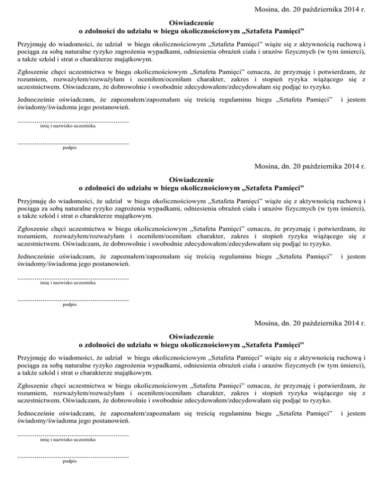 Mosina, dn. 20 października 2014 r. Oświadczenie o zdolności do udziału w biegu okolicznościowym „Sztafeta Pamięci” Przyjmuję do wiadomości, że udział w biegu okolicznościowym „Sztafeta Pamięci” wiąże się z aktywnością ruchową i pociąga za sobą naturalne ryzyko zagrożenia wypadkami, odniesienia obrażeń ciała i urazów fizycznych (w tym śmierci), a także szkód i strat o charakterze majątkowym. Zgłoszenie chęci uczestnictwa w biegu okolicznościowym „Sztafeta Pamięci” oznacza, że przyznaję i potwierdzam, że rozumiem, rozważyłem/rozważyłam i oceniłem/oceniłam charakter, zakres i stopień ryzyka wiążącego się z uczestnictwem. Oświadczam, że dobrowolnie i swobodnie zdecydowałem/zdecydowałam się podjąć to ryzyko. Jednocześnie oświadczam, że zapoznałem/zapoznałam się treścią regulaminu biegu „Sztafeta Pamięci” świadomy/świadoma jego postanowień. i jestem .......................................................... imię i nazwisko uczestnika .......................................................... podpis Mosina, dn. 20 października 2014 r. Oświadczenie o zdolności do udziału w biegu okolicznościowym „Sztafeta Pamięci” Przyjmuję do wiadomości, że udział w biegu okolicznościowym „Sztafeta Pamięci” wiąże się z aktywnością ruchową i pociąga za sobą naturalne ryzyko zagrożenia wypadkami, odniesienia obrażeń ciała i urazów fizycznych (w tym śmierci), a także szkód i strat o charakterze majątkowym. Zgłoszenie chęci uczestnictwa w biegu okolicznościowym „Sztafeta Pamięci” oznacza, że przyznaję i potwierdzam, że rozumiem, rozważyłem/rozważyłam i oceniłem/oceniłam charakter, zakres i stopień ryzyka wiążącego się z uczestnictwem. Oświadczam, że dobrowolnie i swobodnie zdecydowałem/zdecydowałam się podjąć to ryzyko. Jednocześnie oświadczam, że zapoznałem/zapoznałam się treścią regulaminu biegu „Sztafeta Pamięci” świadomy/świadoma jego postanowień. i jestem .......................................................... imię i nazwisko uczestnika .......................................................... podpis Mosina, dn. 20 października 2014 r. Oświadczenie o zdolności do udziału w biegu okolicznościowym „Sztafeta Pamięci” Przyjmuję do wiadomości, że udział w biegu okolicznościowym „Sztafeta Pamięci” wiąże się z aktywnością ruchową i pociąga za sobą naturalne ryzyko zagrożenia wypadkami, odniesienia obrażeń ciała i urazów fizycznych (w tym śmierci), a także szkód i strat o charakterze majątkowym. Zgłoszenie chęci uczestnictwa w biegu okolicznościowym „Sztafeta Pamięci” oznacza, że przyznaję i potwierdzam, że rozumiem, rozważyłem/rozważyłam i oceniłem/oceniłam charakter, zakres i stopień ryzyka wiążącego się z uczestnictwem. Oświadczam, że dobrowolnie i swobodnie zdecydowałem/zdecydowałam się podjąć to ryzyko. Jednocześnie oświadczam, że zapoznałem/zapoznałam się treścią regulaminu biegu „Sztafeta Pamięci” świadomy/świadoma jego postanowień. .......................................................... imię i nazwisko uczestnika .......................................................... podpis i jestem