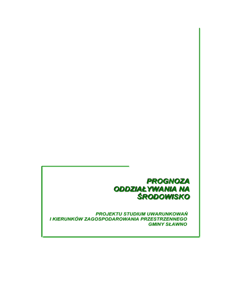 PROGNOZA ODDZIAŁYWANIA NA ŚRODOWISKO PROJEKTU STUDIUM UWARUNKOWAŃ I KIERUNKÓW ZAGOSPODAROWANIA PRZESTRZENNEGO GMINY SŁAWNO Prognoza oddziaływania na środowisko projektu Studium uwarunkowań i kierunków zagospodarowania przestrzennego gminy Sławno 2 1. WPROWADZENIE ............................................................................................................................... 4 1.1 Podstawa prawna i cel Prognozy .................................................................................................... 4 1.2 Zawartość projektu SUiKZP gminy Sławno i jego główne cele ........................................................ 4 1.3 Powiązania projektu SUiKZP gminy Sławno z innymi dokumentami.............................................. 10 1.4 Metody zastosowane przy sporządzaniu Prognozy ....................................................................... 12 2. ANALIZA ISTNIEJĄCEGO STANU ŚRODOWISKA NA TERENIE GMINY SŁAWNO ......................... 12 2.1 Ogólna charakterystyka gminy ..................................................................................................... 12 2.2 Stan gleb ..................................................................................................................................... 15 2.3 Zasoby i ocena jakosci wód podziemnych .................................................................................... 16 2.4 Zasoby i ocena jakości wód powierzchniowych ............................................................................ 18 2.5 Ocena jakości powietrza .............................................................................................................. 18 2.6 Hałas i promieniowanie elektromagnetyczne ................................................................................ 20 2.7 Walory przyrodnicze i krajobrazowe ............................................................................................. 21 2.8 Walory kulturowe ......................................................................................................................... 23 3. PROBLEMY OCHRONY ŚRODOWISKA NA TERENIE GMINY SŁAWNO ISTOTNE Z PUNKTU WIDZENIA REALIZACJI PROJEKTU SUiKZP GMINY ............................................................ 23 4. CELE OCHRONY ŚRODOWISKA USTANOWIONE NA SZCZEBLU MIĘDZYNARODOWYM, WSPÓLNOTOWYM I KRAJOWYM, ISTOTNE DLA SUiKZP GMINY SŁAWNO ORAZ ZAKRES I SPOSOBY ICH UWZGLĘDNIENIA W STUDIUM ................................................................................. 26 5. IDENTYFIKACJA, ANALIZA I OCENA ODDZIAŁYWANIA PROJEKTOWANEGO ZAGOSPODAROWANIA TERENU NA ŚRODOWISKO ......................................................................... 27 5.1 RóŜnorodność biologiczna ........................................................................................................... 27 5.2 Ludzie ......................................................................................................................................... 28 5.3 Zwierzęta .................................................................................................................................... 30 5.4 Rośliny ........................................................................................................................................ 31 5.5 Wody powierzchniowe i podziemne ............................................................................................. 31 5.6 Powietrze .................................................................................................................................... 32 5.7 Powierzchnia ziemi ...................................................................................................................... 34 5.8 Krajobraz ..................................................................................................................................... 35 5.9 Klimat .......................................................................................................................................... 35 5.10 Zasoby naturalne ......................................................................................................................... 36 5.11 Zabytki i dobra materialne............................................................................................................ 37 6. PROPOZYCJE ROZWIĄZAŃ SŁUśĄCYCH ZAPOBIEGANIU, OGRANICZANIU LUB KOMPENSACJI PRZYRODNICZEJ NEGATYWNYCH ODDZIAŁYWAŃ NA ŚRODOWISKO BĘDĄCYCH REZULTATEM REALIZACJI PROJEKTU SUIKZP GMINY SŁAWNO................................. 38 7. ROZWIĄZANIA ALTERNATYWNE DO ROZWIĄZAŃ ZAPROPONOWANYCH W PROJEKCIE SUIKZP GMINY SŁAWNO ................................................................................................ 39 Prognoza oddziaływania na środowisko projektu Studium uwarunkowań i kierunków zagospodarowania przestrzennego gminy Sławno 3 8. POTENCJALNE ZMIANY STANU ŚRODOWISKA W PRZYPADKU BRAKU REALIZACJI PROJEKTU SUiKZP GMINY SŁAWNO .................................................................................................. 40 9. NIEDOSTATKI I BRAKI MATERIAŁÓW UTRUDNIAJĄCE OCENĘ ODDZIAŁYWANIA NA ŚRODOWISKO USTALEŃ PROJEKTU SUIKZP GMINY SŁAWNO ....................................................... 41 10. ODDZIAŁYWANIE TRANSGRANICZNE ZWIĄZANE Z REALIZACJĄ PROJEKTU SUIKZP GMINY SŁAWNO .................................................................................................................................. 41 11. ANALIZA SKUTKÓW REALIZACJI POSTANOWIEŃ PROJEKTOWANEGO DOKUMENTU ORAZ CZĘSTOTLIWOŚĆ JEJ PRZEPROWADZANIA........................................................................... 42 12. STRESZCZENIE W JĘZYKU NIESPECJALISTYCZNYM ................................................................. 42 13. KIERUNKI ZAGOSPODAROWANIA PRZESTRZENNEGO GMINY SŁAWNO - ZAŁĄCZNIK GRFICZNY ...................................................................................