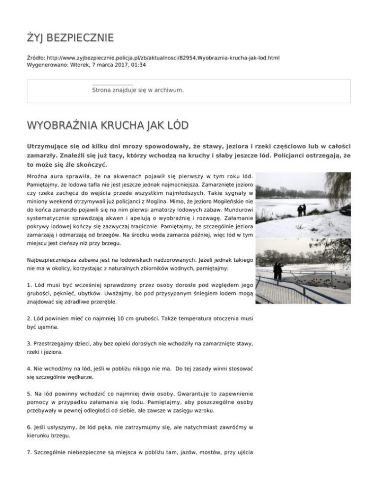 ŻYJ BEZPIECZNIE Źródło: http://www.zyjbezpiecznie.policja.pl/zb/aktualnosci/82954,Wyobraznia-krucha-jak-lod.html Wygenerowano: Wtorek, 7 marca 2017, 01:34 Strona znajduje się w archiwum. WYOBRAŹNIA KRUCHA JAK LÓD Utrzymujące się od kilku dni mrozy spowodowały, że stawy, jeziora i rzeki częściowo lub w całości zamarzły. Znaleźli się już tacy, którzy wchodzą na kruchy i słaby jeszcze lód. Policjanci ostrzegają, że to może się źle skończyć. Mroźna aura sprawiła, że na akwenach pojawił się pierwszy w tym roku lód. Pamiętajmy, że lodowa tafla nie jest jeszcze jednak najmocniejsza. Zamarznięte jezioro czy rzeka zachęca do wejścia przede wszystkim najmłodszych. Takie sygnały w miniony weekend otrzymywali już policjanci z Mogilna. Mimo, że Jezioro Mogileńskie nie do końca zamarzło pojawili się na nim pierwsi amatorzy lodowych zabaw. Mundurowi systematycznie sprawdzają akwen i apelują o wyobraźnię i rozwagę. Załamanie pokrywy lodowej kończy się zazwyczaj tragicznie. Pamiętajmy, że szczególnie jeziora zamarzają i odmarzają od brzegów. Na środku woda zamarza później, więc lód w tym miejscu jest cieńszy niż przy brzegu. Najbezpieczniejsza zabawa jest na lodowiskach nadzorowanych. Jeżeli jednak takiego nie ma w okolicy, korzystając z naturalnych zbiorników wodnych, pamiętajmy: 1. Lód musi być wcześniej sprawdzony przez osoby dorosłe pod względem jego grubości, pęknięć, ubytków. Uważajmy, bo pod przysypanym śniegiem lodem mogą znajdować się zdradliwe przeręble. 2. Lód powinien mieć co najmniej 10 cm grubości. Także temperatura otoczenia musi być ujemna. 3. Przestrzegajmy dzieci, aby bez opieki dorosłych nie wchodziły na zamarznięte stawy, rzeki i jeziora. 4. Nie wchodźmy na lód, jeśli w pobliżu nikogo nie ma. Do tej zasady winni stosować się szczególnie wędkarze. 5. Na lód powinny wchodzić co najmniej dwie osoby. Gwarantuje to zapewnienie pomocy w przypadku załamania się lodu. Pamiętajmy, aby poszczególne osoby przebywały w pewnej odległości od siebie, ale zawsze w zasięgu wzroku. 6. Jeśli usłyszymy, że lód pęka, nie zatrzymujmy się, ale natychmiast zawróćmy w kierunku brzegu. 7. Szczególnie niebezpieczne są miejsca w pobliżu tam, jazów, mostów, przy ujścia rzek i kanałów. Uwaga! Gdy załamie się lód: 1. Jeśli widzisz, że pod kimś załamał się lód, w miarę możliwości przed rozpoczęciem akcji ratunkowej wezwij pomoc dzwoniąc na telefon alarmowy: 997 lub 112. 2. Należy zachować spokój i nie wpadać w panikę. Jeśli na miejscu są inne osoby zapewnij sobie ich pomoc. 3. Ratując osobę, pod którą załamał się lód najlepiej jest podczołgać się do niej. Nie biegnijmy, gdyż może to spowodować dalsze załamywanie się lodu. 4. Osoba tonąca nie powinna wykonywać gwałtownych ruchów. Najlepiej w takim przypadku położyć się płasko, rozłożyć szeroko ręce i starać się wsunąć na lód. Jeżeli to się udało, to dalej należy poruszać się w kierunku brzegu leżąc cały czas na lodzie. Jeżeli na miejscu są osoby ratujące należy stosować się do ich wskazówek. 5. Do ratowania wykorzystajmy rzeczy będące w zasięgu ręki, np. długi szalik czy gałąź. Ostrożnie podajmy poszkodowanemu drugi koniec i bezpiecznie wyciągnijmy na lód. 6. Pamiętajmy, że człowiek w lodowatej wodzie może przeżyć tylko kilka minut. Uratowanego należy natychmiast przenieść do suchego i ciepłego pomieszczenia. Najlepiej zmienić mu ubranie i okryć kocami. Należy również ocenić jego stan i wezwać lekarza. (KWP w Bydgoszczy / pt) Ocena: 5/5 (1) Tweetnij niebezpieczny lód