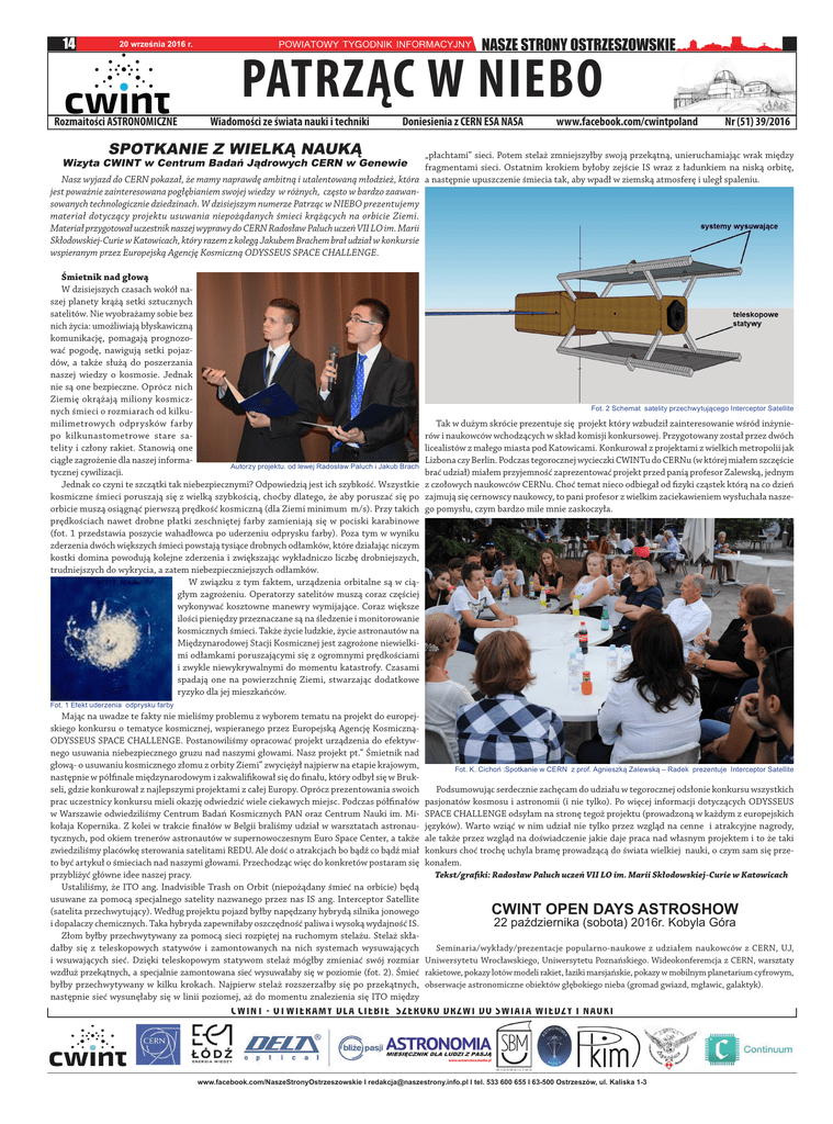 14 20 września 2016 r. Rozmaitości ASTRONOMICZNE PATRZĄC W NIEBO Wiadomości ze świata nauki i techniki Doniesienia z CERN ESA NASA www.facebook.com/cwintpoland Nr (51) 39/2016 SPOTKANIE Z WIELKĄ NAUKĄ „płachtami” sieci. Potem stelaż zmniejszyłby swoją przekątną, unieruchamiając wrak między fragmentami sieci. Ostatnim krokiem byłoby zejście IS wraz z ładunkiem na niską orbitę, Nasz wyjazd do CERN pokazał, że mamy naprawdę ambitną i utalentowaną młodzież, która a następnie upuszczenie śmiecia tak, aby wpadł w ziemską atmosferę i uległ spaleniu. Wizyta CWINT w Centrum Badań Jądrowych CERN w Genewie jest poważnie zainteresowana pogłębianiem swojej wiedzy w różnych, często w bardzo zaawansowanych technologicznie dziedzinach. W dzisiejszym numerze Patrząc w NIEBO prezentujemy materiał dotyczący projektu usuwania niepożądanych śmieci krążących na orbicie Ziemi. Materiał przygotował uczestnik naszej wyprawy do CERN Radosław Paluch uczeń VII LO im. Marii Skłodowskiej-Curie w Katowicach, który razem z kolegą Jakubem Brachem brał udział w konkursie wspieranym przez Europejską Agencję Kosmiczną ODYSSEUS SPACE CHALLENGE. Śmietnik nad głową W dzisiejszych czasach wokół naszej planety krążą setki sztucznych satelitów. Nie wyobrażamy sobie bez nich życia: umożliwiają błyskawiczną komunikację, pomagają prognozować pogodę, nawigują setki pojazdów, a także służą do poszerzania naszej wiedzy o kosmosie. Jednak nie są one bezpieczne. Oprócz nich Ziemię okrążają miliony kosmicznych śmieci o rozmiarach od kilkumilimetrowych odprysków farby po kilkunastometrowe stare satelity i człony rakiet. Stanowią one ciągłe zagrożenie dla naszej informaAutorzy projektu. od lewej Radosław Paluch i Jakub Brach tycznej cywilizacji. Jednak co czyni te szczątki tak niebezpiecznymi? Odpowiedzią jest ich szybkość. Wszystkie kosmiczne śmieci poruszają się z wielką szybkością, choćby dlatego, że aby poruszać się po orbicie muszą osiągnąć pierwszą prędkość kosmiczną (dla Ziemi minimum m/s). Przy takich prędkościach nawet drobne płatki zeschniętej farby zamieniają się w pociski karabinowe (fot. 1 przedstawia poszycie wahadłowca po uderzeniu odprysku farby). Poza tym w wyniku zderzenia dwóch większych śmieci powstają tysiące drobnych odłamków, które działając niczym kostki domina powodują kolejne zderzenia i zwiększając wykładniczo liczbę drobniejszych, trudniejszych do wykrycia, a zatem niebezpieczniejszych odłamków. W związku z tym faktem, urządzenia orbitalne są w ciągłym zagrożeniu. Operatorzy satelitów muszą coraz częściej wykonywać kosztowne manewry wymijające. Coraz większe ilości pieniędzy przeznaczane są na śledzenie i monitorowanie kosmicznych śmieci. Także życie ludzkie, życie astronautów na Międzynarodowej Stacji Kosmicznej jest zagrożone niewielkimi odłamkami poruszającymi się z ogromnymi prędkościami i zwykle niewykrywalnymi do momentu katastrofy. Czasami spadają one na powierzchnię Ziemi, stwarzając dodatkowe ryzyko dla jej mieszkańców. Fot. 2 Schemat satelity przechwytującego Interceptor Satellite Tak w dużym skrócie prezentuje się projekt który wzbudził zainteresowanie wśród inżynierów i naukowców wchodzących w skład komisji konkursowej. Przygotowany został przez dwóch licealistów z małego miasta pod Katowicami. Konkurował z projektami z wielkich metropolii jak Lizbona czy Berlin. Podczas tegorocznej wycieczki CWINTu do CERNu (w której miałem szczęście brać udział) miałem przyjemność zaprezentować projekt przed panią profesor Zalewską, jednym z czołowych naukowców CERNu. Choć temat nieco odbiegał od fizyki cząstek którą na co dzień zajmują się cernowscy naukowcy, to pani profesor z wielkim zaciekawieniem wysłuchała naszego pomysłu, czym bardzo mile mnie zaskoczyła. Fot. 1 Efekt uderzenia odprysku farby Mając na uwadze te fakty nie mieliśmy problemu z wyborem tematu na projekt do europejskiego konkursu o tematyce kosmicznej, wspieranego przez Europejską Agencję KosmicznąODYSSEUS SPACE CHALLENGE. Postanowiliśmy opracować projekt urządzenia do efektywnego usuwania niebezpiecznego gruzu nad naszymi głowami. Nasz projekt pt.” Śmietnik nad głową- o usuwaniu kosmicznego złomu z orbity Ziemi” zwyciężył najpierw na etapie krajowym, następnie w półfinale międzynarodowym i zakwalifikował się do finału, który odbył się w Brukseli, gdzie konkurował z najlepszymi projektami z całej Europy. Oprócz prezentowania swoich prac uczestnicy konkursu mieli okazję odwiedzić wiele ciekawych miejsc. Podczas półfinałów w Warszawie odwiedziliśmy Centrum Badań Kosmicznych PAN oraz Centrum Nauki im. Mikołaja Kopernika. Z kolei w trakcie finałów w Belgii braliśmy udział w warsztatach astronautycznych, pod okiem trenerów astronautów w supernowoczesnym Euro Space Center, a także zwiedziliśmy placówkę sterowania satelitami REDU. Ale dość o atrakcjach bo bądź co bądź miał to być artykuł o śmieciach nad naszymi głowami. Przechodząc więc do konkretów postaram się przybliżyć główne idee naszej pracy. Ustaliliśmy, że ITO ang. Inadvisible Trash on Orbit (niepożądany śmieć na orbicie) będą usuwane za pomocą specjalnego satelity nazwanego przez nas IS ang. Interceptor Satellite (satelita przechwytujący). Według projektu pojazd byłby napędzany hybrydą silnika jonowego i dopalaczy chemicznych. Taka hybryda zapewniłaby oszczędność paliwa i wysoką wydajność IS. Złom byłby przechwytywany za pomocą sieci rozpiętej na ruchomym stelażu. Stelaż składałby się z teleskopowych statywów i zamontowanych na nich systemach wysuwających i wsuwających sieć. Dzięki teleskopowym statywom stelaż mógłby zmieniać swój rozmiar wzdłuż przekątnych, a specjalnie zamontowana sieć wysuwałaby się w poziomie (fot. 2). Śmieć byłby przechwytywany 