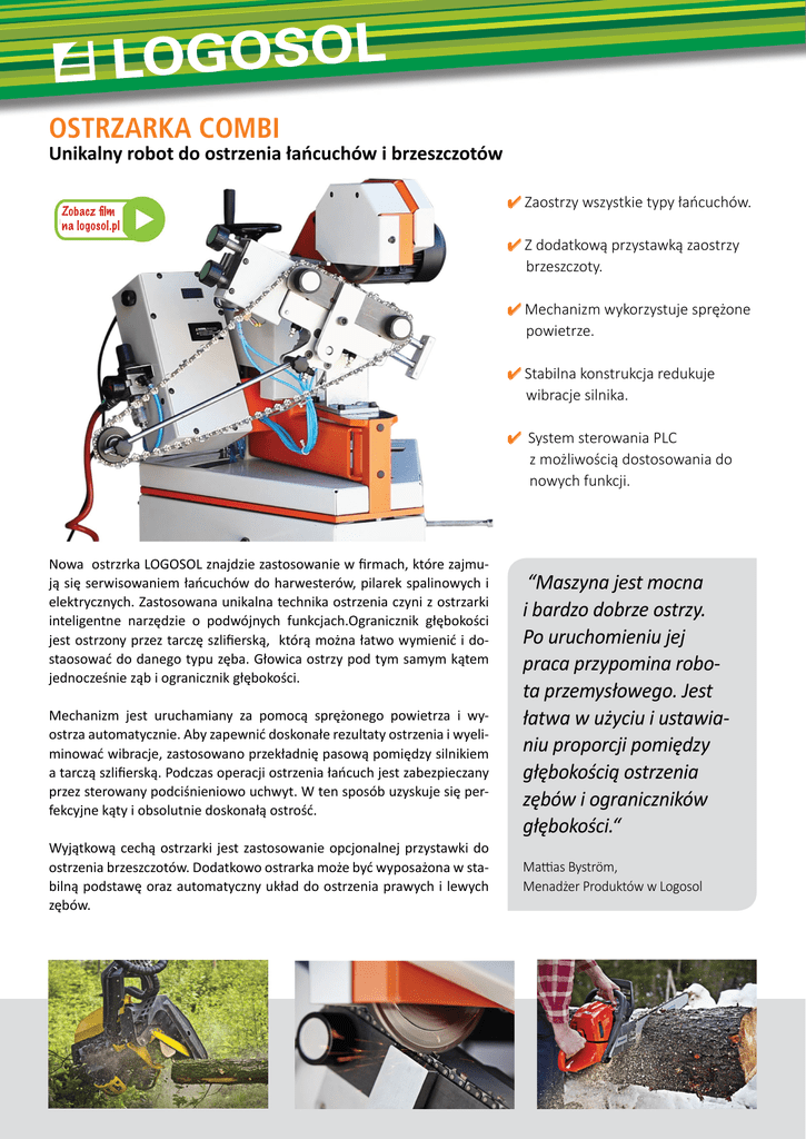 OSTRZARKA COMBI Unikalny robot do ostrzenia łańcuchów i brzeszczotów Zobacz film na logosol.pl 4 Zaostrzy wszystkie typy łańcuchów. 4 Z dodatkową przystawką zaostrzy brzeszczoty. 4 Mechanizm wykorzystuje sprężone powietrze. 4 Stabilna konstrukcja redukuje wibracje silnika. 4 System sterowania PLC z możliwością dostosowania do nowych funkcji. Nowa ostrzrka LOGOSOL znajdzie zastosowanie w firmach, które zajmują się serwisowaniem łańcuchów do harwesterów, pilarek spalinowych i elektrycznych. Zastosowana unikalna technika ostrzenia czyni z ostrzarki inteligentne narzędzie o podwójnych funkcjach.Ogranicznik głębokości jest ostrzony przez tarczę szlifierską, którą można łatwo wymienić i dostaosować do danego typu zęba. Głowica ostrzy pod tym samym kątem jednocześnie ząb i ogranicznik głębokości. Mechanizm jest uruchamiany za pomocą sprężonego powietrza i wyostrza automatycznie. Aby zapewnić doskonałe rezultaty ostrzenia i wyeliminować wibracje, zastosowano przekładnię pasową pomiędzy silnikiem a tarczą szlifierską. Podczas operacji ostrzenia łańcuch jest zabezpieczany przez sterowany podciśnieniowo uchwyt. W ten sposób uzyskuje się perfekcyjne kąty i obsolutnie doskonałą ostrość. Wyjątkową cechą ostrzarki jest zastosowanie opcjonalnej przystawki do ostrzenia brzeszczotów. Dodatkowo ostrarka może być wyposażona w stabilną podstawę oraz automatyczny układ do ostrzenia prawych i lewych zębów. “Maszyna jest mocna i bardzo dobrze ostrzy. Po uruchomieniu jej praca przypomina robota przemysłowego. Jest łatwa w użyciu i ustawianiu proporcji pomiędzy głębokością ostrzenia zębów i ograniczników głębokości.“ Mattias Byström, Menadżer Produktów w Logosol Zasilanie 230 V, 50 Hz (możliwe inne napięcia) Zapotrzebowania na sprężone powietrze Waga 6 barów / R szybkozączka 1/4’’ 70 kg GWARANCJA 2 LATA A Aa Gw R Zakup urządzeń aRRSSgG Ara Logosol jest bezpieczny. LLLO L Udzielamy dwuletniej O OG GO G OSS O gwarancji na nasze maszyny. Gwarancja obejmuje wady produkcyjne oraz usterki powstałe podczas normalnej eksploatacji maszyn. Gwarancją nie są objęte uszkodzenia powstałe na wskutek naturalnego zużycia części takich jak paski napędowe, łańcuchy, prowadnice, linki, noże, tarcze ścierne. L Elektryczny pneumatyczny 0.25kW, częstotliwość kontrolowana W pełni automatyczne 30o 0-30o, automatyczne ustawianie w lewo i prawo Standard 1/4, 325, 3/8, 404 1-3 mm cI ji NnT Napęd Silnik Sterowanie Kąt nachylenia Katy ostrzenia Typ łańcucha Obsługiwane podziałki Obsługiwane grubości 2 2laÅ t Dane Techniczne 60 dn 2 iÅ iIędzy NnT GWARANCJA ZWROTU PIENIĘDZY rGoAtRApie ZRwS L 60-cio dniowa gwarancja LLO L OG zwrotu pieniędzy GO S SO na wszystkie maszyny daje możliwość wypróbowania maszyny i określenie czy spełnia Twoje oczekiwania, zanim podejmiesz końcową decyzję. Łańcuchy, prowadnice, noże proste i profilujące, oraz inne tego typu akcesoria nie są objęte gwarancją zwrotu. 4 Grubość ogniw 4 Podziałka łańcucha 4 Głębokość ostrzenia ogranicznika 4 Ilość ostrzenia zęba 4 Sprężonego powietrza 4 Ilość zębów 3.0 mm 4.0 mm 4.0 mm 3.0 mm (mniejsza średnica) 5.0 mm 5.5 mm Wszystkie tarcze ścierne dostępne są w gradacjach grubej, średniej lub drobnej. GLOBALNY SERWIS ieGtAecRhAn rRcS Twój lokalny dystrybutor zajmuje się obsługą posprzedażnej w Twoim LLOO L G OS G SO kraju. Części zamienne i wyposażenie są dostarczane z magazynu centralnego lub Twojego lokalnego dystrybutora. cIzne NiT 4 Głębokość ostrzenia zęba 1/4’’ .325’’ 3/8’’ 3/8’’ niski profil .404’’ .404’’ Stihl Rmhs Tarcza L (z lub bez obracania głowicy) Tarcze CBN Typ łańcucha ws2pa Å Opcje ustawień: KONTAKT Z NAMI: Logosol AB Tel: +46 611 18285 Fax: +46 611 18289 e-mail: [email protected] Zobacz film o ostrzarce Combi na stronie www.logosol.pl