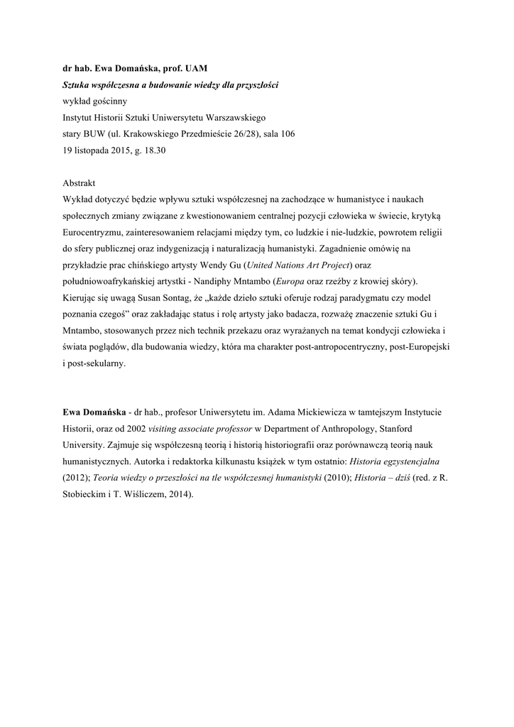 dr hab. Ewa Domańska, prof. UAM Sztuka współczesna a budowanie wiedzy dla przyszłości wykład gościnny Instytut Historii Sztuki Uniwersytetu Warszawskiego stary BUW (ul. Krakowskiego Przedmieście 26/28), sala 106 19 listopada 2015, g. 18.30 Abstrakt Wykład dotyczyć będzie wpływu sztuki współczesnej na zachodzące w humanistyce i naukach społecznych zmiany związane z kwestionowaniem centralnej pozycji człowieka w świecie, krytyką Eurocentryzmu, zainteresowaniem relacjami między tym, co ludzkie i nie-ludzkie, powrotem religii do sfery publicznej oraz indygenizacją i naturalizacją humanistyki. Zagadnienie omówię na przykładzie prac chińskiego artysty Wendy Gu (United Nations Art Project) oraz południowoafrykańskiej artystki - Nandiphy Mntambo (Europa oraz rzeźby z krowiej skóry). Kierując się uwagą Susan Sontag, że „każde dzieło sztuki oferuje rodzaj paradygmatu czy model poznania czegoś” oraz zakładając status i rolę artysty jako badacza, rozważę znaczenie sztuki Gu i Mntambo, stosowanych przez nich technik przekazu oraz wyrażanych na temat kondycji człowieka i świata poglądów, dla budowania wiedzy, która ma charakter post-antropocentryczny, post-Europejski i post-sekularny. Ewa Domańska - dr hab., profesor Uniwersytetu im. Adama Mickiewicza w tamtejszym Instytucie Historii, oraz od 2002 visiting associate professor w Department of Anthropology, Stanford University. Zajmuje się współczesną teorią i historią historiografii oraz porównawczą teorią nauk humanistycznych. Autorka i redaktorka kilkunastu książek w tym ostatnio: Historia egzystencjalna (2012); Teoria wiedzy o przeszłości na tle współczesnej humanistyki (2010); Historia – dziś (red. z R. Stobieckim i T. Wiśliczem, 2014).
