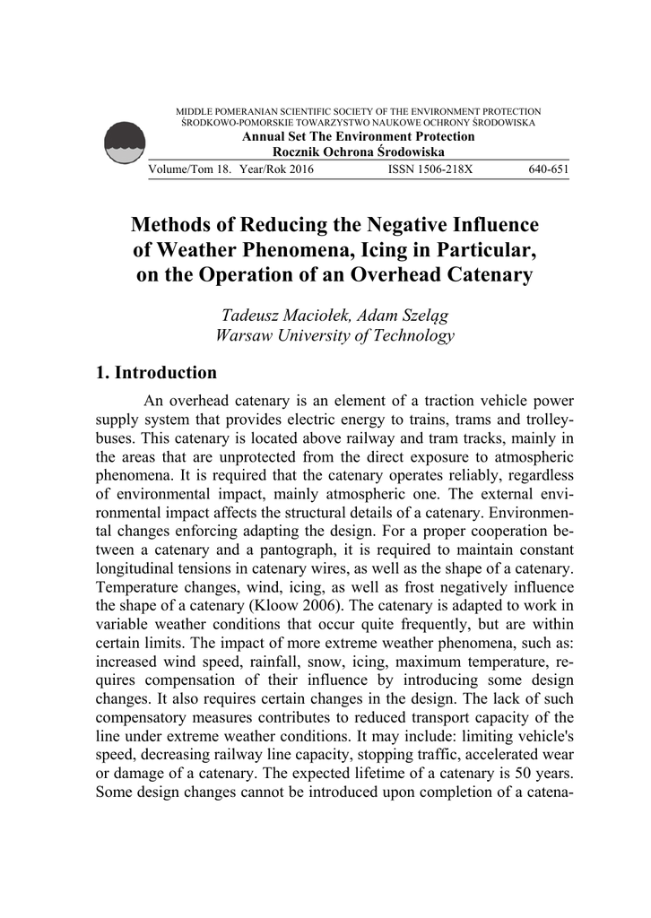 MIDDLE POMERANIAN SCIENTIFIC SOCIETY OF THE ENVIRONMENT PROTECTION ŚRODKOWO-POMORSKIE TOWARZYSTWO NAUKOWE OCHRONY ŚRODOWISKA Annual Set The Environment Protection Rocznik Ochrona Środowiska Volume/Tom 18. Year/Rok 2016 ISSN 1506-218X 640-651 Methods of Reducing the Negative Influence of Weather Phenomena, Icing in Particular, on the Operation of an Overhead Catenary Tadeusz Maciołek, Adam Szeląg Warsaw University of Technology 1. Introduction An overhead catenary is an element of a traction vehicle power supply system that provides electric energy to trains, trams and trolleybuses. This catenary is located above railway and tram tracks, mainly in the areas that are unprotected from the direct exposure to atmospheric phenomena. It is required that the catenary operates reliably, regardless of environmental impact, mainly atmospheric one. The external environmental impact affects the structural details of a catenary. Environmental changes enforcing adapting the design. For a proper cooperation between a catenary and a pantograph, it is required to maintain constant longitudinal tensions in catenary wires, as well as the shape of a catenary. Temperature changes, wind, icing, as well as frost negatively influence the shape of a catenary (Kloow 2006). The catenary is adapted to work in variable weather conditions that occur quite frequently, but are within certain limits. The impact of more extreme weather phenomena, such as: increased wind speed, rainfall, snow, icing, maximum temperature, requires compensation of their influence by introducing some design changes. It also requires certain changes in the design. The lack of such compensatory measures contributes to reduced transport capacity of the line under extreme weather conditions. It may include: limiting vehicle's speed, decreasing railway line capacity, stopping traffic, accelerated wear or damage of a catenary. The expected lifetime of a catenary is 50 years. Some design changes cannot be introduced upon completion of a catena- 641 Methods of Reducing the Negative Influence… ry, e.g. the distance between supporting structures. Therefore, it is required to predict possible climate changes in a given area for many years in advance. 2. Compensating the influence of wind and temperature Increases in maximum temperatures, as well as maximum wind speed require adjusting a catenary to new boundary operating conditions. It does not entail significant design changes, but it has influence on some parameters of a structure. In practice, compensating the influence of these changes leads to increased costs of catenary construction and operation. Wind speed, which will affect the catenary, and at which traffic operation is planned, influences distance between supporting structures – poles. In most cases, it directly affects the distance in a proportionate manner. Since the supporting structures are the basic component of catenary costs, the number of these structures is a key component in catenary construction costs. V2 V1 U a2 a1 U – permissible instantaneous deviation of a catenary from a track axis V – maximum permissible wind speed a – distance required between the poles for mounting a catenary Fig. 1. Distance between catenary poles depending on wind speed Rys. 1. Odległość między słupami sieci trakcyjnej w zależności od prędkości wiatru a= k ⋅U V where: k – fixed factor characteristic for a given structure of a catenary. (1) 642 Tadeusz Maciołek, Adam Szeląg The ambient temperature affects the distance of catenary wires. Changes of temperature require length compensation in order to maintain the shape of a catenary. Increase in maximum ambient temperature associated with climate changes forces structural changes. In order to ensure fixed tension of a catenary, which assures its stable shape, it is required to use complex structures called a tension span every 1.3 km. Higher values of maximum temperatures and a larger range of temperature changes in the period of several decades force an increase in the number of tension spans on a given line. It also influences investment costs. 3. Icing and frost of a catenary Such phenomena are quite often in Poland between autumn and spring. However, they are considerably rare and short-term on railway or tram lines. As a result, one does not implement system type solutions for the problem of icing on all the lines with a catenary. Apart from extreme cases of icing, e.g. in Slovenia (Segrate 2014), damages to a catenary structure are a very rare phenomenon. This is due to the fact that the catenary is characterised by a high resistance to load increase caused by icing. However, in such a state the normal use of a catenary is not possible. Upon removing the icing, the catenary resumes its original condition. The problems occur if the catenary is exploited under such conditions. Layer of icing or frost is a form of isolation for a current flow and is a reason for the appearance of an electric arc during a current flow (Koclęga 2010). Before resuming normal operation, it is required to remove icing or frost. In Poland, a train ride with a current flow or mechanical removal from a servicing train is implemented as a solution. 3.1. Removing icing from a catenary during train passage With a small amount of frost accumulated on contact wires, a locomotive or a tram rides with a raised pantograph. Such ride causes a contact gap and appearance of an electric arc between a vehicle pantograph and catenary wire (Haag 2010, Heyun 2012, Jarzębowicz 2014, Kloow 2006). Then, an accelerated wear of contact strips of pantographs and wires occurs (Mizan 2013, Karwowski 2015). It is caused by local damages to the surface of wires and contact strips. Such situation poses a risk of burning pantograph sliding plates and damaging a catenary (Maciołek 2014). Provisions of the TSI allow occurrence of contact gaps Methods of Reducing the Negative Influence… 643 in a very narrow scope and only at 