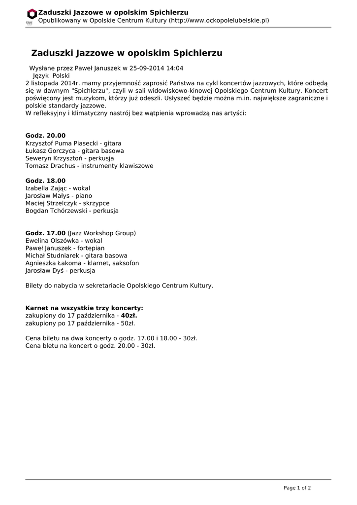 Zaduszki Jazzowe w opolskim Spichlerzu Opublikowany w Opolskie Centrum Kultury (http://www.ockopolelubelskie.pl) Zaduszki Jazzowe w opolskim Spichlerzu Wysłane przez Paweł Januszek w 25-09-2014 14:04 Język Polski 2 listopada 2014r. mamy przyjemność zaprosić Państwa na cykl koncertów jazzowych, które odbędą się w dawnym "Spichlerzu", czyli w sali widowiskowo-kinowej Opolskiego Centrum Kultury. Koncert poświęcony jest muzykom, którzy już odeszli. Usłyszeć będzie można m.in. największe zagraniczne i polskie standardy jazzowe. W refleksyjny i klimatyczny nastrój bez wątpienia wprowadzą nas artyści: Godz. 20.00 Krzysztof Puma Piasecki - gitara Łukasz Gorczyca - gitara basowa Seweryn Krzysztoń - perkusja Tomasz Drachus - instrumenty klawiszowe Godz. 18.00 Izabella Zając - wokal Jarosław Małys - piano Maciej Strzelczyk - skrzypce Bogdan Tchórzewski - perkusja Godz. 17.00 (Jazz Workshop Group) Ewelina Olszówka - wokal Paweł Januszek - fortepian Michał Studniarek - gitara basowa Agnieszka Łakoma - klarnet, saksofon Jarosław Dyś - perkusja Bilety do nabycia w sekretariacie Opolskiego Centrum Kultury. Karnet na wszystkie trzy koncerty: zakupiony do 17 października - 40zł. zakupiony po 17 października - 50zł. Cena biletu na dwa koncerty o godz. 17.00 i 18.00 - 30zł. Cena bletu na koncert o godz. 20.00 - 30zł. Page 1 of 2 Zaduszki Jazzowe w opolskim Spichlerzu Opublikowany w Opolskie Centrum Kultury (http://www.ockopolelubelskie.pl) Adres wydarzenia: ul. Lubelska 30 24-300 Opole Lubelskie Organizator: Opolskie Centrum Kultury Data wydarzenia: 02-11-2014 17:00 Adres źródłowy: http://www.ockopolelubelskie.pl/pl/wydarzenie/zaduszki-jazzowe-w-opolskim-spichlerzu Page 2 of 2 Powered by TCPDF (www.tcpdf.org)