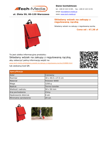Dane kontaktowe tel. +48 22 122 13 00 , fax. +48 22 122 13 01 email: [email protected] ul. Złota 59, 00-120 Warszawa www: www.tech-media.pl Składany wózek na zakupy z regulowaną rączką Składany wózek na zakupy z regulowaną rączką Cena od : 47,38 zł To jest ulotka informacyjna produktu: Składany wózek na zakupy z regulowaną rączką, aby zobaczyć pełną informację wejdź na: www.tech-media.pl/skladany,wozek,na,zakupy,z,regulowana,raczka,010880.html lub zeskanuj kod QR. Specyfikacja Kolor Czerwony Rozmiar 34 x 40,5 x 27,5 cm Materiał Poliester 600D Waga 1250 g Nadruk Termo transfer Wielkość nadruku 50 x 50 mm Kraj pochodzenia Chiny Opakowanie zbiorcze 6 szt. Minimalne zamówienie 20 szt.