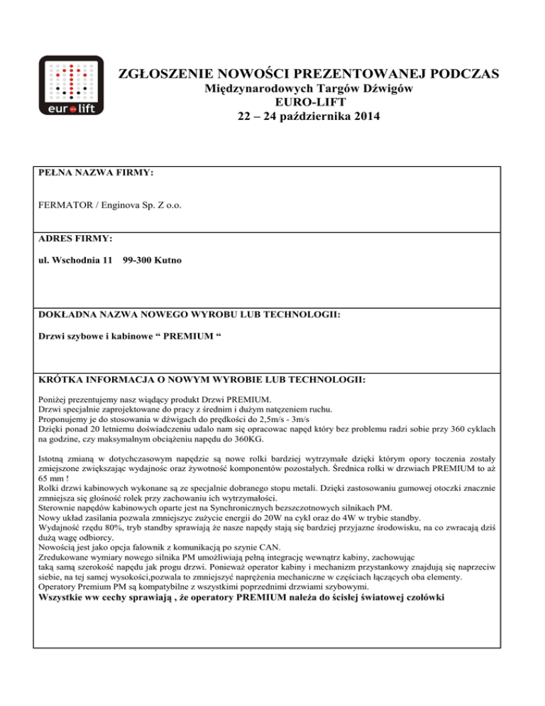 ZGŁOSZENIE NOWOŚCI PREZENTOWANEJ PODCZAS Międzynarodowych Targów Dźwigów EURO-LIFT 22 – 24 października 2014 PEŁNA NAZWA FIRMY: FERMATOR / Enginova Sp. Z o.o. ADRES FIRMY: ul. Wschodnia 11 99-300 Kutno DOKŁADNA NAZWA NOWEGO WYROBU LUB TECHNOLOGII: Drzwi szybowe i kabinowe “ PREMIUM “ KRÓTKA INFORMACJA O NOWYM WYROBIE LUB TECHNOLOGII: Poniżej prezentujemy nasz wiądący produkt Drzwi PREMIUM. Drzwi specjalnie zaprojektowane do pracy z średnim i dużym natęzeniem ruchu. Proponujemy je do stosowania w dźwigach do prędkości do 2,5m/s - 3m/s Dzięki ponad 20 letniemu doświadczeniu udalo nam się opracowac napęd który bez problemu radzi sobie przy 360 cyklach na godzine, czy maksymalnym obciążeniu napędu do 360KG. Istotną zmianą w dotychczasowym napędzie są nowe rolki bardziej wytrzymałe dzięki którym opory toczenia zostały zmiejszone zwiększając wydajnośc oraz żywotność komponentów pozostałych. Średnica rolki w drzwiach PREMIUM to aż 65 mm ! Rolki drzwi kabinowych wykonane są ze specjalnie dobranego stopu metali. Dzięki zastosowaniu gumowej otoczki znacznie zmniejsza się głośność rolek przy zachowaniu ich wytrzymałości. Sterownie napędów kabinowych oparte jest na Synchronicznych bezszczotnowych silnikach PM. Nowy układ zasilania pozwala zmniejszyc zużycie energii do 20W na cykl oraz do 4W w trybie standby. Wydajność rzędu 80%, tryb standby sprawiają że nasze napędy stają się bardziej przyjazne środowisku, na co zwracają dziś dużą wagę odbiorcy. Nowością jest jako opcja falownik z komunikacją po szynie CAN. Zredukowane wymiary nowego silnika PM umożliwiają pełną integrację wewnątrz kabiny, zachowując taką samą szerokość napędu jak progu drzwi. Ponieważ operator kabiny i mechanizm przystankowy znajdują się naprzeciw siebie, na tej samej wysokości,pozwala to zmniejszyć naprężenia mechaniczne w częściach łączących oba elementy. Operatory Premium PM są kompatybilne z wszystkimi poprzednimi drzwiami szybowymi. Wszystkie ww cechy sprawiają , że operatory PREMIUM należa do ścisłej światowej czołówki