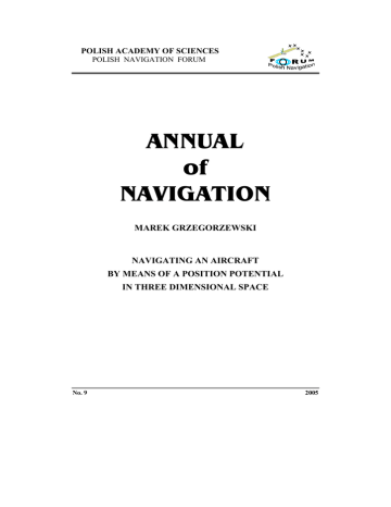 POLISH ACADEMY OF SCIENCES POLISH NAVIGATION FORUM ANNUAL of NAVIGATION MAREK GRZEGORZEWSKI NAVIGATING AN AIRCRAFT BY MEANS OF A POSITION POTENTIAL IN THREE DIMENSIONAL SPACE No. 9 2005 Programme Council Andrzej Banachowicz, Lubomir W. Baran (President), Wojciech Drozd, Andrzej Felski (Editor), Marek Grzegorzewski, Jerzy Hajduk, Guenter Hein (Germany), Michał Holec, Mirosław Jurdziński, Zdzisław Kopacz, Andrzej Macioch, Bolesław Mazurkiewicz, Stanisław Oszczak, Wojciech Pachelski, Boris Rivkin (Russia), Janusz Śledziński, Józef Urbański, Aleksander Walczak, Janusz Zieliński Edited by author Reviewers :Józef Urbański Cezary Specht Address for correspondence Instytut Nawigacji i Hydrografii Morskiej Akademia Marynarki Wojennej ul. Śmidowicza 69 81 - 103 Gdynia [email protected] Published in affiliation with the Gdańsk Branch of the Polish Academy of Sciences Citation When citing papers from this volume the following reference should be used: Author(s), Title, Annual of Navigation, No.9, 2005, Pages ……… CONTENTS INTRODUCTION.............................................................................................5 1. REVIEW OF THE LITERATURE..........................................................8 2. EN-ROUTE FLIGHTS - AIRCRAFT POSITION ACCURACY ASSESSMENT .........................................................................................10 2.1. ESTIMATION OF SU-22M-4 AIRCRAFT POSITIONING ACCURACY DURING EN-ROUTE FLIGHTS IN WGS’84 (ETRF’89) USING RTK TECHNIQUES (POWIDZ 99 EXPERIMENT)......................................................................10 2.1.1. Task description .............................................................................12 2.1.2. Selection of the reference points ...................................................12 2.1.3. Computing the co-ordinates of the reference points in ETRF ‘89 ........................................................................................12 2.1.4. Post - processing of static session results ......................................13 2.1.5. Su-22M4 aircraft position determination in the post-processing mode ...............................................................................................14 2.1.6. Analysis of observation results – 26th April, 1999 session.............14 2.1.7. Analysis of observation results – 27th April, 1999 session............18 2.2. STUDIES ON AN-2 AIRCRAFT POSITIONING ..............................................23 2.2.1 Material and methods.......................................................................23 2.2.2 Assessing the parameters of the navigation system .........................25 2.3. ACCURACY OF TS-11 ISKRA AIRCRAFT TRAJECTORY DETERMINATION DURING EN-ROUTE FLIGHTS USING RADARS AND SATELLITE NAVIGATION SYSTEMS ACCORDING TO THE “„DUNAJ”” PROGRAM (EXPERIMENT DĘBLIN 2001) ......................................................................................29 2.3.1. Assembly of receivers onboard the aircraft ....................................30 2.3.2. Experiment description ...................................................................31 2.3.3. Technical characteristics of the flight.............................................33 2.4. ACCURACY OF TS-11 ISKRA AIRCRAFT TRAJECTORY DETERMINATION DURING EN-ROUTE FLIGHTS USING RADAR PROTOTYPE AND SATELLITE NAVIGATION SYSTEMS ACCORDING TO THE “„BRDA”” PROGRAM (EXPERIMENT DĘBLIN 2001) ......................................................................................39 2.4.1. Materials and method......................................................................39 2.4.2. Schedule of the experiment..............................................................40 2.4.3. Description of the experiment .........................................................40 2.4.4. Conditions of experiment – flight No.2 ...........................................43 3 Navigating an aircraft by means of a position potential in three-dimensional space 3. APPROACH AND LANDING PHASE - AIRCRAFT POSITION ACCURACY ASSESSMENT................................................................. 47 3.1. APPROACH AND LANDING OF THE TS-11 ISKRA AIRCRAFT ..................... 50 „DUNAJ” PROJECT ......................................................................................... 50 3.2. AN-2 AIRCRAFT APPROACH ................................................................... 57 3.3. APPROACH PHASE – PROJECT „BRDA” .................................................. 58 3.4 APPROACH PHASE – PROJECT „ODRA” .................................................. 66 3.5. SATELLITE NAVIGATION TECHNIQUE UTILISATION FOR CIVILIAN AIRCRAFT LANDING PROCEDURES SUPPORT. ........................................................... 68 4. NAVIGATING BY MEANS OF A POSITON POTENTIAL IN SPACE................................................................................................. 70 INITIAL VERIFICATION OF THE MATHEMATICAL MODEL........ 90 SUMMARY:.................................................................................................... 95 BIBLIOGRAPHY........................................................................................... 96 INDEX OF FIGURES .................................................................................. 104 ABBREVIATIONS....................................................................................... 107 LIST OF FOOTNOTES............................................................................... 109 4 9/2005 Marek Grzegorzewski INTRODUCTION The end of the 20th century marked an era of extraordinary technological developments. Owing to telecommunication capabilities, intercontinental television transmissions and the Internet, the world has become smaller and we have gained a possibility of visiting our friends at their homes at any time. Thanks to satellite navigation systems we have become more precise. A miniature receiver of satellite n