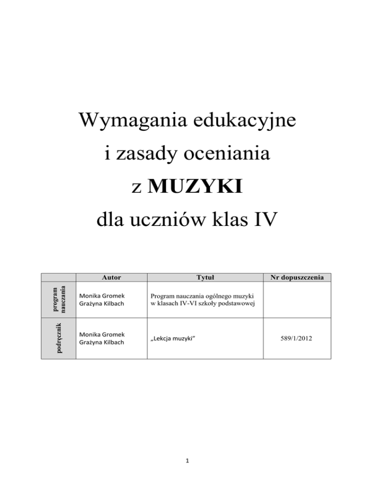 Wymagania edukacyjne i zasady oceniania z MUZYKI dla uczniów klas IV Tytuł program nauczania Monika Gromek Grażyna Kilbach Program nauczania ogólnego muzyki w klasach IV-VI szkoły podstawowej podręcznik Autor Monika Gromek Grażyna Kilbach „Lekcja muzyki” 1 Nr dopuszczenia 589/1/2012 ZASADY OCENIANIA 1. Podstawą oceny semestralnej i rocznej jest praca i aktywnośd na lekcjach muzyki. 2. Uczeo jest oceniany na podstawie pisemnych sprawdzianów, ustnych odpowiedzi i prac domowych. 3. W ocenie z muzyki nauczyciel uwzględnia udział uczniów w imprezach artystycznych odbywających się na terenie szkoły i poza nią. 4. W trakcie semestru uczeo może, bez podania przyczyny, zgłosid dwa razy nieprzygotowanie. 5. Uczeo ma prawo poprawiad ocenę ze sprawdzianu w ciągu tygodnia od jego oddania w terminie ustalonym z nauczycielem. 2 muzyka klasa IV WYMAGANIA EDUKACYJNE Skala ocen Kryteria oceniania wiedzy i umiejętności celujący Uczeo aktywnie uczestniczy w zajęciach, wyróżnia się swoją postawą i zaangażowaniem, przejawia szczególne zainteresowania muzyką, wykazuje się twórczą inicjatywą w działaniach grupowych, śmiało wyraża swoje zdanie na temat upodobao artystycznych, bierze udział w konkursach muzycznych oraz aktywnie uczestniczy w życiu kulturalnym szkoły. Uczeo opanował w stopniu całkowitym program nauczania i wykazuje dużą znajomośd treści ponadprogramowych: - śpiewa z zachowaniem wszystkich zasad poznane pieśni i piosenki indywidualnie i w grupie - zna i rozróżnia brzmienie instrumentów perkusyjnych - zna polskie taoce, stroje i obrzędy ludowe, potrafi zataoczyd podstawowe kroki tych taoców - gra na instrumentach perkusyjnych akompaniament do piosenek - śpiewa proste utwory z nut, rozróżnia dźwięki i zasady ich zapisu, potrafi wykonad improwizację wokalną - gra z pamięci poznane melodie na flecie prostym, improwizuje na flecie z wykorzystaniem poznanych chwytów - rozpoznaje w słuchanym utworze muzycznym metrum, dynamikę, rodzaj głosu wokalnego, wykonuje improwizację ruchową do muzyki 3 muzyka klasa IV WYMAGANIA EDUKACYJNE bardzo dobry Uczeo aktywnie uczestniczy w zajęciach, bierze udział w dyskusjach na temat muzyki i potrafi uzasadniad swoje poglądy, chętnie podejmuje współpracę w grupie i uczestniczy w życiu kulturalnym szkoły. Uczeo opanował i wykorzystuje w praktyce wszystkie określone w programie wiadomości i umiejętności: - śpiewa z zachowaniem wszystkich zasad poznane pieśni i piosenki indywidualnie i w grupie - zna i rozróżnia brzmienie instrumentów perkusyjnych - zna polskie taoce, stroje i obrzędy ludowe, potrafi zataoczyd podstawowe kroki tych taoców - gra na instrumentach perkusyjnych akompaniament do piosenek - śpiewa proste utwory z obserwacją nut, rozróżnia dźwięki i zasady ich zapisu - gra z pamięci poznane melodie na flecie prostym - rozpoznaje w słuchanym utworze muzycznym metrum, dynamikę, rodzaj głosu wokalnego Uczeo aktywnie uczestniczy w zajęciach, potrafi wyrażad swoje zdanie na temat upodobao artystycznych, chętnie współpracuje w grupie. Uczeo stosuje w praktyce poznaną wiedzę i umiejętności: dobry - śpiewa poznane pieśni indywidualnie i w grupie - zna i rozróżnia brzmienie instrumentów perkusyjnych - zna polskie taoce, stroje i obrzędy ludowe - gra na instrumentach perkusyjnych akompaniament do piosenek - śpiewa proste utwory z obserwacją nut, zna zasady ich zapisu - gra na flecie poznane melodie w oparciu o chwyty 4 muzyka klasa IV WYMAGANIA EDUKACYJNE dostateczny Uczeo w prosty sposób wyraża swoje zdanie na temat upodobao artystycznych, umie współpracowad w grupie, przyswoił najważniejsze wiadomości i umiejętności, które próbuje stosowad w praktyce: - śpiewa poznane pieśni indywidualnie i w grupie - zna instrumenty perkusyjne - zna polskie taoce ludowe - gra na instrumentach perkusyjnych akompaniament do piosenek dopuszczający - gra na flecie poznane chwyty Uczeo umie współpracowad w grupie, opanował elementarne wiadomości, które przy pomocy nauczyciela stosuje w praktyce: - śpiewa poznane pieśni w grupie - zna instrumenty perkusyjne - zna polskie taoce ludowe 5 muzyka klasa IV niedostateczny WYMAGANIA EDUKACYJNE Uczeo jest często nieprzygotowany do lekcji, nie umie współpracowad w grupie, nie opanował nawet elementarnych wiadomości z programu nauczania. 6 muzyka klasa IV