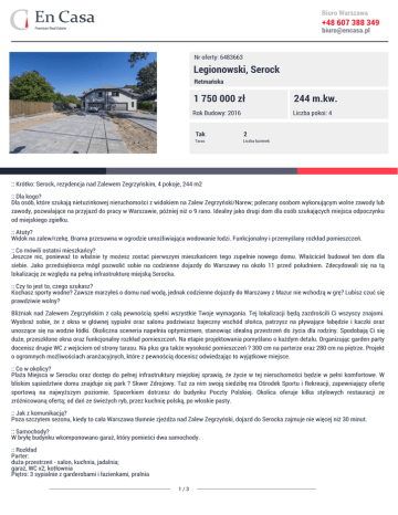Biuro Warszawa +48 607 388 349 [email protected] Nr oferty: 6483663 Legionowski, Serock Retmańska 1 750 000 zł 244 m.kw. Rok Budowy: 2016 Liczba pokoi: 4 Tak 2 Taras Liczba łazienek :: Krótko: Serock, rezydencja nad Zalewem Zegrzyńskim, 4 pokoje, 244 m2 :: Dla kogo? Dla osób, które szukają nietuzinkowej nieruchomości z widokiem na Zalew Zegrzyński/Narew; polecany osobom wykonującym wolne zawody lub zawody, pozwalające na przyjazd do pracy w Warszawie, później niż o 9 rano. Idealny jako drugi dom dla osób szukających miejsca odpoczynku od miejskiego zgiełku. :: Atuty? Widok na zalew/rzekę. Brama przesuwna w ogrodzie umożliwiająca wodowanie łodzi. Funkcjonalny i przemyślany rozkład pomieszczeń. :: Co mówili ostatni mieszkańcy? Jeszcze nic, ponieważ to właśnie ty możesz zostać pierwszym mieszkańcem tego zupełnie nowego domu. Właściciel budował ten dom dla siebie. Jako przedsiębiorca mógł pozwolić sobie na codzienne dojazdy do Warszawy na około 11 przed południem. Zdecydowali się na tą lokalizację ze względu na pełną infrastrukturę miejską Serocka. :: Czy to jest to, czego szukasz? Kochasz sporty wodne? Zawsze marzyłeś o domu nad wodą, jednak codzienne dojazdy do Warszawy z Mazur nie wchodzą w grę? Lubisz czuć się prawdziwie wolny? Bliźniak nad Zalewem Zegrzyńskim z całą pewnością spełni wszystkie Twoje wymagania. Tej lokalizacji będą zazdrościli Ci wszyscy znajomi. Wyobraź sobie, że z okna w głównej sypialni oraz salonu podziwiasz bajeczny wschód słońca, patrzysz na pływające łabędzie i kaczki oraz unoszące się na wodzie łódki. Okoliczna sceneria napełnia optymizmem, stanowiąc idealną przestrzeń do życia dla rodziny. Spodobają Ci się duże, przeszklone okna oraz funkcjonalny rozkład pomieszczeń. Na etapie projektowania pomyślano o każdym detalu. Organizując garden party docenisz drugie WC z wejściem od strony tarasu. Na plus gra także wysokość pomieszczeń ? 300 cm na parterze oraz 280 cm na piętrze. Projekt o ogromnych możliwościach aranżacyjnych, które z pewnością docenisz odwiedzając to wyjątkowe miejsce. :: Co w okolicy? Plaża Miejsca w Serocku oraz dostęp do pełnej infrastruktury miejskiej sprawią, że życie w tej nieruchomości będzie w pełni komfortowe. W bliskim sąsiedztwie domu znajduje się park ? Skwer Zdrojowy. Tuż za nim swoją siedzibę ma Ośrodek Sportu i Rekreacji, zapewniający ofertę sportową na najwyższym poziomie. Spacerkiem dotrzesz do budynku Poczty Polskiej. Okolica oferuje kilka stylowych restauracji ze zróżnicowaną ofertą; od dań ze świeżych ryb, przez kuchnię polską, po włoskie pasty. :: Jak z komunikacją? Poza szczytem sezonu, kiedy to cała Warszawa tłumnie zjeżdża nad Zalew Zegrzyński, dojazd do Serocka zajmuje nie więcej niż 30 minut. :: Samochody? W bryłę budynku wkomponowano garaż, który pomieści dwa samochody. :: Rozkład Parter: duża przestrzeń - salon, kuchnia, jadalnia; garaż, WC x2, kotłownia Piętro: 3 sypialnie z garderobami i łazienkami, pralnia 1/3 Biuro Warszawa +48 607 388 349 [email protected] Zadzwoń i dowiedz się więcej lub sprawdź inne nasze ogłoszenia: www.encasa.pl. For more details in English, please call: Piotr Wilczyński: +48 604 914 100 *******ENG******* :: Essentials: Serock, the residence of the Zegrzyński Lake, 4 rooms, 244 m2 :: Perfect for? For people who are looking for uncommon estate overlooking the Zalew Zegrzyński / Narew; recommended for people working as independent professionals or profession, allowing to come to work in Warsaw, later than 9 am. Ideal as a second home for those seeking a rest from the hustle and bustle. :: Advantages? View of the lake / river. Sliding gate from the garden allowing launching boats. Functional and well thought floor plan. :: What did the last residents say? Nothing yet, because You can be the first inhabitant of this brand new home. The owner built the house for himself. As an entrepreneur could afford a daily commute to Warsaw at about 11 am. They decided on this location because of the complete urban infrastructure of Serock. :: Is this house for you? Do you love water sports? Always dreamed of a house close to the water, but the daily commute to Warsaw from Mazury is not an option? Do you like to feel truly free? Semi-detached house at Zalew Zegrzyński Lake certainly meet all your needs. All friends will will be jealous becasue of the location. Imagine that from a window in the main bedroom and living room you admire the fabulous sunrise, look at floating swans and ducks and floating boats. The scenery is filled with optimism, making it the perfect living space for the family. You'll like large windows and functional floor plan. At the design stage every detail was thought through. While organizing a garden party You will appreciate second toilet with entrance from the terrace. On the plus side also plays ceiling height - 300 cm on the ground floor and 280 cm on the floor. The project with huge potential arrangement, which You will surely appreciate while visiting this unique place. :: What's nearby? Beach in Serock and access to the full urban infrastructure will make living in the property fully comfortable. In the immediate vicinity of the house is a park - Skwer Zdrojowy. Behind him, there is Sports and Recreation Centre, providing sports offer at the highest level. Few minute walk will take You to the building of the post office. The area offers several stylish restaurants with a diverse offer: fresh fish, the Polish cuisine, the Italian pasta. :: How about transport? Off-peak season, when the whole Warsaw comes to Zegrze, access to Serock takes no more than 30 minutes. :: Cars? In the building there is a garage which can accommodate two cars. In front of the garage You can park few more cars. :: Layout Ground floor: large space - living room, kitchen, dining room; garage, toilet x2, boiler 1st floor: 3 bedrooms with wardrobes and b