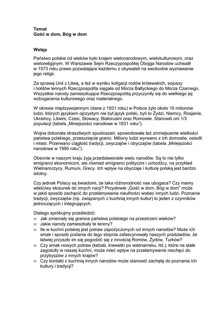 Temat Gość w dom, Bóg w dom Wstęp Państwo polskie od wieków było krajem wielonarodowym, wielokulturowym, oraz wieloreligijnym. W Warszawie Sejm Rzeczypospolitej Obojga Narodów uchwalił w 1573 roku prawo pozwalające każdemu z obywateli na swobodne wyznawanie jego religii. Za sprawą Unii z Litwą, a też w wyniku koligacji rodów królewskich, sojuszy i hołdów lennych Rzeczpospolita sięgała od Morza Bałtyckiego do Morza Czarnego. Wszystkie narody zamieszkujące Rzeczpospolitą przyczyniły się do wielkiego jej wzbogacenia kulturowego oraz materialnego. W okresie międzywojennym (dane z 1931 roku) w Polsce żyło około 10 milionów ludzi, których językiem ojczystym nie był język polski, byli to Żydzi, Niemcy, Rosjanie, Ukraińcy, Litwini, Czesi, Słowacy, Białorusini oraz Romowie. Stanowili oni 1/3 populacji (tabela „Mniejszości narodowe w 1931 roku”). Wojna dokonała straszliwych spustoszeń, spowodowała też zmniejszenie wielkości państwa polskiego, przesunięcie granic. Miliony ludzi wyrwano z ich domostw, osiedli i miast. Przerwano ciągłość tradycji, zwyczajów i obyczajów (tabela „Mniejszości narodowe w 1995 roku”). Obecnie w naszym kraju żyją przedstawiciele wielu narodów. Są to nie tylko emigranci ekonomiczni, ale również emigranci polityczni i uchodźcy, na przykład Wietnamczycy, Rumuni, Grecy. Ich wpływ na obyczaje i kulturę polską jest bardzo istotny. Czy jednak Polacy są świadomi, że taka różnorodność nas ubogaca? Czy mamy właściwy stosunek do innych nacji? Przysłowie „Gość w dom, Bóg w dom” może w jakiś sposób zachęcić do przełamywania nieufności wobec innych ludzi. Poznanie tradycji, zwyczajów (np. związanych z kuchnią innych kultur) to jeden z czynników jednoczących i integrujących. Dlatego spróbujmy prześledzić: • Jak zmieniały się granice państwa polskiego na przestrzeni wieków? • Jakie narody zamieszkały te tereny? • Ile w kuchni polskiej jest potraw zapożyczonych od innych narodów? Może ich smak i sposób podania do tego stopnia zafascynowały naszych pradziadów, że łatwiej przyszło im się pogodzić się z innością Romów, Żydów, Turków? • Czy smak nowych potraw (kebab, krewetki po wietnamsku, itd.), które na stałe zagościły w naszej kuchni, może mieć wpływ na przełamywanie niechęci do przybyszów z innych krajów? • Czy kontakt z kuchnią innych narodów może stanowić zachętę do poznania ich kultury i tradycji? Cele W wyniku udziału w zajęciach uczeń: • wyjaśnia przyczyny wielonarodowości państw, • poznaje niektóre przepisy kulinarne kuchni innych narodów, • wyszukuje w internecie wiadomości związane z tematem zajęć, • uczy się szacunku i przełamywania dystansu do innych. Materiały - • • • • • • • mapki, wykresy w: F. Szlajfer, Geografia kl. 8, Nowa Era, Warszawa 1999, str. 58, 59: • Mniejszości narodowe w 1931 r., • Mniejszości narodowe w 1995 r., atlas historyczny, adresy internetowe: http://www.kuchnia.com.pl/DiD/spispotraw.html – książka kucharska Winiar, http://www.kuchnia.cavern.com.pl/ – książka kucharska, http://www.kamis.com.pl/przepisy.htm – książka kucharska, http://www.kuchnia.3miasto.pl/ – Wirtualna Kuchnia Polska, http://www.orthodox.pl/Kalendarium/Post/ksiazka/posty-ksiazka8.htm – przepisy na potrawy postne, z podstrony Kościoła Prawosławnego w Polsce, http://www.makaron.pl/ – Witajcie w świecie makaronów, strona o makaronach, http://www.kulinaria.pl/przepisy.asp – różne przepisy. Przebieg zajęć 1) Wyszukaj w tabelach informacje o mniejszościach narodowych, które zamieszkiwały tereny Polski w okresie przedwojennym, i żyjących w Polsce obecnie. 2) Zastanów się, jakie znasz potrawy, które na stałe zagościły w naszej kuchni, a zostały zapożyczone od innych narodów (burza mózgów). Wyszukaj w internecie potrawy zapożyczone od nowych mniejszości narodowych, które przyjęły się w Polsce po 1945 roku. Skorzystaj z adresów: • http://www.kuchnia.com.pl/DiD/spispotraw.html – książka kucharska Winiar, • http://www.kuchnia.cavern.com.pl/ – książka kucharska, • http://www.kamis.com.pl/przepisy.htm – książka kucharska, • http://www.kuchnia.3miasto.pl/ – Wirtualna Kuchnia Polska, • http://www.orthodox.pl/Kalendarium/Post/ksiazka/posty-ksiazka8.htm – przepisy na potrawy postne, z podstrony Kościoła Prawosławnego w Polsce, • http://www.makaron.pl/ – Witajcie w świecie makaronów, strona o makaronach, • http://www.kulinaria.pl/przepisy.asp – różne przepisy. 3) Zastanów się: a) Czy potrawy i atmosfera spożywania posiłków są elementami kulturotwórczymi? b) Czy poznanie kultury i zwyczajów innych może wpłynąć na większą tolerancję? 4) Zaprezentuj najciekawszy przepis z kuchni innych narodów, według którego przygotowałbyś potrawę na spotkanie z przyjaciółmi. Maria Sroczyńska-Łojek, Izabella Grzegorzewska