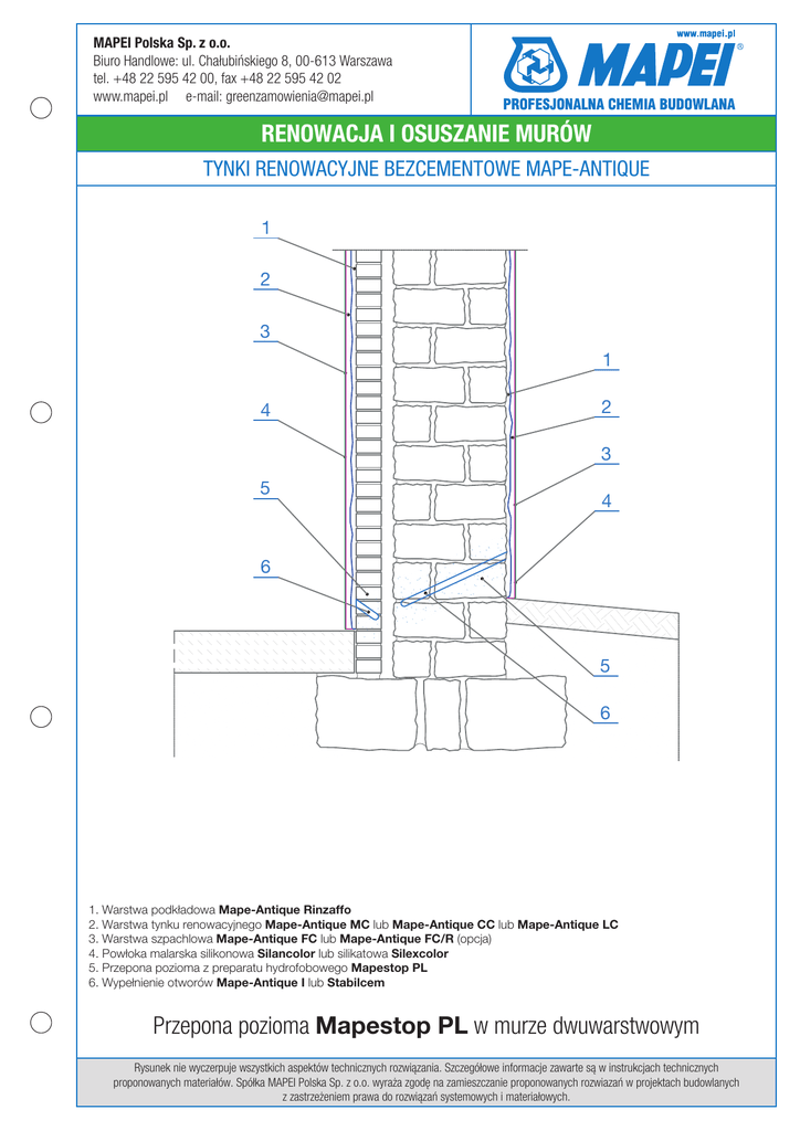 MAPEI Polska Sp. z o.o. Biuro Handlowe: ul. Chałubińskiego 8, 00-613 Warszawa tel. +48 22 595 42 00, fax +48 22 595 42 02 www.mapei.pl e-mail: [email protected] RENOWACJA I OSUSZANIE MURÓW TYNKI RENOWACYJNE BEZCEMENTOWE MAPE-ANTIQUE 1 2 3 1 4 2 3 5 4 6 5 6 1. Warstwa podkładowa Mape-Antique Rinzaffo 2. Warstwa tynku renowacyjnego Mape-Antique MC lub Mape-Antique CC lub Mape-Antique LC 3. Warstwa szpachlowa Mape-Antique FC lub Mape-Antique FC/R (opcja) 4. Powłoka malarska silikonowa Silancolor lub silikatowa Silexcolor 5. Przepona pozioma z preparatu hydrofobowego Mapestop PL 6. Wypełnienie otworów Mape-Antique I lub Stabilcem Przepona pozioma Mapestop PL w murze dwuwarstwowym Rysunek nie wyczerpuje wszystkich aspektów technicznych rozwiązania. Szczegółowe informacje zawarte są w instrukcjach technicznych proponowanych materiałów. Spółka MAPEI Polska Sp. z o.o. wyraża zgodę na zamieszczanie proponowanych rozwiazań w projektach budowlanych z zastrzeżeniem prawa do rozwiązań systemowych i materiałowych.
