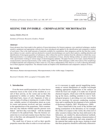 Problems of Forensic Sciences 2014, vol. 100, 307–317 Seeing the inviSible – criminaliStic microtraceS Janina Zięba-Palus Institute of Forensic Research, Kraków, Poland abstract Great advances have been made in the analysis of traces/microtraces for forensic purposes: new analytical techniques, modern sensitive equipment and appropriate software have been introduced and applied to the identification and comparative analysis of such traces. Due to the small amounts of materials available for examination, their uniqueness and the fact that they constitute evidence in court, sensitive and non-destructive research microtechniques are used in their analysis, enabling detection and identification of microgram quantities of substances, often without the need for isolation from the substrate in which they occur. Microspectrometry is an indispensable technique in the examination of traces, directly linking (online) an optical microscope with a spectrometer working in various ranges of electromagnetic radiation. The paper focuses on two types, namely Raman microspectrometry and microspectrometry in the visible range (MsP-Vis). both techniques enable observation of the morphology of studied materials and comparison of their colour in a way that is independent of the observer, as well as allowing determination of their pigment composition. The obtained results are helpful in the identification and comparative analysis of traces. Key words Microtraces; Raman microspectrometry; Microspectrometry in the visible range; Comparison. Received 2 October 2014; accepted 13 November 2014 1. introduction Even the most careful perpetrator of a crime leaves numerous traces at the scene of the incident as a result of their activity, on the victim and on their (the perpetrator’s) clothes or tool(s). Microscopic fibres individual hairs, traces of soil, fragments of skin or various types of soiling or staining are, in spite of their size, valuable carriers of information about an event, its course and persons involved, and may contribute to the apprehension of the perpetrator. Their examination may also indicate whether specific persons were linked – and how they were linked – with the incident of interest to the judicial body. Thus the forensic scientist tries to reveal and examine traces that have been left, so that they can subsequently be used in preparatory proceedings. The small size of traces as well as their specific properties mean that often in order to reveal such trac- es it is necessary to apply special magnifying instruments or various illuminators of variable wavelength enabling appropriate illumination of the surfaces on which the traces are sought, or to make use of special chemical reagents, which react with the material making up the traces, enabling scientists to see it. Technological progress is providing ever new instruments that are necessary for persons conducting examinations and is enabling the development of new methods of disclosure (Gaberle, 2007; Wójcikiewicz, 2009). Traces found both at the scene of the incident and during examination in the laboratory of, for example, the clothes of a suspect or the victim, the crime tool or other secured evidence that has been delivered to the laboratory, are studied by physicochemical methods. These methods usually encompass characterisation of build, chemical composition and some properties of the material that makes up the traces, bearing in mind that these properties should be sufficiently characteris- 308 J. Zięba-Palus tic for it to be possible to carry out comparative analysis or classification, and thus identify the studied material and categorize it into a defined class of products (Zięba-Palus, 2009). For example, observation of the morphological build of fibres isolated from under the nails of a victim of assault and identification of their polymer composition enables scientists to define the type(s) of fibre (natural, synthetic, acrylic, amide, etc.) and their purpose (e.g. used in the production of underwear, knitwear, or clothing and decorative fabrics). Comparing their composition with the composition of fibres from the clothes of an (alleged) attacker allows scientists to confirm or rule out contact between the (alleged) attacker and the victim. another example is the examination of plastic fragments revealed at the scene of the crime, allowing scientists to define the type of material and its origin, i.e., the type of object from which they separated. analysis of the mud on the shoes of a suspect (traces of soil) and comparing it with a sample of soil from the scene of the incident is helpful in confirming the presence of the suspect there. The importance of physicochemical analyses therefore cannot be overestimated. Microtraces, which without appropriate observational instruments are imperceptible to or poorly perceived by humans, are especially valuable due to the fact that it is impossible for a perpetrator to avoid leaving them or to remove them. They are always present in connection with a crime, although sometimes they are difficult to disclose. Most microtraces are characterised by relative durability. They are only destroyed when exposed to flames, heating to a high temperature, or the action of aggressive chemicals or powerful mechanical impact. These features mean that microtraces are of particular interest in criminalistics. Their use in preparatory proceedings is increasingly common. Progress has been made in recent years in the examination of microtraces for forensic purposes both in terms of new methods of disclosure (visualizing) and the application of new analytical techniques and modern sensitive equipment to the identification and comparative analysis of microtraces (as well as appropriate software). 2. new microtrace analysis techniques sensitive and non-destructive analysis microtechniques today enable detection and identification of unusually small amounts of substances, often without the need to se