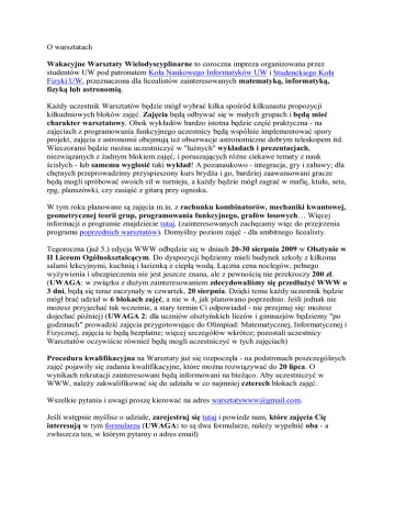 O warsztatach Wakacyjne Warsztaty Wielodyscyplinarne to coroczna impreza organizowana przez studentów UW pod patronatem Ko a Naukowego Informatyków UW i Studenckiego Ko a Fizyki UW, przeznaczona dla licealistów zainteresowanych matematyk , informatyk , fizyk lub astronomi . Ka dy uczestnik Warsztatów b dzie móg wybra kilka spo ród kilkunastu propozycji kilkudniowych bloków zaj . Zaj cia b odbywa si w ma ych grupach i mie charakter warsztatowy. Obok wyk adów bardzo istotna b dzie cz praktyczna - na zaj ciach z programowania funkcyjnego uczestnicy b wspólnie implementowa spory projekt, zaj cia z astronomii obejmuj te obserwacje astronomiczne dobrym teleskopem itd. Wieczorami b dzie mo na uczestniczy w "lu nych" wyk adach i prezentacjach, niezwi zanych z adnym blokiem zaj , i poruszaj cych ró ne ciekawe tematy z nauk cis ych - lub samemu wyg osi taki wyk ad! A pozanaukowo - integracja, gry i zabawy; dla ch tnych przeprowadzimy przyspieszony kurs bryd a i go, bardziej zaawansowani gracze mogli spróbowa swoich si w turnieju, a ka dy b dzie móg zagra w mafi , ktulu, seta, rpg, planszówki, czy zasi z gitar przy ognisku. W tym roku planowane s zaj cia m.in. z rachunku kombinatorów, mechaniki kwantowej, geometrycznej teorii grup, programowania funkcyjnego, grafów losowych… Wi cej informacji o programie znajdziecie tutaj. (zainteresowanych zach camy wi c do przejrzenia programu poprzednich warsztatów). Domy lny poziom zaj - dla ambitnego licealisty. Tegoroczna (ju 5.) edycja WWW odb dzie si w dniach 20-30 sierpnia 2009 w Olsztynie w II Liceum Ogólnokszta cym. Do dyspozycji b dziemy mieli budynek szko y z kilkoma salami lekcyjnymi, kuchni i azienk z ciep wod . czna cena noclegów, pe nego wy ywienia i ubezpieczenia nie jest jeszcze znana, ale z pewno ci nie przekroczy 200 z . (UWAGA: w zwi zku z du ym zainteresowaniem zdecydowali my si przed WWW o 3 dni, b si teraz zaczyna y w czwartek, 20 sierpnia. Dzi ki temu ka dy uczestnik b dzie móg bra udzia w 6 blokach zaj , a nie w 4, jak planowano poprzednio. Je li jednak nie mo esz przyjecha tak wcze nie, a stary termin Ci odpowiada - nie przejmuj si : mo esz dojecha pó niej) (UWAGA 2: dla uczniów olszty skich liceów i gimnazjów b dziemy "po godzinach" prowadzi zaj cia przygotowuj ce do Olimpiad: Matematycznej, Informatycznej i Fizycznej, zaj cia te b bezp atne; wi cej szczegó ów wkrótce; pozostali uczestnicy Warsztatów oczywi cie równie b mogli uczestniczy w tych zaj ciach) Procedura kwalifikacyjna na Warsztaty ju si rozpocz a - na podstronach poszczególnych zaj pojawi y si zadania kwalifikacyjne, które mo na rozwi zywa do 20 lipca. O wynikach rekrutacji zainteresowani b informowani na bie co. Aby uczestniczy w WWW, nale y zakwalifikowa si do udzia u w co najmniej czterech blokach zaj . Wszelkie pytania i uwagi prosz kierowa na adres [email protected]. Je li wst pnie my lisz o udziale, zarejestruj si tutaj i powiedz nam, które zaj cia Ci interesuj w tym formularzu (UWAGA: to s dwa formularze, nale y wype ni oba - a zw aszcza ten, w którym pytamy o adres email)
