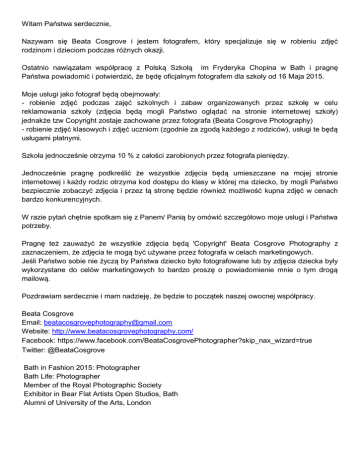 Witam Państwa serdecznie, Nazywam się Beata Cosgrove i jestem fotografem, który specjalizuje się w robieniu zdjęć rodzinom i dzieciom podczas różnych okazji. Ostatnio nawiązałam współpracę z Polską Szkołą im Fryderyka Chopina w Bath i pragnę Państwa powiadomić i potwierdzić, że będę oficjalnym fotografem dla szkoły od 16 Maja 2015. Moje usługi jako fotograf będą obejmowały: - robienie zdjęć podczas zajęć szkolnych i zabaw organizowanych przez szkołę w celu reklamowania szkoły (zdjęcia będą mogli Państwo oglądać na stronie internetowej szkoły) jednakże tzw Copyright zostaje zachowane przez fotografa (Beata Cosgrove Photography) - robienie zdjęć klasowych i zdjęć uczniom (zgodnie za zgodą każdego z rodziców), usługi te będą usługami płatnymi. Szkoła jednocześnie otrzyma 10 % z całości zarobionych przez fotografa pieniędzy. Jednocześnie pragnę podkreślić że wszystkie zdjęcia będą umieszczane na mojej stronie internetowej i każdy rodzic otrzyma kod dostępu do klasy w której ma dziecko, by mogli Państwo bezpiecznie zobaczyć zdjęcia i przez tą stronę będzie również możliwość kupna zdjęć w cenach bardzo konkurencyjnych. W razie pytań chętnie spotkam się z Panem/ Panią by omówić szczegółowo moje usługi i Państwa potrzeby. Pragnę też zauważyć że wszystkie zdjęcia będą 'Copyright' Beata Cosgrove Photography z zaznaczeniem, że zdjęcia te mogą być używane przez fotografa w celach marketingowych. Jeśli Państwo sobie nie życzą by Państwa dziecko było fotografowane lub by zdjęcia dziecka były wykorzystane do celów marketingowych to bardzo proszę o powiadomienie mnie o tym drogą mailową. Pozdrawiam serdecznie i mam nadzieję, że będzie to początek naszej owocnej współpracy. Beata Cosgrove Email: [email protected] Website: http://www.beatacosgrovephotography.com/ Facebook: https://www.facebook.com/BeataCosgrovePhotographer?skip_nax_wizard=true Twitter: @BeataCosgrove Bath in Fashion 2015: Photographer Bath Life: Photographer Member of the Royal Photographic Society Exhibitor in Bear Flat Artists Open Studios, Bath Alumni of University of the Arts, London