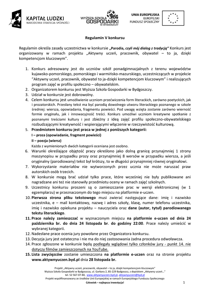 Regulamin V konkursu Regulamin określa zasady uczestnictwa w konkursie „Parodia, czyli mój dialog z tradycją” Konkurs jest organizowany w ramach projektu „Aktywny uczeo, pracownik, obywatel – to ja, dzięki kompetencjom kluczowym”. 1. Konkurs adresowany jest do uczniów szkół ponadgimnazjalnych z terenu województw kujawsko-pomorskiego, pomorskiego i warmiosko-mazurskiego, uczestniczących w projekcie ”Aktywny uczeo, pracownik, obywatel to ja-dzięki kompetencjom kluczowym” i realizujących program zajęd w profilu społeczno – obywatelskim. 2. Organizatorem konkursu jest Wyższa Szkoła Gospodarki w Bydgoszczy. 3. Udział w konkursie jest dobrowolny. 4. Celem konkursu jest umożliwienie uczniom przedwiczenia form literackich, zarówno poetyckich, jak i prozatorskich. Przesłany tekst ma byd parodią dowolnego utworu literackiego poznanego w szkole średniej: wiersza, opowiadania, fragmentu powieści. Pod uwagę wzięta zostanie zarówno wiernośd formie oryginału, jak i innowacyjnośd treści. Konkurs umożliwi uczniom kreatywne spotkanie z poznanymi treściami kultury i jest zbieżny z ideą zajęd profilu społeczno-obywatelskiego rozbudzającymi kreatywnośd i wspierającymi włączenie w rzeczywistośd kulturową. 5. Przedmiotem konkursu jest praca w jednej z poniższych kategorii: I – proza (opowiadanie, fragment powieści) II – poezja (wiersz) Każda z wymienionych dwóch kategorii oceniana jest osobno. 6. Warunki określające objętośd pracy określono jako dolną granicę przynajmniej 1 strony maszynopisu w przypadku prozy oraz przynajmniej 8 wersów w przypadku wiersza, a jeśli oryginalny (parodiowany) tekst był krótszy, to w długości przynajmniej równej oryginałowi. 7. Wykorzystanie materiałów nie wytworzonych przez ucznia nie może naruszad praw autorskich osób trzecich. 8. W konkursie mogą brad udział tylko prace, które wcześniej nie były publikowane ani nagradzane ani też nie stanowiły przedmiotu oceny w ramach zajęd szkolnych. 9. Uczestnicy konkursu proszeni są o zamieszczanie prac w wersji elektronicznej (w 1 egzemplarzu) w przeznaczonym do tego miejscu na platformie e-uczen. 10. Pierwsza strona pliku tekstowego musi zwierad następujące dane: imię i nazwisko uczestnika, e – mail kontaktowy, nazwę i adres szkoły, klasę, numer telefonu uczestnika, imię i nazwisko opiekuna projektu – nauczyciela oraz dane (autor, tytuł) parodiowanego tekstu literackiego. 11. Prace należy zamieszczad w wyznaczonym miejscu na platformie e-uczen od dnia 24 października br. do dnia 24 listopada br. do godziny 22:00. Prace należy umieścid w wybranej kategorii. 12. Nadesłane prace ocenia jury powołane przez Organizatora konkursu. 13. Decyzja jury jest ostateczna i nie ma do niej zastosowania żadna procedura odwoławcza. 14. Prace zgłoszone w konkursie będą podlegały wglądowi tylko członków jury - punkt 14. nie dotyczy filmów zamieszczonych na YouTube. 15. Lista zwycięzców zostanie umieszczona na platformie e-uczen oraz na stronie projektu www.aktywnyuczen.byd.pl dnia 28 listopada br. Projekt „Aktywny uczeo, pracownik, obywatel – to ja, dzięki kompetencjom kluczowym” Wyższa Szkoła Gospodarki w Bydgoszczy, ul. Garbary 2, 85-229 Bydgoszcz, z dopiskiem „Aktywny uczeo…” tel. 52 567-07-80, www.aktywnyuczen.byd.pl, [email protected] Projekt współfinansowany ze środków Unii Europejskiej w ramach Europejskiego Funduszu Społecznego Człowiek – najlepsza inwestycja! 1 16. O zwycięstwie decyduje liczba zdobytych punktów. Wygrywają prace, które uzyskały najwięcej punktów w każdej z wskazanych w regulaminie kategorii. 17. Prace nadesłane po terminie nie będą poddane ocenie jury a tym samym nie biorą udziału w konkursie. 18. Organizator nie zwraca prac nadesłanych na konkurs. 19. Nadesłanie prac jest jednoznaczne ze zgodą na upowszechnienie prac (bez honorarium) nagrodzonych lub wyróżnionych w formie publikacji pokonkursowej. 20. Organizator przewidział dla laureatów konkursu cenne nagrody w formie książkowej (do wyboru przez laureata z udostępnionej listy książek - wybór zostanie dokonany za pośrednictwem platformy e-uczen) oraz jednodniowej wycieczki. Wycieczka odbędzie się w styczniu 2011 roku. Jej dokładny termin zostanie podany laureatom konkursu. 21. Laureaci IV Konkursu nie mogą uczestniczyd w tym (V) Konkursie, ponieważ nagrody w postaci książki i wycieczki integracyjnej są dokładnie takie same. 22. Laureaci IV Konkursu mogą przesład pracę traktując ją jako doskonałą powtórkę do matury, jednak uzyskany wynik nie będzie brany pod uwagę przez jury oceniające do wyłonienia listy zwycięzców. 23. Na udział w wycieczce laureat musi uzyskad zgodę swojego opiekuna prawnego. 24. W konkursie wygrywa 50 najlepszych prac. 25. Osobą wyznaczoną do kontaktu z ramienia Wyższej Szkoły Gospodarki jest Kierownik zespołu profilu społeczno – obywatelskiego – dr Agnieszka Jeran. Kontakt przez platformę e-uczen lub e-mail: [email protected]. 26. Ostateczna interpretacja niniejszego regulaminu należy do Organizatora tj. Wyższej Szkoły Gospodarki w Bydgoszczy. 27. Regulamin wchodzi w życie z dniem 24 października 2011 roku. 28. Aktualna treśd regulaminu konkursu znajduje się na platformie e-uczen. Projekt „Aktywny uczeo, pracownik, obywatel – to ja, dzięki kompetencjom kluczowym” Wyższa Szkoła Gospodarki w Bydgoszczy, ul. Garbary 2, 85-229 Bydgoszcz, z dopiskiem „Aktywny uczeo…” tel. 52 567-07-80, www.aktywnyuczen.byd.pl, [email protected] Projekt współfinansowany ze środków Unii Europejskiej w ramach Europejskiego Funduszu Społecznego Człowiek – najlepsza inwestycja! 2