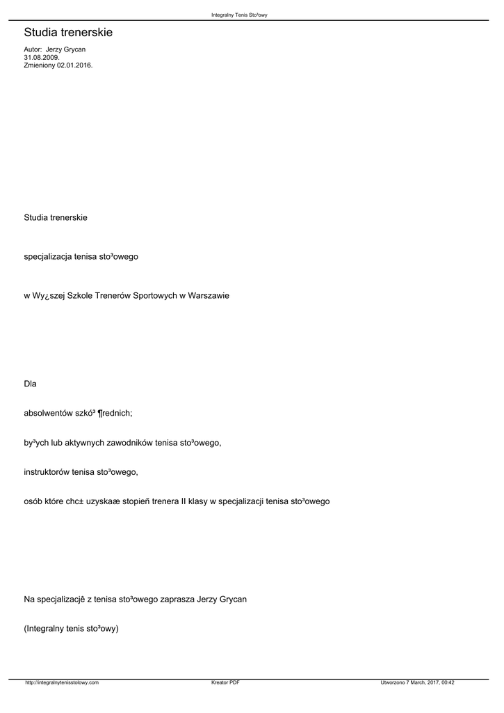 Integralny Tenis Sto³owy Studia trenerskie Autor: Jerzy Grycan 31.08.2009. Zmieniony 02.01.2016. Studia trenerskie specjalizacja tenisa sto³owego w Wy¿szej Szkole Trenerów Sportowych w Warszawie Dla absolwentów szkó³ ¶rednich; by³ych lub aktywnych zawodników tenisa sto³owego, instruktorów tenisa sto³owego, osób które chc± uzyskaæ stopieñ trenera II klasy w specjalizacji tenisa sto³owego Na specjalizacjê z tenisa sto³owego zaprasza Jerzy Grycan (Integralny tenis sto³owy) http://integralnytenisstolowy.com Kreator PDF Utworzono 7 March, 2017, 00:42 Integralny Tenis Sto³owy Co najbardziej podoba³o siê uczestnikom poprzednich specjalistycznych kursów i szkoleñ Integralnego tenisa sto³owego? Solidnie prowadzone zajêcia, zaanga¿owanie i profesjonalizm prowadz±cego; - Fascynuj±ce tematy integralnego tenisa sto³owego, ciekawe informacje, istotne tematy, rewolucyjne podej¶cie, inspiracje, dla takiej idei chêtnie po¶wiecê swoje ¿ycie; - ¦wietne zajêcia na sali treningowej, wiele podawanych przyk³adów najlepszych tenisistów, ich metody treningu, historie ¿ycia i kariery; - Stworzenie atmosfery pracy znakomita atmosfera grupy, zajêcia w formie dialogu, swoboda wypowiedzi, - Praktyczne przygotowanie do dalszej pracy; - Kurs wp³yn±³ na mój rozwój osobisty i da³ mi du¿o do my¶lenia; - Program szkolenia zrealizowa³am w pe³ni. Podczas seminarium dowiedzia³am siê o wielu sprawach, które mnie szczególnie interesowa³y: organizacja, promocja, finanse, wspó³praca; - Program by³ zdecydowanie bardziej interesuj±cy ni¿ na innych kursach. Pozwoli³ mi spojrzeæ na tenis sto³owy z innej strony, wskaza³ mo¿liwo¶ci w³asnego rozwoju; - Oczekiwania swoje odno¶nie kursu zrealizowa³em w 100%. Kurs na wysokim poziomie; - Nie przypuszcza³em, ¿e takie szkolenie mo¿e zrobiæ na mnie tak du¿e wra¿enie i zainspirowaæ do dalszego dzia³ania; - Nie wiedzia³em, ¿e zajêcia mog± byæ tak profesjonalnie zorganizowane, lepiej ni¿ kursy na AWF; - Otwarto¶æ, zaanga¿owanie prowadz±cych bardzo mi siê podoba³y. Chyba najwiêksze pozytywne wra¿enie wywar³a na mnie atmosfera twórczo¶ci, pasji i wiary w ludzkie mo¿liwo¶ci, któr± przepe³nione by³o ca³e seminarium; - Wszystko zrobione profesjonalnie; - Du¿o by³o przydatnych æwiczeñ, które z pewno¶ci± wykorzystam w swojej pracy æw. koordynacyjne, æw. pracy nóg przy http://integralnytenisstolowy.com Kreator PDF Utworzono 7 March, 2017, 00:42 Integralny Tenis Sto³owy stole, zabawy...; - Trening mentalny wywar³ na mnie najwiêksze wra¿enie; - Pokazanie tenisa sto³owego jako dziedziny, która mo¿e wp³ywaæ pozytywnie na rozwój osobowo¶ci. Zosta³em zainspirowany do g³êbszego studiowania teorii tenisa sto³owego oraz pracy nad sob±, swoim zachowaniem, moralnym udoskonalaniem siê; - Ludzie, których pozna³em oraz prowadz±cy zajêcia byli najwiêkszym plusem tego kursu; - Najbardziej podoba³o mi siê ca³o¶ciowe podej¶cie do tematu, model AQAL; 3-LETNIE STUDIA LICENCJACKIE Dla absolwentów szko³y ¶redniej, by³ych i obecnych zawodników tenisa sto³owego, instruktorów tenisa sto³owego. Jakie formalno¶ci nale¿y wype³niæ zg³aszaj±c siê na studia licencjackie? Ramowy plan 3-letnich studiów licencjackich ROCZNE STUDIA PODYPLOMOWE Dla absolwentów kierunku wychowania fizycznego lub trenerskiego (w innej dyscyplinie sportu) AWF. Zapoznaj siê z aktualno¶ciami dotycz±cymi studiów podyplomowych 2010 http://integralnytenisstolowy.com Kreator PDF Utworzono 7 March, 2017, 00:42 Integralny Tenis Sto³owy Przygotuj odpowiednie dokumenty i wype³nij wniosek zg³oszeniowy na studia podyplomowe Pe³n± informacjê, programy studiów i druki zg³oszenia on-line znajdziesz na stronach www lub w biurze WSTS: Fundacja Kszta³cenia i Dokszta³cania Trenerów http://fkdt.pl/ Wy¿sza Szko³a Trenerów Sportowych http://wststorwar.pl/ tel.: (22) 529-88-50(22) 529-88-50 fax: (22) 529-89-40 e-mail: [email protected] Integralny tenis sto³owy Mo¿na te¿ kontaktowaæ siê bezpo¶rednio z pe³nomocnikiem Rektora do spraw specjalizacji tenisa sto³owego w WSTS Jerzym Grycanem http://integralnytenisstolowy.com Kreator PDF Utworzono 7 March, 2017, 00:42 Integralny Tenis Sto³owy www.integralnytenisstolowy.com tel.: +48 696 557 718+48 696 557 718 e-mail: [email protected] Call Send SMS Call from mobile Add to Skype You'll need Skype CreditFree via Skype http://integralnytenisstolowy.com Kreator PDF Utworzono 7 March, 2017, 00:42