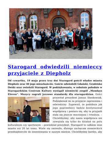 Starogard odwiedzili niemieccy przyjaciele z Diepholz Od czwartku, 19 maja przez trzy dni Starogard gościł władze miasta Diepholz oraz 40 jego mieszkańców. Goście odwiedzili Gdański, Grodzisko Owidz oraz zwiedzili Starogard. W podziękowaniu, w sobotnie południe w Starogardzkim Centrum Kultury wystąpił niemiecki zespół „Mondays Eleven”. Muzycy zagrali jazzowe standardy dla starogardzian. Gości przywitał prezydent Janusz Stankowiak. Podziękował im za przyjęcie zaproszenia i odwiedziny. Zapewnił, że podobnie jak jego poprzednicy będzie kontynuował współpracę i postara się, aby ta przyjaźń stała się jeszcze mocniejsza i trwalsza. – Chcielibyśmy, aby nasza współpraca nie zawężała się tylko do działań na polu kulturalnym czy sportowym – powiedział prezydent. Starogard to całkiem inne miasto niż 20 lat temu. Wiele się zmieniło, dlatego zachęcam niemieckich przedsiębiorców do inwestowania w naszym mieście. Chcielibyśmy bardzo, aby nasza współpraca w przyszłości objęła również gospodarkę. Burmistrz Dipeholz podziękował za wspaniałe przyjęcie i gościnność.- Łączy nas wspólny dom, którym jest Europa – Europa sąsiadów, Europa partnerstwa, Europa przyjaźni – powiedział Thomas Schulze. – Czujemy się w Starogardzie jak u siebie w domu, wśród przyjaciół. Podkreślił, że otwartość, z jaką się spotkali, bardzo ich cieszy i podobnie jak prezydentowi Starogardu zależy im na rozszerzeniu współpracy również na innych płaszczyznach. Podziękował też wszystkim rodzinom, które przyjęły mieszkańców Diepholz do swoich domów i pokazały jak wygląda polska codzienność. Aby podkreślić wagę polsko-niemieckiej przyjaźni podarował miastu drzewko obywatelskie. Wyjaśnił, że tradycją Diepholz jest, że co roku wszyscy mieszkańcy wspólnie sadzą takie drzewka w mieście, aby dać świadectwo jedności, solidarności i wspólnoty. – W takim duchu przekazuje to drzewko jako symbol silnych więzów, które połączyły nasze miasta – powiedział burmistrz. Prezydent Janusz Stankowiak zapowiedział, że posadzi to drzewko wspólnie z mieszkańcami podczas Dni Starogardu. Władze Stowarzyszenia Partnerskiego pomiędzy Diepholz i Starogardem Gdańskim wsparły też finansowo trzy starogardzkie stowarzyszenia: „Można Inaczej”,Klub Kobiet „Amazonka” oraz starogardzki Hufiec Związku Harcerstwa Polskiego. Szczególnie wyróżniły prezesa Stowarzyszenia Partnerstwa Pomiędzy Starogardem Gdańskim a Diepholz Józefa Płoszyńskiego. Podziękowały mu za współpracę. W podarunku przekazały pieniądze na kontynuowanie działalności Stowarzyszenia. Podczas trzydniowej wizyty niemieccy przyjaciele odwiedzili cmentarz ewangelicki przy ul. Owidzkiej. Złożyli kwiaty pod tablicą, upamiętniającą tragiczną śmierć mieszkańców Prus Wschodnich, którzy zimą 1945 roku uciekali przed sowiecką armią. Zwiedzili Europejskie Centrum Solidarności, Stare Miasto w Gdańsku, Grodzisko Owidz oraz Kościół Św. Mateusza, mury obronne, Rynek Miejski i Muzeum Ziemi Kociewskiej w Starogardzie. W sobotnie popołudnie, 21 maja zespół „Mondays Eleven” wystąpił przed starogardzką publicznością w sali widowiskowej Starogardzkiego Centrum Kultury. Artyści wykonali znane światowe przeboje muzyki jazzowej, wywołując burze oklasków na widowni. Starogard przyjaźni się z Diepholz od 20 lat. Współpracę zapoczątkował Józef Płoszyński założyciel Stowarzyszenia Partnerstwa Pomiędzy Starogardem Gdańskim a Diepholz. Dzięki tej przyjaźni oraz współpracy Stowarzyszenia i władz miasta doszło do wielu wymian polskich i niemieckich rodzin i młodzieży. Partnerskie miasta odwiedzili też strażacy, lokalni sportowcy i artyści.