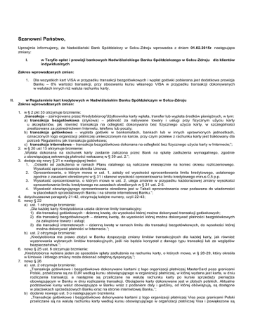 Szanowni Państwo, Uprzejmie informujemy, że Nadwiślański Bank Spółdzielczy w Solcu-Zdroju wprowadza z dniem 01.02.2015r. następujące zmiany: I. w Taryfie opłat i prowizji bankowych Nadwiślańskiego Banku Spółdzielczego w Solcu-Zdroju dla klientów indywidualnych Zakres wprowadzanych zmian: 1. II. Dla wszystkich kart VISA w przypadku transakcji bezgotówkowych i wypłat gotówki pobierana jest dodatkowa prowizja Banku – 6% wartości transakcji, przy stosowaniu kursu własnego VISA w przypadku transakcji dokonywanych w walutach innych niż waluta rachunku karty. w Regulaminie kart kredytowych w Nadwiślańskim Banku Spółdzielczym w Solcu-Zdroju Zakres wprowadzanych zmian: 1. w § 2 pkt 33 otrzymuje brzmienie: „transakcja – zainicjowana przez Kredytobiorcę/Użytkownika karty wpłata, transfer lub wypłata środków pieniężnych, w tym: a) transakcja bezgotówkowa (stykowa) – płatność za nabywane towary i usługi przy fizycznym użyciu karty u akceptantów, jak również transakcja na odległość dokonywana bez fizycznego użycia karty, w szczególności zrealizowana za pośrednictwem Internetu, telefonu lub poczty; b) transakcja gotówkowa – wypłata gotówki w bankomatach, bankach lub w innych uprawnionych jednostkach, oznaczonych logo organizacji płatniczej umieszczonym na karcie, przy czym przelew z rachunku karty jest traktowany dla potrzeb Regulaminu jak transakcja gotówkowa; c) transakcja internetowa – transakcja bezgotówkowa dokonana na odległość bez fizycznego użycia karty w Internecie;”; 2. w § 20 ust 13 otrzymuje brzmienie: „Wpłata dokonana na rachunek karty zostanie zaliczona przez Bank na spłatę zadłużenia wymagalnego, zgodnie z obowiązującą sekwencją płatności wskazaną w § 39 ust. 2.”; 3. dodaje się nowy § 21 o następującej treści: 1. „Odsetki od zadłużenia w ramach Planu ratalnego są naliczane miesięcznie na koniec okresu rozliczeniowego. Wysokość oprocentowania określa Umowa. 2. Oprocentowanie, o którym mowa w ust. 1, zależy od wysokości oprocentowania limitu kredytowego, ustalonego zgodnie z zasadami określonymi w § 31 i stanowi wysokość oprocentowania limitu kredytowego minus 0,5 p.p. 3. Wysokość oprocentowania, o którym mowa w ust. 2, ulega zmianie w przypadku każdorazowej zmiany wysokości oprocentowania limitu kredytowego na zasadach określonych w § 31 ust. 2-5. 4. Wysokość obowiązującego oprocentowania określona jest w Tabeli oprocentowania oraz podawana do wiadomości w placówkach sprzedażowych Banku i na stronie internetowej Banku.”; 4. dotychczasowe paragrafy 21-42, otrzymują kolejne numery, czyli 22-43; 5. nowy § 22 a) ust. 1 otrzymuje brzmienie: „Dla każdej karty Kredytobiorca ustala dzienne limity transakcyjny: 1) dla transakcji gotówkowych - dzienną kwotę, do wysokości której można dokonywać transakcji gotówkowych; 2) dla transakcji bezgotówkowych – dzienną kwotę, do wysokości której można dokonywać płatności bezgotówkowych za zakupione towary i usługi; 3) dla transakcji internetowych – dzienną kwotę w ramach limitu dla transakcji bezgotówkowych, do wysokości której można dokonywać płatności w Internecie.”; b) ust. 2 otrzymuje brzmienie: „Kredytobiorca ma prawo złożyć w Banku dyspozycję zmiany limitów transakcyjnych dla każdej karty, jak również wyzerowania wybranych limitów transakcyjnych, jeśli nie będzie korzystał z danego typu transakcji lub ze względów bezpieczeństwa.”; 6. nowy § 25 ust. 6 otrzymuje brzmienie: „Kredytobiorca wybiera jeden ze sposobów spłaty zadłużenia na rachunku karty, o których mowa, w § 28-29, który określa w Umowie i którego zmiany może dokonać odrębną dyspozycją.”; 7. nowy § 26 a) ust. 2 otrzymuje brzmienie: „Transakcje gotówkowe i bezgotówkowe dokonywane kartami z logo organizacji płatniczej MasterCard poza granicami Polski, przeliczane są na EUR według kursu obowiązującego w organizacji płatniczej, w której wydana jest karta, w dniu rozliczenia transakcji, a następnie są przeliczane na walutę rachunku karty po kursie sprzedaży pieniądza obowiązującym w Banku w dniu rozliczenia transakcji. Obciążenie karty dokonywane jest w złotych polskich. Aktualne podstawowe kursy walut obowiązujące w Banku wraz z podaniem daty i godziny, od której obowiązują, są dostępne w placówkach sprzedażowych Banku oraz na stronie internetowej Banku.”; b) dodanie nowego ust. 3 o następującym brzmieniu: „Transakcje gotówkowe i bezgotówkowe dokonywane kartami z logo organizacji płatniczej Visa poza granicami Polski przeliczane są na walutę rachunku karty według kursu obowiązującego w organizacji płatniczej Visa i powiększone są o prowizję Banku za przewalutowanie zgodnie z obowiązującą Taryfą, a następnie informacja o tej kwocie przekazywana jest do Banku w celu rozliczenia. Kursy, po których transakcje przeliczane są przez Visa na walutę rachunku karty, dostępne są na stronie internetowej organizacji Visa Europe.”; c) dotychczasowe ustępy 3-4, otrzymują kolejne numery, czyli 4-5; 8. nowy § 28 ust. 4 otrzymuje brzmienie: „Każda wpłata na rachunek karty powoduje spłatę zadłużenia w kolejności wskazanej w § 39 ust. 2.”; 9. nowy § 30 ust.1 otrzymuje brzmienie: „Bank jest uprawniony do pobierania opłat i prowizji określonych w Taryfie oraz odsetek określonych w Tabeli oprocentowania, obowiązujących w dniu zawarcia Umowy. Opłaty, prowizje i stopy procentowe mogą ulec zmianie zgodnie z ust. 7-12 oraz § 31 ust. 2.”; 10. nowy § 31 otrzymuje brzmienie: 1. „Oprocentowanie limitu kredytowego udzielonego na podstawie Umowy ustalone jest według zmiennej stopy procentowej. Wysokość oprocentowania określa Umowa. 2. Wysokość oprocentowania, o którym mowa w ust. 1, ulega obniżeniu w przypadku każdorazowej obniżki wysokości stopy lombardowej NBP stosownie do wartości obniżenia stopy lombardowej NBP, chyba ż