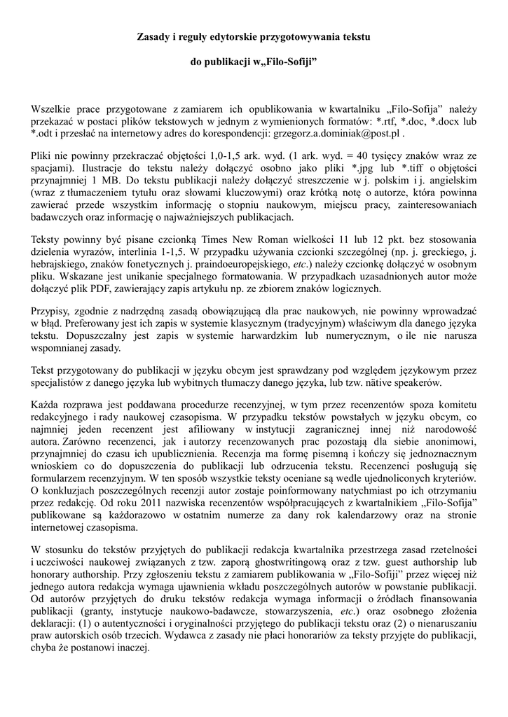 Zasady i reguły edytorskie przygotowywania tekstu do publikacji w„Filo-Sofiji” Wszelkie prace przygotowane z zamiarem ich opublikowania w kwartalniku „Filo-Sofija” należy przekazać w postaci plików tekstowych w jednym z wymienionych formatów: *.rtf, *.doc, *.docx lub *.odt i przesłać na internetowy adres do korespondencji: [email protected] . Pliki nie powinny przekraczać objętości 1,0-1,5 ark. wyd. (1 ark. wyd. = 40 tysięcy znaków wraz ze spacjami). Ilustracje do tekstu należy dołączyć osobno jako pliki *.jpg lub *.tiff o objętości przynajmniej 1 MB. Do tekstu publikacji należy dołączyć streszczenie w j. polskim i j. angielskim (wraz z tłumaczeniem tytułu oraz słowami kluczowymi) oraz krótką notę o autorze, która powinna zawierać przede wszystkim informację o stopniu naukowym, miejscu pracy, zainteresowaniach badawczych oraz informację o najważniejszych publikacjach. Teksty powinny być pisane czcionką Times New Roman wielkości 11 lub 12 pkt. bez stosowania dzielenia wyrazów, interlinia 1-1,5. W przypadku używania czcionki szczególnej (np. j. greckiego, j. hebrajskiego, znaków fonetycznych j. praindoeuropejskiego, etc.) należy czcionkę dołączyć w osobnym pliku. Wskazane jest unikanie specjalnego formatowania. W przypadkach uzasadnionych autor może dołączyć plik PDF, zawierający zapis artykułu np. ze zbiorem znaków logicznych. Przypisy, zgodnie z nadrzędną zasadą obowiązującą dla prac naukowych, nie powinny wprowadzać w błąd. Preferowany jest ich zapis w systemie klasycznym (tradycyjnym) właściwym dla danego języka tekstu. Dopuszczalny jest zapis w systemie harwardzkim lub numerycznym, o ile nie narusza wspomnianej zasady. Tekst przygotowany do publikacji w języku obcym jest sprawdzany pod względem językowym przez specjalistów z danego języka lub wybitnych tłumaczy danego języka, lub tzw. nätive speakerów. Każda rozprawa jest poddawana procedurze recenzyjnej, w tym przez recenzentów spoza komitetu redakcyjnego i rady naukowej czasopisma. W przypadku tekstów powstałych w języku obcym, co najmniej jeden recenzent jest afiliowany w instytucji zagranicznej innej niż narodowość autora. Zarówno recenzenci, jak i autorzy recenzowanych prac pozostają dla siebie anonimowi, przynajmniej do czasu ich upublicznienia. Recenzja ma formę pisemną i kończy się jednoznacznym wnioskiem co do dopuszczenia do publikacji lub odrzucenia tekstu. Recenzenci posługują się formularzem recenzyjnym. W ten sposób wszystkie teksty oceniane są wedle ujednoliconych kryteriów. O konkluzjach poszczególnych recenzji autor zostaje poinformowany natychmiast po ich otrzymaniu przez redakcję. Od roku 2011 nazwiska recenzentów współpracujących z kwartalnikiem „Filo-Sofija” publikowane są każdorazowo w ostatnim numerze za dany rok kalendarzowy oraz na stronie internetowej czasopisma. W stosunku do tekstów przyjętych do publikacji redakcja kwartalnika przestrzega zasad rzetelności i uczciwości naukowej związanych z tzw. zaporą ghostwritingową oraz z tzw. guest authorship lub honorary authorship. Przy zgłoszeniu tekstu z zamiarem publikowania w „Filo-Sofiji” przez więcej niż jednego autora redakcja wymaga ujawnienia wkładu poszczególnych autorów w powstanie publikacji. Od autorów przyjętych do druku tekstów redakcja wymaga informacji o źródłach finansowania publikacji (granty, instytucje naukowo-badawcze, stowarzyszenia, etc.) oraz osobnego złożenia deklaracji: (1) o autentyczności i oryginalności przyjętego do publikacji tekstu oraz (2) o nienaruszaniu praw autorskich osób trzecich. Wydawca z zasady nie płaci honorariów za teksty przyjęte do publikacji, chyba że postanowi inaczej.