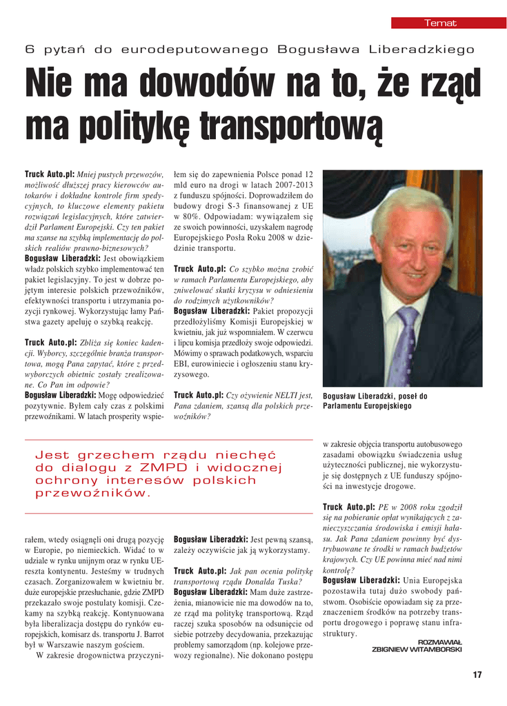 Temat 6 pytań do eurodeputowanego Bogusława Liberadzkiego Nie ma dowodów na to, że rząd ma politykę transportową Truck Auto.pl: Mniej pustych przewozów, możliwość dłuższej pracy kierowców au− tokarów i dokładne kontrole firm spedy− cyjnych, to kluczowe elementy pakietu rozwiązań legislacyjnych, które zatwier− dził Parlament Europejski. Czy ten pakiet ma szanse na szybką implementację do pol− skich realiów prawno−biznesowych? Bogusław Liberadzki: Jest obowiązkiem władz polskich szybko implementować ten pakiet legislacyjny. To jest w dobrze po− jętym interesie polskich przewoźników, efektywności transportu i utrzymania po− zycji rynkowej. Wykorzystując łamy Pań− stwa gazety apeluję o szybką reakcję. Truck Auto.pl: Zbliża się koniec kaden− cji. Wyborcy, szczególnie branża transpor− towa, mogą Pana zapytać, które z przed− wyborczych obietnic zostały zrealizowa− ne. Co Pan im odpowie? Bogusław Liberadzki: Mogę odpowiedzieć pozytywnie. Byłem cały czas z polskimi przewoźnikami. W latach prosperity wspie− łem się do zapewnienia Polsce ponad 12 mld euro na drogi w latach 2007−2013 z funduszu spójności. Doprowadziłem do budowy drogi S−3 finansowanej z UE w 80%. Odpowiadam: wywiązałem się ze swoich powinności, uzyskałem nagrodę Europejskiego Posła Roku 2008 w dzie− dzinie transportu. Truck Auto.pl: Co szybko można zrobić w ramach Parlamentu Europejskiego, aby zniwelować skutki kryzysu w odniesieniu do rodzimych użytkowników? Bogusław Liberadzki: Pakiet propozycji przedłożyliśmy Komisji Europejskiej w kwietniu, jak już wspomniałem. W czerwcu i lipcu komisja przedłoży swoje odpowiedzi. Mówimy o sprawach podatkowych, wsparciu EBI, eurowiniecie i ogłoszeniu stanu kry− zysowego. Truck Auto.pl: Czy ożywienie NELTI jest, Pana zdaniem, szansą dla polskich prze− woźników? Jest grzechem rządu niechęć do dialogu z ZMPD i widocznej ochrony interesów polskich przewoźników. rałem, wtedy osiągnęli oni drugą pozycję w Europie, po niemieckich. Widać to w udziale w rynku unijnym oraz w rynku UE− reszta kontynentu. Jesteśmy w trudnych czasach. Zorganizowałem w kwietniu br. duże europejskie przesłuchanie, gdzie ZMPD przekazało swoje postulaty komisji. Cze− kamy na szybką reakcję. Kontynuowana była liberalizacja dostępu do rynków eu− ropejskich, komisarz ds. transportu J. Barrot był w Warszawie naszym gościem. W zakresie drogownictwa przyczyni− Bogusław Liberadzki: Jest pewną szansą, zależy oczywiście jak ją wykorzystamy. Truck Auto.pl: Jak pan ocenia politykę transportową rządu Donalda Tuska? Bogusław Liberadzki: Mam duże zastrze− żenia, mianowicie nie ma dowodów na to, ze rząd ma politykę transportową. Rząd raczej szuka sposobów na odsunięcie od siebie potrzeby decydowania, przekazując problemy samorządom (np. kolejowe prze− wozy regionalne). Nie dokonano postępu Bogusław Liberadzki, poseł do Parlamentu Europejskiego w zakresie objęcia transportu autobusowego zasadami obowiązku świadczenia usług użyteczności publicznej, nie wykorzystu− je się dostępnych z UE funduszy spójno− ści na inwestycje drogowe. Truck Auto.pl: PE w 2008 roku zgodził się na pobieranie opłat wynikających z za− nieczyszczania środowiska i emisji hała− su. Jak Pana zdaniem powinny być dys− trybuowane te środki w ramach budżetów krajowych. Czy UE powinna mieć nad nimi kontrolę? Bogusław Liberadzki: Unia Europejska pozostawiła tutaj dużo swobody pań− stwom. Osobiście opowiadam się za prze− znaczeniem środków na potrzeby trans− portu drogowego i poprawę stanu infra− struktury. ROZMAWIAŁ ZBIGNIEW WITAMBORSKI 17