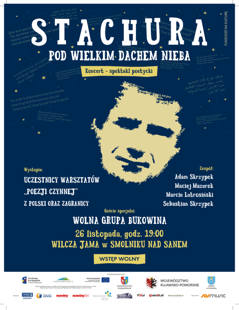 ця ь міс ! т и ч небо та с е и в в и всіх ебом ай ж Для ликим н ля! Нех е м Під в живе зе ля! й м Неха живе зе й Неха Il y a d sous e la plac e l Vive e grand fi pour tou la ter t r re! V mament le mond ive le e d ciel! u ciel. Vive la ter re! Hay sufic iente espa cio para to bajo el gr dos an techo del cielo. ¡Viva la tie rra! ¡Viva el cielo! ¡Viva la tie rra! POD WIELKIM DACHEM NIEBA ի նիք ա տ քի նքը! ն կ կի եր եղ ցե եր տ ց ա dos ր կ րը! կե ara to ա acio p . p մ s e ի lo te ա del cie uficien Koncert ի հ ցե երկ Hay s gran techo el cielo! ր ո l a e iv լ V ! jo ¡ a ց ! b a ո r ը բ կ կե կիր la tier ! ¡Viva ra la tier a iv տա ցե եր ¡V ց կե - spektakl poetycki Hay sufic iente espa cio para to bajo el gr dos an techo del cielo. ¡Viva la tie rra! ¡Viva el cielo! ¡Viva la tie rra! FUNDUSZE NA KULTURĘ STACHURA տանիքի եղ երկնքի տ ա կ ր ա մ երկինքը! բոլորի հա րը! կեցցե ի կ ր ե ե ց ց ե տակ կ րը! կեցցե երկի місця вистачить Для всіх м о б е н е небо! ким ехай жив Під вели земля! Н е в и ж й Неха я! иве земл Нехай ж onde m e l t u pour to du ciel. e c a l p ent e! e la Il y a d rand firmam l! Vive la terr g ie sous le rre! Vive le c te Vive la Dla wszys tkich starc zy Pod wielk im dachem miejsca nieba. Niech żyje ziemia! N iech żyje Niech żyje niebo! ziemia! zy miejsca tkich starc Dla wszys dachem nieba. niebo! im Pod wielk emia! Niech żyje zi je ży ch Nie ! je ziemia Niech ży Zespół: Wystąpią: Adam Skrzypek UCZESTNICY WARSZTATÓW Maciej Mazurek POEZJI CZYNNEJ” ” Z POLSKI ORAZ ZAGRANICY Marcin Lutrosiński Goście specjalni: Sebastian Skrzypek WOLNA GRUPA BUKOWINA 26 listopada, godz. 19:00 WILCZA JAMA w SMOLNIKU NAD SANEM WSTĘP WOLNY WSPÓŁORGANIZATORZY Projekt współfinansowany ze środków Unii Europejskiej z Europejskiego Funduszu Społecznego w ramach Regionalnego Programu Operacyjnego Województwa Podkarpackiego na lata 2014-2020. WOJEWÓDZTWO PODKARPACKIE GMINA LUTOWISKA PRODUCENT