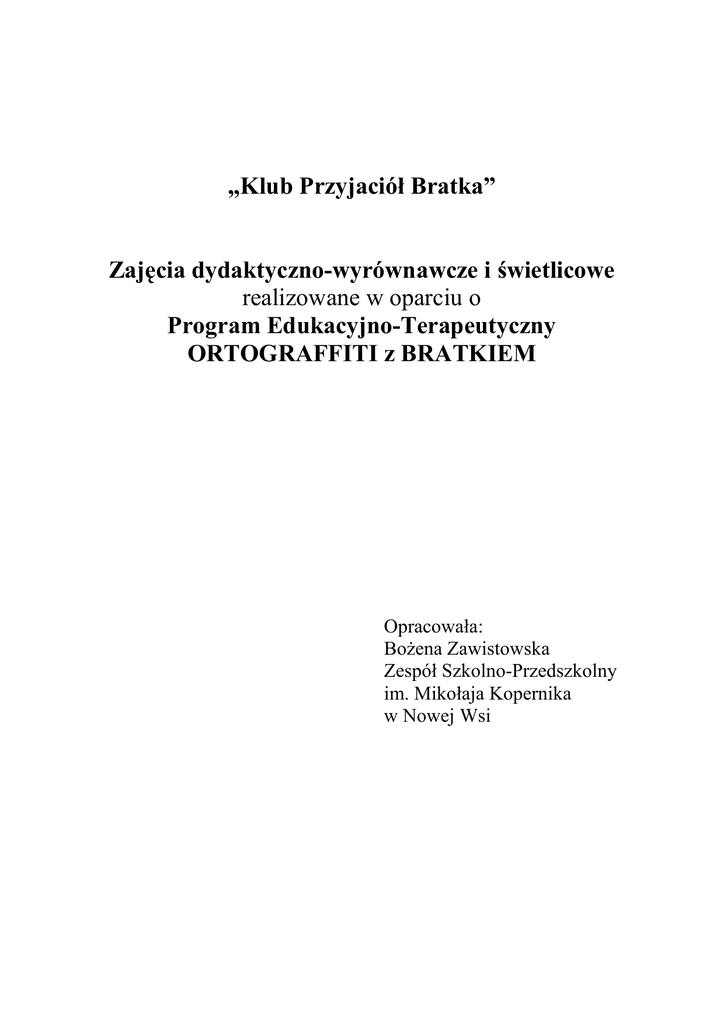 „Klub Przyjaciół Bratka” Zajęcia dydaktyczno-wyrównawcze i świetlicowe realizowane w oparciu o Program Edukacyjno-Terapeutyczny ORTOGRAFFITI z BRATKIEM Opracowała: BoŜena Zawistowska Zespół Szkolno-Przedszkolny im. Mikołaja Kopernika w Nowej Wsi Wprowadzenie Dzieci z klas I-III mają problemy z poprawną pod względem ortograficznym pisownią wyrazów. Ortografia wydaje się im trudna, przejawiają niechęć do wykonywania dodatkowych Ŝmudnych ćwiczeń. To właśnie skłoniło mnie do poszukiwania atrakcyjnych metod pracy z uczniami, którzy codziennie borykają się z róŜnych powodów z trudnościami w nauce czytania i pisania oraz w opanowaniu podstawowych wiadomości i umiejętności z zakresu ortografii. Doskonałym rozwiązaniem wydało mi się przystąpienie do ogólnopolskiego Programu Edukacyjno -Terapeutycznego ORTOGRAFFITI z Bratkiem. Walory terapeutyczne Programu oraz szeroki wachlarz pomocy dydaktycznych powoduje, Ŝe jest to metoda przyjazna, która moŜe sprawiać dziecku przyjemność i frajdę. 1. Charakterystyka Programu Edukacyjno -Terapeutycznego ORTOGRAFFITI z Bratkiem Program Edukacyjno -Terapeutyczny ORTOGRAFFITI z Bratkiem jest kontynuacją dobrze juŜ znanego programu ORTOGRAFFITI ( Wydawnictwo Pedagogiczne OPERON), ale tym razem przeznaczoną tylko do wdroŜenia na pierwszym etapie edukacyjnym (klasy I-III). Metoda ORTOGRAFFITI jest rekomendowana przez Polskie Towarzystwo Dysleksji. Program edukacyjno-terapeutyczny ''ORTOGRAFFITI z Bratkiem'' to kompleksowy system pomocy i długo oczekiwana przez nauczycieli nowość w pracy z dziećmi ze specyficznymi trudnościami w nauce czytania i pisania. MoŜe być wykorzystany do udzielania pomocy terapeutycznej wszystkim dzieciom w wieku 8-9 lat, u których występują trudności w nauce czytania i pisania, niezaleŜnie od tego skąd się one biorą. ORTOGRAFFITI z Bratkiem to innowacyjny model postępowania terapeutycznego autorstwa I. Mańkowskiej i M. RoŜyńskiej, który integruje działania nauczyciela, ucznia i rodzica w jeden spójny system. Uczestnicy Programu naleŜą do Klubu Przyjaciół Bratka. Seria ORTOGRAFFITI z Bratkiem dla uczniów klasy III składa się z 2 zeszytów ćwiczeń. Materiał ćwiczeniowy podzielono na jednostki zwane blokami. W kaŜdym zeszycie jest szesnaście bloków. Zestaw ćwiczeń zawarty w jednym bloku pozwala zrealizować zajęcia w wymiarze dwóch godzin dydaktycznych, z moŜliwością dostosowania do jednej godziny, jeśli jest taka potrzeba. Etapem wstępnym do pracy z ćwiczeniami jest bajka terapeutyczna. Po wysłuchaniu bajki następują związane z nią ćwiczenia składające się na fazę organizacyjno-mobilizującą zajęć. W fazie drugiej (wypracowania gotowości do pracy) odbywa się usprawnianie funkcji waŜnych w procesie uczenia się czytania i pisania: wzrokowo-przestrzennych, słuchowo-językowych i motorycznych. Podczas etapu pracy właściwej realizowany jest temat zajęć, zakończony ćwiczeniem relaksacyjnym. Blok kończy się podsumowaniem pracy i oceną wysiłku dziecka. Do kaŜdego bloku zajęć przygotowano kartę pracy domowej i oceny postępów dziecka. Pierwsza strona umoŜliwia kontynuowanie pracy w domu, a druga ma słuŜyć nauczycielowi i rodzicom. Nauczyciel po zakończeniu zajęć ocenia pracę dziecka i odznacza to na karcie oceny postępów dziecka. Dzięki temu rodzic jest na bieŜąco informowany o postępach dziecka. 2. Podstawowe załoŜenia metody ORTOGRAFFITI Metoda ORTOGRAFFITI pozwala indywidualizować pracę z uczniami w nauce czytania i pisania. MoŜna ją zaliczyć do metod praktycznych- zakłada systematyczne i wielokrotne powtarzanie danej czynności według określonego schematu. NaleŜy do metod psychomotorycznych z uwagi na zastosowanie ćwiczeń, których celem jest jednoczesne rozwijanie funkcji wzrokowoprzestrzennych, słuchowo-językowych, dotykowo-kinestetycznych i motorycznych oraz ich korelacja, a takŜe kształtowanie orientacji w schemacie ciała i przestrzeni. MoŜna ją zaliczyć do metod psychodydaktycznych (nauka czytania i pisania), poniewaŜ zastosowane ćwiczenia eliminują trudności w czytaniu, pisaniu oraz liczeniu. Metoda ORTOGRAFFITI umoŜliwia uczenie wielozmysłowe (polisensoryczne), poniewaŜ w procesie uczenia angaŜuje wzrok, słuch, ruch, dotyk, a takŜe smak i węch. 3. Zastosowanie metody ORTOGRAFFITI w edukacji i terapii Jednym z podstawowych załoŜeń metody jest jej uniwersalność. 1. Dla wszystkich dzieci z trudnościami w nauce czytania i pisania, niezaleŜnie od tego, skąd ich trudności się biorą. 2. Dla kaŜdego nauczyciela- dla specjalistów i nieposiadających kwalifikacji terapeutycznych nauczycieli. 3. Na kaŜde zajęcia- korekcyjno-kompensacyjne, dydaktyczno-wyrównawcze, rewalidacyjne i inne. 4. Do pracy w szkole i w domu- umoŜliwia podjęcie pracy samokształceniowej w domu. 4. Uwagi o realizacji programu Program przeznaczony jest dla uczniów korzystających z pomocy psychologiczno-pedagogicznej w formie zajęć dydaktyczno-wyrównawczych, a takŜe dla wszystkich uczniów z kl.IIIc (w ramach realizacji godziny opieki świetlicowej), po uzyskaniu pisemnej zgody rodziców na udział dzieci w tych zajęciach. Zajęcia będą się odbywały w wymiarze 2 godzin tygodniowo. Na realizację projektu przeznaczam rok szkolny 2013/2014. Termin rozpoczęcia – wrzesień 2013, termin zakończenia czerwiec 2014. Realizacja projektu pozwoli na uzupełnienie ewentualnych braków wiedzy i na ćwiczenie umiejętności polonistycznych (mówienie, czytanie, słuchanie, pisanie). Oprócz tego priorytetem na zajęciach będzie motywacja do nauki, zwiększenie szansy na dobry wynik testu trzecioklasisty. Projekt ma równieŜ na celu dowartościowanie dzieci oraz podniesienie ich samooceny. 5. Cele programu ORTOGRAFFITI z Bratkiem Głównym celem programu ORTOGRAFFITI z Bratkiem jest kształtowanie gotowości i doskonalenie umiejętności czytania i pisania. Cele szczegółowe: • •