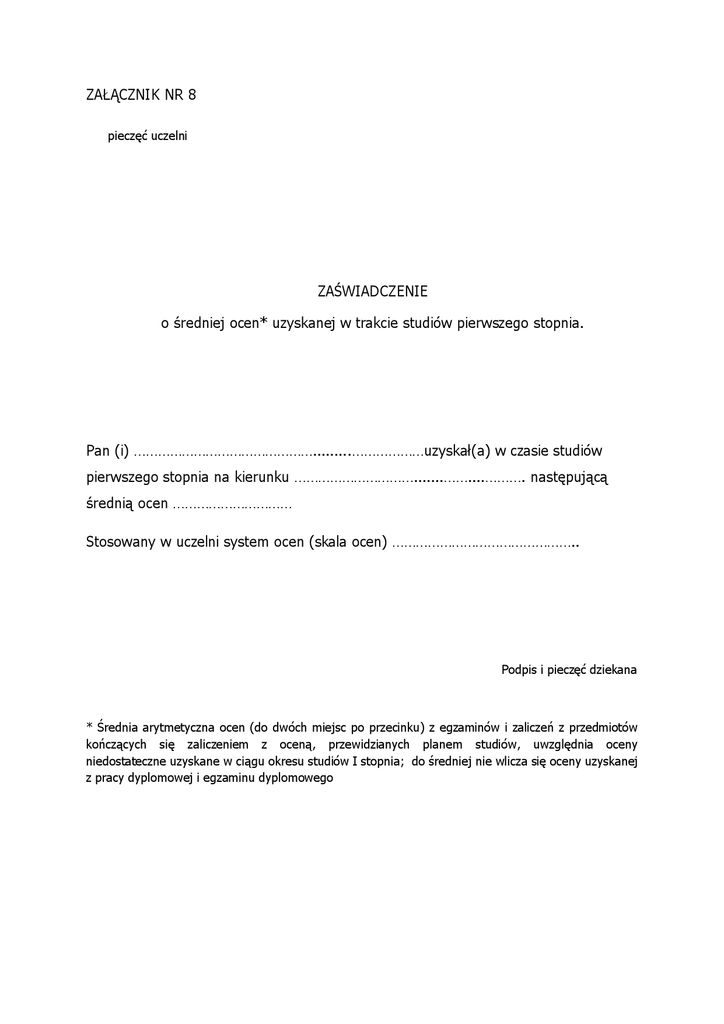 ZAŁĄCZNIK NR 8 pieczęć uczelni ZAŚWIADCZENIE o średniej ocen* uzyskanej w trakcie studiów pierwszego stopnia. Pan (i) ……………………………………….........………………uzyskał(a) w czasie studiów pierwszego stopnia na kierunku ………………………….......……....………. następującą średnią ocen ………………………… Stosowany w uczelni system ocen (skala ocen) ……………………………………….. Podpis i pieczęć dziekana * Średnia arytmetyczna ocen (do dwóch miejsc po przecinku) z egzaminów i zaliczeń z przedmiotów kończących się zaliczeniem z oceną, przewidzianych planem studiów, uwzględnia oceny niedostateczne uzyskane w ciągu okresu studiów I stopnia; do średniej nie wlicza się oceny uzyskanej z pracy dyplomowej i egzaminu dyplomowego