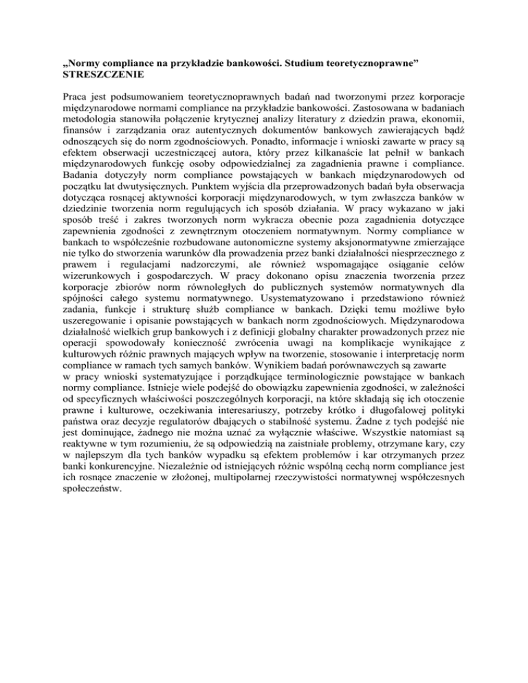 „Normy compliance na przykładzie bankowości. Studium teoretycznoprawne” STRESZCZENIE Praca jest podsumowaniem teoretycznoprawnych badań nad tworzonymi przez korporacje międzynarodowe normami compliance na przykładzie bankowości. Zastosowana w badaniach metodologia stanowiła połączenie krytycznej analizy literatury z dziedzin prawa, ekonomii, finansów i zarządzania oraz autentycznych dokumentów bankowych zawierających bądź odnoszących się do norm zgodnościowych. Ponadto, informacje i wnioski zawarte w pracy są efektem obserwacji uczestniczącej autora, który przez kilkanaście lat pełnił w bankach międzynarodowych funkcję osoby odpowiedzialnej za zagadnienia prawne i compliance. Badania dotyczyły norm compliance powstających w bankach międzynarodowych od początku lat dwutysięcznych. Punktem wyjścia dla przeprowadzonych badań była obserwacja dotycząca rosnącej aktywności korporacji międzynarodowych, w tym zwłaszcza banków w dziedzinie tworzenia norm regulujących ich sposób działania. W pracy wykazano w jaki sposób treść i zakres tworzonych norm wykracza obecnie poza zagadnienia dotyczące zapewnienia zgodności z zewnętrznym otoczeniem normatywnym. Normy compliance w bankach to współcześnie rozbudowane autonomiczne systemy aksjonormatywne zmierzające nie tylko do stworzenia warunków dla prowadzenia przez banki działalności niesprzecznego z prawem i regulacjami nadzorczymi, ale również wspomagające osiąganie celów wizerunkowych i gospodarczych. W pracy dokonano opisu znaczenia tworzenia przez korporacje zbiorów norm równoległych do publicznych systemów normatywnych dla spójności całego systemu normatywnego. Usystematyzowano i przedstawiono również zadania, funkcje i strukturę służb compliance w bankach. Dzięki temu możliwe było uszeregowanie i opisanie powstających w bankach norm zgodnościowych. Międzynarodowa działalność wielkich grup bankowych i z definicji globalny charakter prowadzonych przez nie operacji spowodowały konieczność zwrócenia uwagi na komplikacje wynikające z kulturowych różnic prawnych mających wpływ na tworzenie, stosowanie i interpretację norm compliance w ramach tych samych banków. Wynikiem badań porównawczych są zawarte w pracy wnioski systematyzujące i porządkujące terminologicznie powstające w bankach normy compliance. Istnieje wiele podejść do obowiązku zapewnienia zgodności, w zależności od specyficznych właściwości poszczególnych korporacji, na które składają się ich otoczenie prawne i kulturowe, oczekiwania interesariuszy, potrzeby krótko i długofalowej polityki państwa oraz decyzje regulatorów dbających o stabilność systemu. Żadne z tych podejść nie jest dominujące, żadnego nie można uznać za wyłącznie właściwe. Wszystkie natomiast są reaktywne w tym rozumieniu, że są odpowiedzią na zaistniałe problemy, otrzymane kary, czy w najlepszym dla tych banków wypadku są efektem problemów i kar otrzymanych przez banki konkurencyjne. Niezależnie od istniejących różnic wspólną cechą norm compliance jest ich rosnące znaczenie w złożonej, multipolarnej rzeczywistości normatywnej współczesnych społeczeństw.