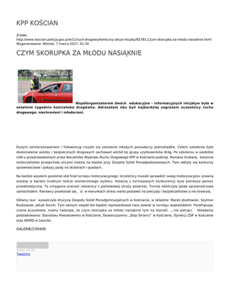 KPP KOŚCIAN Źródło: http://www.koscian.policja.gov.pl/w11/ruch-drogowy/konkursy-akcje-inicjaty/62781,Czym-skorupka-za-mlodu-nasiaknie.html Wygenerowano: Wtorek, 7 marca 2017, 01:34 CZYM SKORUPKA ZA MŁODU NASIĄKNIE Współorganizatorem dwóch edukacyjno – informacyjnych inicjatyw była w ostatnim tygodniu kościańska drogówka. Adresatem obu byli najbardziej zagrożeni uczestnicy ruchu drogowego: niechronieni i młodociani. Dużym zainteresowaniem i frekwencją ciszyło się szkolenie młodych posiadaczy jednośladów. Celem szkolenia było doskonalenie wiedzy i bezpiecznych drogowych zachowań wśród tej grupy użytkowników dróg. Po szkoleniu w siedzibie LOK-u przeprowadzonym przez Naczelnika Wydziału Ruchu Drogowego KPP w Kościanie podinsp. Romana Grabarę, kolumna motocyklistów przejechała ulicami miasta na boisko przy Zespole Szkół Ponadpodstawowych. Tam odbyły się konkursy sprawnościowe i pokazy jazdy na skuterach i quadach. Na bardzo wysokim poziomie stał finał turnieju motoryzacyjnego. Uczestnicy musieli sprawdzić swoją motoryzacyjno- prawną wiedzę w bardzo trudnym teście wielokrotnego wyboru. Kolejną z turniejowych konkurencji była pierwsza pomoc przedmedyczna. Te zmagania oceniali ratownicy z państwowej straży pożarnej. Turniej wieńczyła jazda sprawnościowa samochodem. Kierowcy przekonali się , iż w warunkach stresu warto postawić na precyzję i bezpieczeństwo a nie brawurę. Główny laur wywalczyła drużyna Zespołu Szkół Ponadgimnazjalnych w Kościanie, w składzie: Marek Józefowski, Szymon Ruskowiak, Jakub Stucki. Tym samym zespół ten będzie reprezentował nasz powiat w turnieju wojewódzkim. Parafrazując znane przysłowie, mamy nadzieje, że czym skorupka za młodu nasiąknie tym na starość .…nie potrąci. Składamy podziękowania: Starostwu Powiatowemu w Kościanie, Stowarzyszeniu „Stop Śmierci” w Kościanie, Dyrekcji ZSP w Kościanie oraz WORD w Lesznie. GALERIE/230409 Ocena: 0/5 (0) Tweetnij