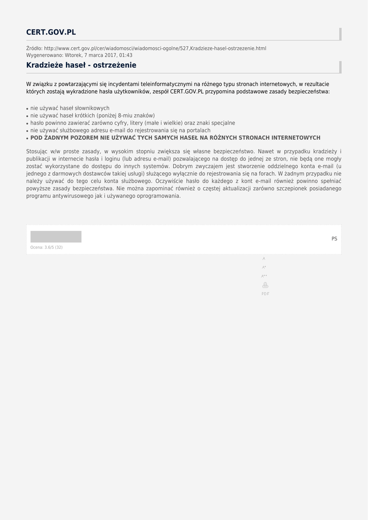 CERT.GOV.PL Źródło: http://www.cert.gov.pl/cer/wiadomosci/wiadomosci-ogolne/527,Kradzieze-hasel-ostrzezenie.html Wygenerowano: Wtorek, 7 marca 2017, 01:43 Kradzieże haseł - ostrzeżenie W związku z powtarzającymi się incydentami teleinformatycznymi na różnego typu stronach internetowych, w rezultacie których zostają wykradzione hasła użytkowników, zespół CERT.GOV.PL przypomina podstawowe zasady bezpieczeństwa: ● ● ● ● ● nie używać haseł słownikowych nie używać haseł krótkich (poniżej 8-miu znaków) hasło powinno zawierać zarówno cyfry, litery (małe i wielkie) oraz znaki specjalne nie używać służbowego adresu e-mail do rejestrowania się na portalach POD ŻADNYM POZOREM NIE UŻYWAĆ TYCH SAMYCH HASEŁ NA RÓŻNYCH STRONACH INTERNETOWYCH Stosując w/w proste zasady, w wysokim stopniu zwiększa się własne bezpieczeństwo. Nawet w przypadku kradzieży i publikacji w internecie hasła i loginu (lub adresu e-mail) pozwalającego na dostęp do jednej ze stron, nie będą one mogły zostać wykorzystane do dostępu do innych systemów. Dobrym zwyczajem jest stworzenie oddzielnego konta e-mail (u jednego z darmowych dostawców takiej usługi) służącego wyłącznie do rejestrowania się na forach. W żadnym przypadku nie należy używać do tego celu konta służbowego. Oczywiście hasło do każdego z kont e-mail również powinno spełniać powyższe zasady bezpieczeństwa. Nie można zapominać również o częstej aktualizacji zarówno szczepionek posiadanego programu antywirusowego jak i używanego oprogramowania. PS Ocena: 3.6/5 (32)