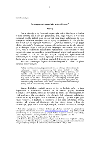1 Stanisław Judycki Dwa argumenty przeciwko materializmowi∗ Prolog Duch, ukazujący się Faustowi na początku dzieła Goethego, wzbudza w nim okropny lęk, Faust jest przerażony tym, kogo wzywał i w końcu zobaczył, szybko jednak stara się przyjąć pozę kogoś należącego do tego samego rodzaju istot, co zjawa - na co słyszy taką odpowiedź: „Du gleichst dem Geist, den du begreifst, Nicht mir!” 1 („Równyś duchowi, coś go pojąć zdolny, nie mnie”). Przytaczam to znane sformułowanie po to, aby używać go w dalszym ciągu w roli przykładu bogatego znaczeniowo wyrażenia, które, wraz z wszystkimi pozostałymi wyrażeniami i znaczeniami w nich zawartymi, przez zwolenników materialistycznej interpretacji umysłu musi być uznane za coś, co nie jest niczym więcej niż wyładowaniami elektrycznymi w mózgu Fausta, będącego odbiorcą komunikatu ze strony ducha (duch, oczywiście, zgodnie ze swoją definicją, nie ma mózgu). W często cytowanym fragmencie Monadologii G.W. Leibniz tak pisze na temat natury umysłu: Należy wszakże przyznać, że postrzeżenie i to, co od niego zależy, nie da się wytłumaczyć racjami mechanicznymi, tzn. przez kształty i ruchy. Przypuściwszy zaś, że istnieje maszyna, której budowa pozwala, aby myślała, czuła, miewała postrzeżenia, będzie można pomyśleć ją, z zachowaniem tych samych proporcji, tak powiększoną, by można było do niej wejść jak do młyna. Założywszy to, odnaleźlibyśmy wewnątrz przy zwiedzaniu jej tylko części, które popychają się wzajemnie, nigdy jednak nic, co tłumaczyłoby postrzeżenie. Toteż trzeba szukać tego właśnie w substancji prostej, a nie w rzeczy złożonej, czy też w machinie.2 Warto dokładnie zwrócić uwagę na to, co Leibniz mówi w tym fragmencie, a mianowicie twierdzi on, iż nawet gdyby istniała maszyna, która byłaby zdolna do myślenia, do czucia i do spostrzegania, to i tak podstawy dla wszystkich tych zdolności lub własności należałoby szukać nie w tej maszynie, lecz w substancji prostej. Zgodnie z tym, gdy Faust rozmawia z duchem, to rozmawia z nim jako substancja prosta, chociaż, jak wiemy od Goethego, nie jest równy temu, z kim się komunikuje, gdyż wśród substancji prostych, a więc i duchowych, istnieje Jest tekst wystąpienia w trakcie dyskusji pt. „Natura umysłu” w: „Internetowe Czasopismo Filozoficzne Diametros” www.diametros.iphils.uj.edu.pl (luty 2005); został opublikowany w: Z. Muszyński (red.), Umysł. Natura i sposób istnienia. Trzy debaty, Lublin: Wydawnictwo Uniwersytetu Marii Curie-Skłodowskiej 2010, s. 81-93. 1 J.W. Goethe, Faust. Eine Trag die. Erster Teil, 486-518. 2 G.W. Leibniz, Zasady filozofii, czyli monadologia, tłum. S. Cichowicz [w:] G.W. Leibniz, Wyznanie wiary filozofa, Rozprawa metafizyczna, Monadologia, Zasady natury i łaski oraz inne pisma filozoficzne (red .S. Cichowicz), Warszawa: PWN 1969, s. 300. 2 gradacja ontyczna i epistemiczna, zróżnicowanie co do sposobu istnienia i co do zdolności do pojmowania. Zamieszczone niżej dwa argumenty skierowane są przeciwko supozycji, że materia może myśleć, czuć, spostrzegać itp. Są to tylko dwa argumenty, pełne przeciwstawienie się dominującemu dziś w filozofii materializmowi w kwestii natury umysłu ludzkiego wymaga o wiele obszerniejszych rozważań. Częściowo cel ten starałem się zrealizować w książce Świadomość i pamięć,3 aczkolwiek w tekście tym nie pojawiają się dwa rozważane tutaj argumenty. Pierwszy z nich dotyczy często formułowanej sugestii, że ogromna komplikacja mózgu ludzkiego stanowi uwiarygodnienie dla przypuszczenia, że to mózg jest podmiotem naszego, jak się nam zdaje, myślenia. Drugi argument ma charakter bardziej defensywny, tzn. pokazuje, że nigdy nie będzie możliwa, sugerowana przez materializm, redukcja tego, co świadome i mentalne, do tego, co materialne. Pewną inspirację stanowiły dla mnie ostatnie analizy A. Plantingi, zawarte w roboczej wersji jego artykułu Against Materialism, którą miałem do dyspozycji. Plantinga przedstawia tam rozważanie, które określa jako Replacement Argument oraz, nawiązującą do Leibniza, analizę określoną przez niego jako Argument from Impossibility. W pierwszym wypadku chodzi o to, że w fikcyjnej sytuacji, w której mój mózg zostałby zastąpiony idealną jego kopią, lecz kopią złożoną z numerycznie odmiennych składników, wtedy, mimo tej zamiany, ‘ja’ pozostałbym taki sam, a stąd należy wnosić, iż ‘ja’ i mój mózg, to dwa różne byty. W drugim wypadku, Plantinga, przywołując powyżej przedstawiony cytat z Monadologii Leibniza, wskazuje na całkowitą niemożliwość przypuszczenia, iż jakikolwiek zbiór neuronów może myśleć, tak jak niemożliwe jest do pomyślenia to, że, powiedzmy, słoń jest liczbą siedem. Plantinga bierze także pod uwagę racje na rzecz materializmu, wśród których za najpoważniejszy uważa argument odwołujący się do stwierdzanych empirycznie lokalizacji w różnych obszarach mózgu korelatów określonych funkcji świadomego umysłu i do faktu neuronalnej zależności wszystkich znanych nam zjawisk umysłowych. Na to reaguje analizą wykazującą, że zależność to jedna rzecz, a rzekoma identyczność sfery świadomej i mentalnej z mózgiem, to druga rzecz: aktywność mózgu należy uznać za konieczny warunek aktywności mentalnej, lecz z tego nie wynika, że aktywność mentalna jest aktywnością mózgu, nie wynika, że jedno jest po prostu drugim. Swoje rozważania kończy stwierdzeniem, iż istnieją bardzo poważne argumenty przeciwko materializmowi, lecz nie istnieje żaden doniosły argument na rzecz materializmu - dlaczego więc, pyta, ktoś miałby chcieć być materialistą? Dwa zamieszczone poniżej argumenty przeciwko materializmowi idą wprawdzie w innych kierunkach niż rozumowania Plantingi, lecz gdyby okazały się trafne, to mogłyby stanowić dodatkowe podbudowanie
