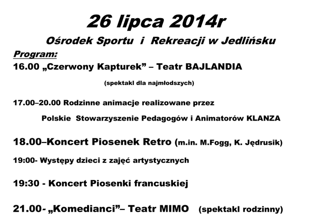 26 lipca 2014r Ośrodek Sportu i Rekreacji w Jedlińsku Program: 16.00 „Czerwony Kapturek” – Teatr BAJLANDIA (spektakl dla najmłodszych) 17.00–20.00 Rodzinne animacje realizowane przez Polskie Stowarzyszenie Pedagogów i Animatorów KLANZA 18.00–Koncert Piosenek Retro (m.in. M.Fogg, K. Jędrusik) 19:00- Występy dzieci z zajęć artystycznych 19:30 - Koncert Piosenki francuskiej 21.00- „Komedianci”– Teatr MIMO (spektakl rodzinny)