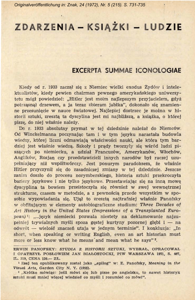 Originalveröffentlichung in: Znak, 24 (1972), Nr. 5 (215). S. 731-735 ZDARZE N IA KS I AZKI LUD ZIE EXCERPTA SU MMAE ICO NOLO GIAE Kiedy od r. 1933 zaczq£ si~ z Niemiec wielki exodus Zyd6w i intelektualist6w, kiedy pewien chairman pewnego amerykaiiskiego uniwersytetu m 6gI powiedziec: "Hitler jest moim najlepszym przyjacielem, gdyz potr zqsnql drzewem, a ja teraz zbieram jablka", dokonalo si~ znamienne przesuni~cie w nauce swiatowej. Najlepiej dostrzec je mozna w historii sztuki, zresztq ta dyscylina jest mi najblizszq, a ksiqzka, 0 kt6rej pisz~, do niej wlasnie nalezy. Do r . 1933 absolutny prymat w tej dziedzinie nalezal do Niemc6w. Od Winckelmanna poczynajqc tam i w tym j~zyku narastaia budowla wiedzy, kt6rej liczni odmawiajq wlasciwosci nauki, ale kt6ra tym bardziej jest wlasnie wiedzq. Szkoly i prqdy tworzyly si~ wsr6d ludzi pisZqcych po niemiecku, a udzial Francuz6w, Amerykan6w, Wloch6w, Anglik6w , Rosjan czy przedstawicieli innych narod6w byl raczej uzupelniajqcy niz wsp6ltw6rczy. Jest ponurym paradoksem, ze wlasnie Hitler przyczynil si~ do zasadniczej zmiany w tej dziedzinie. Jeszcze zanim doszlo do procesu norymberskiego, historia sztuki przekroczyla bariery j~zykowe i nie tylko j~zykowe . Przestaw iajqc si~ na innq mow~ dys cyplina ta bowiem przeistoczyla si~ r6wniez w swej wewn~trznej strukturze, czasem w metodzie, a z pewnosci q przede wszystkim w sposobie wypowiadania si~. Ujql to zresztq najtrafniej wlasnie Panofsky w obfitujqcym w elementy autobiograficzne studium: Three Decades of Art History in the United States (Impression s of a Transplanted European) 1: "... j~zyk niemiecki pozwala niestety na deklamowanie najzupelniej trywialnych mySli spoza g~stej kurtyny pozornej gl~bi i - na odwr6t - wielosc znaczeii utaja w jednym terminie". I konkluzja : "In short, w hen s peaking or writing English, even an art historian must m ore or less know what he means' and mean what he says" 2. ERW IN PANOFSKY: STUDIA Z HISTORII SZTUKI, WYBRAI:., OPRACOWAI:. I O P ATRZYI:. POSI:.OWIEM JAN BIAI:.OSTOCKI, PIW WARSZAWA 1971, S. 467, I L . 319, CENA 120.- ZI:.. 1 Esej ten opublikowany zostal jako "epilog" w : E. Panofsky. Meaning in thp Visual Arts, Garden City N. Y. (1955). I " Kr6tko m6wi<jc: jesli m6wi si~ iub pisze po angieisku, to nawet historyk sztuk i m usi mniej wl~cej wiedziec co mysli 1 rozumiec co m6wl". 732 ZDARZENIA - KSIAi KI - LUDZIE Obecnie po skromnych jask61kach (bodaj pierwsze wiElksze tlumaczenie Panofskyego na nasz jElzyk to byl Gotyk i scholastyka drukowany w r . 1958 w Znaku), otrzymalismy nareszcie dui:y wyb6r pism tego znakomitego uczonego, kt6ry zmarl w r. 1968, pozostawiajqc tym niewqtpliwie ogromnq lukEl w historii sztuki, ale r6wnoczesnie pr zekazujllc nastElpnym pokoleniom nie tylko ogromny ladunek mysli, ale r6wniei: bardzo licznq gruPEl uczonych, k t6rych bezposrednio lub posrednio wychowal, a wiElc rzecz m oi:na smialo: szkolEl. Przyblii:enie wyboru jego dziel szerszemu krElgowi odbiore6w w naszym kraju jest niewqtpliwie zaslugq g16wnego apostola ikonologii w Polsce - Jana Bialostockiego, kt6ry pokaznych rozmiar6w tom nie tylko opatrzy1 przedmowq i poslowiem 0 charakterze zarysu biografieznego, ale spowodowal podjElcie trudu przekladu przez r6znyeh tlumaczy i teksty ieh u jednolicil, a ponadto ksiqi:kEl wyposai:yl w bibliografiEl prac uczonego i zadbal 0 pokazny zestaw ilustracji. Erwin Panofsky urodzil siEl w Hannowerze, studiowal we Fryburgu i Berlinie, ale definitywne uksztaltowanie siEl jego osobowosci dokonalo siEl w Hamburgu, w kn;gu intelektualist6w skupionych wok6l slynnej biblioteki Aby War burga. Jest szezElsliwym zbiegiem okolicznosci, i:e ukazanie siEl wyboru jego pism poprzedzilo w ubieglym r ok u opublikowanie polski ego przekladu Esseju 0 czlowieku Cassirera 3, bEldqcego streszczeniem poglqd6w filozofa, kt6ry wywar1 ogromny wplyw na m etodologiczne zasady wyloi:one przez Panofsky ego. W nieco bud denbrookowskiej atmosferze starego hanzeatyckiego miasta, 0 wiele bardziej nii: inne w tym k ra ju otwar tego n a swiat, dokonalo siEl uformowanie nie tylko tego uczonego, ale calego srodowiska naukowego, k t6re w ok resie dojscia Hitlera do wladzy wyemigrowa1o do Anglii i Stan6w Zjednoczonyeh. I zn6w p aradoks: w okresie gdy na stosaeh plonElly dziela Hein ego, kiedy podj~to pierwsze dzialania prowadzqce w k onsekwencji do ludob6jstwa, Hamburg opuscili nie tylko uczeni pochodzenia semickiego, ale taki:e cala biblioteka Warburga, kt6ra przeniesiona do Anglii stala siEl tam jednq Z najaktywniejszych plac6wek naukowy eh znanych pod naZWq "War burg and Courtauld Institute", poczqtkowo kierowana przez Saxla, obeenie pr zez Gombricha. Tw6rczosc naukowa Panofsk yego, a sl owo "tw6rczosc" jest tu wyjqtkowo uzasadnione, gdyi: byl on mistrzem nie tylko mysli lecz i pi6ra, rozpada siEl wiElc na dwie jak gdyby f azy : niemieckq i angielskq (czy raczej amerykanskq). Poza wlasciwosciami jElzykowymi, 0 kt6rych byla juz mowa, nie ma miEldzy tymi dwoma etapami jakiejs ostrej granicy i wczesna Idea 4 nalezy n adal do czolowych osiqgniElc uczonego. J est to • E . Cassirer. E sej 0 cz!owieku, W st~p d o f!l ozofit kultur y , Warszawa 1971. • E . Panofsk y , I dea , etn Beitra g zur B egriffsgeschtchte de r iIl ter en Kunstth eorie, L eipzig-Berlin 1924. Drugie , poprawione w ydanie tej ksiqzki u kaza lo si~ w r. 11160 W Be rlinie, a t!umaczenie angie lskie d opiero w r . 196B, a wi~c w rok u smierci au- ZDARZENIA - KSIA2KI - LUDZIE 733 po prostu droga poszerzania horyzont6w i doskonalenia warsztatu naukow ego, droga od zalozen metodologicznych i studi6w nad daw nymi doktrynami, do wcielenia w zycie zasad i do ujrzenia dziej6w sztuki w inny niz dotychczas spos6b. W tym pobie:i:nym ' om6wieniu nie rna oczywiscie miejsca na relacjonowanie metody ikonologicznej, kt6rej t w6rcq byl Panofsky : zreszt::j w wydanym obecnie tomie czytelnik znajdzie odautorskie jej uj~cie, jak tez wazny k omentarz Bialostockiego. Podkreslic trzeba z jednej strony, ze istotniejsze od kanon6w 