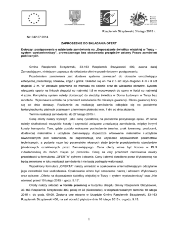 GMINA RZEPIENNIK STRZYŻEWSKI Rzepiennik Strzyżewski, 3 lutego 2015 r. Nr: 042.27.2014 ZAPROSZENIE DO SKŁADANIA OFERT Dotyczy: postępowania o udzielenie zamówienia na „Doposażenie świetlicy wiejskiej w Turzy – system wystawienniczy”, prowadzonego bez stosowania przepisów ustawy Prawo zamówień publicznych. Gmina Rzepiennik Strzyżewski, 33-163 Rzepiennik Strzyżewski 400, zwana dalej Zamawiającym, niniejszym zaprasza do składania ofert w przedmiotowym postępowaniu. Przedmiotem zamówienia jest dostawa systemu zawieszeń do obrazów umożliwiający estetyczną prezentację obrazów, zdjęć i grafik. Składać się on ma z 5 szt szyn długości 4 m i 3 szt długości 2 m. W zestawie galanteria do montażu na ścianie oraz do wieszania obrazów. System wieszania oparty na linkach długości co najmniej 1,5 m mocowanych do szyny w ilości co najmniej 4 szt/m. Kompletny system należy dostarczyć do siedziby świetlicy w Domu Ludowym w Turzy bez montażu. Wykonawca udziela na przedmiot zamówienia 24 miesiące gwarancji. Okres gwarancji liczy się od dnia dostawy. Rozliczenie za realizację zamówienia odbędzie się na podstawie faktury/rachunku płatnych przelewem z terminem płatności min. 7 dni od dnia złożenia. Termin realizacji zamówienia: do 27 lutego 2015 r. Cenę oferty należy wyliczyć jako cenę ryczałtową na podstawie powyższego opisu. W cenie należy skalkulować wszystkie koszty i czynności związane z realizacją zamówienia, między innymi koszty transportu. Tam, gdzie zostało wskazane pochodzenie (marka, znak towarowy, producent, dostawca) materiałów i urządzeń Zamawiający dopuszcza oferowanie materiałów i urządzeń równoważnych pod warunkiem, że zagwarantują one uzyskanie odpowiednich parametrów technicznych, a podanie nazw lub parametrów własnych służy jedynie przedstawieniu standardów jakościowych oczekiwanych przez Zamawiającego. Cena oferty winna być liczona w PLN z dokładnością do dwóch miejsc po przecinku. Cenę za cały przedmiot zamówienia należy przedstawić w formularzu „OFERTA” cyfrowo i słownie. Ceny i stawki określone przez Wykonawcę nie będą zmieniane w toku realizacji zamówienia i nie będą podlegały waloryzacji. Wypełniony formularz „OFERTA” należy umieścić w opakowaniu uniemożliwiającym odczytanie jego zawartości bez uszkodzenia. Opakowanie winno być oznaczone nazwą i adresem Wykonawcy oraz opisane: „Oferta na doposażenie świetlicy wiejskiej w Turzy – system wystawienniczy” oraz „Nie otwierać przed 10 lutego 2015 r. godz. 9.15”. Oferty należy składać w formie pisemnej w budynku Urzędu Gminy Rzepiennik Strzyżewski, 33-163 Rzepiennik Strzyżewski 400, pokój nr 33 (Sekretariat), w nieprzekraczalnym terminie 10 lutego 2015 r. do godz. 09:00. Zostaną one otwarte w Urzędzie Gminy Rzepiennik Strzyżewski, 33-163 Rzepiennik Strzyżewski 400, na sali obrad (I piętro) w dniu 10 lutego 2015 r. o godz. 9.15. 1 Zamawiający zastrzega sobie prawo poprawy oczywistych omyłek pisarskich, oczywistych omyłek rachunkowych z uwzględnieniem konsekwencji rachunkowych dokonanych poprawek, innych omyłek niepowodujących istotnych zmian w treści oferty. Każdy wykonawca może złożyć tylko jedną ofertę, w przeciwnym wypadku jego oferty będą odrzucone. Zamawiający udzieli zamówienia wykonawcy, który przedłoży ofertę z najtańszą ceną. W przypadku, gdy ceny ofert przekroczą kwotę jaką zamawiający może przeznaczyć na realizację zamówienia lub nie wpłynie żadna oferta, postępowanie będzie unieważnione. Zamawiający zastrzega sobie również prawo unieważnienia postępowania w innych uzasadnionych przypadkach. W przypadku, gdy Wykonawca, którego oferta została wybrana będzie uchylał się od zawarcia umowy, Zamawiający może wybrać ofertę najkorzystniejszą spośród pozostałych. Osobami uprawnionymi do kontaktów z Wykonawcami są: Grzegorz Szymański i Józef Hołda, tel. (14) 653-55-30, fax (14) 653-05-02. Wójt mgr inż. Marek Karaś 2