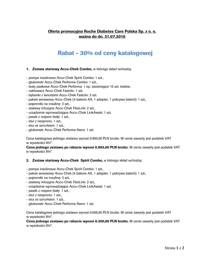 Oferta promocyjna Roche Diabetes Care Polska Sp. z o. o. ważna do dn. 31.07.2016 Rabat - 30% od ceny katalogowej 1. Zestaw startowy Accu-Chek Combo, w którego skład wchodzą: - pompa insulinowa Accu-Chek Spirit Combo: 1 szt., - glukometr Accu-Chek Performa Combo: 1 szt., - testy paskowe Accu-Chek Performa: 1 op. zawierające 10 szt. testów, - nakłuwacz Accu-Chek Fastclix: 1 szt. - bębenki z lancetami Accu-Chek Fastclix: 2 szt. - pakiet serwisowy Accu-Chek (4 baterie AA, 1 adapter, 1 pokrywa baterii): 1 szt., - pojemniki na insulinę: 3 szt., - zestawy infuzyjne Accu-Chek FlexLink: 2 szt., - urządzenie wprowadzające Accu-Chek LinkAssist: 1 szt. - pasek z rzepem biały: 1 szt., - etui z neoprenu: 1 szt., - etui ze sznurkiem: 1 szt., - glukometr Accu-Chek Performa Nano: 1 szt. Cena katalogowa jednego zestawu wynosi 9.990,00 PLN brutto. W cenie zawarty jest podatek VAT w wysokości 8%*. Cena jednego zestawu po rabacie wynosi 6.993,00 PLN brutto. W cenie zawarty jest podatek VAT w wysokości 8%*. 2. Zestaw startowy Accu-Chek Spirit Combo, w którego skład wchodzą: - pompa insulinowa Accu-Chek Spirit Combo: 1 szt., - pakiet serwisowy Accu-Chek (4 baterie AA, 1 adapter, 1 pokrywa baterii): 1 szt., - pojemniki na insulinę: 3 szt., - zestawy infuzyjne Accu-Chek FlexLink: 2 szt., - urządzenie wprowadzające Accu-Chek LinkAssist: 1 szt. - pasek z rzepem biały: 1 szt., - etui z neoprenu: 1 szt., - etui ze sznurkiem: 1 szt., - glukometr Accu-Chek Performa Nano: 1 szt. Cena katalogowa jednego zestawu wynosi 9.000,00 PLN brutto. W cenie zawarty jest podatek VAT w wysokości 8%*. Cena jednego zestawu po rabacie wynosi 6.300,00 PLN brutto. W cenie zawarty jest podatek VAT w wysokości 8%*. Strona 1 z 2 Warunki składania zamówień, dostawy i płatności: § zamówienia można składać: - w mailu na adres: [email protected] - telefonicznie: 22 481 54 05 - faksem: 22 481 55 94 lub bezpośrednio u lokalnego Przedstawiciela Medycznego Roche, § zamówiony towar zostanie dostarczony na wskazany adres i w uzgodnionym terminie za pośrednictwem firmy kurierskiej, § zapłata za towar: przedpłata * Od dnia wejścia w życie przepisów prawa zmieniających wysokość stawki podatku od towarów i usług (podatek VAT) do cen netto doliczany będzie podatek VAT w wysokości wynikającej z przepisów prawa. Strona 2 z 2