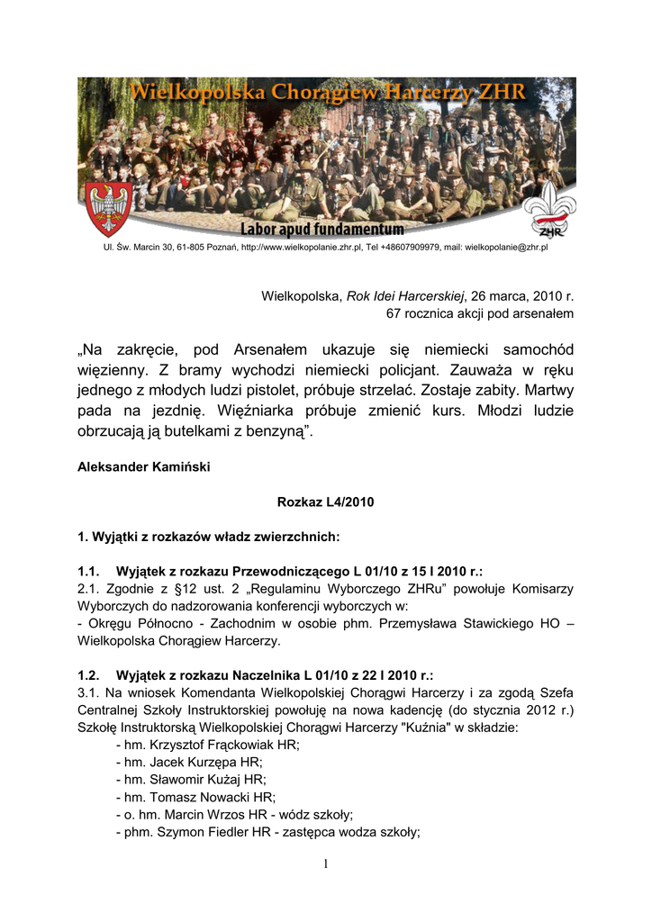 Ul. Św. Marcin 30, 61-805 Poznań, http://www.wielkopolanie.zhr.pl, Tel +48607909979, mail: [email protected] Wielkopolska, Rok Idei Harcerskiej, 26 marca, 2010 r. 67 rocznica akcji pod arsenałem „Na zakręcie, pod Arsenałem ukazuje się niemiecki samochód więzienny. Z bramy wychodzi niemiecki policjant. Zauważa w ręku jednego z młodych ludzi pistolet, próbuje strzelać. Zostaje zabity. Martwy pada na jezdnię. Więźniarka próbuje zmienić kurs. Młodzi ludzie obrzucają ją butelkami z benzyną”. Aleksander Kamiński Rozkaz L4/2010 1. Wyjątki z rozkazów władz zwierzchnich: 1.1. Wyjątek z rozkazu Przewodniczącego L 01/10 z 15 I 2010 r.: 2.1. Zgodnie z §12 ust. 2 „Regulaminu Wyborczego ZHRu” powołuje Komisarzy Wyborczych do nadzorowania konferencji wyborczych w: - Okręgu Północno - Zachodnim w osobie phm. Przemysława Stawickiego HO – Wielkopolska Chorągiew Harcerzy. 1.2. Wyjątek z rozkazu Naczelnika L 01/10 z 22 I 2010 r.: 3.1. Na wniosek Komendanta Wielkopolskiej Chorągwi Harcerzy i za zgodą Szefa Centralnej Szkoły Instruktorskiej powołuję na nowa kadencję (do stycznia 2012 r.) Szkołę Instruktorską Wielkopolskiej Chorągwi Harcerzy "Kuźnia" w składzie: - hm. Krzysztof Frąckowiak HR; - hm. Jacek Kurzępa HR; - hm. Sławomir Kużaj HR; - hm. Tomasz Nowacki HR; - o. hm. Marcin Wrzos HR - wódz szkoły; - phm. Szymon Fiedler HR - zastępca wodza szkoły; 1 - phm. Krzysztof Lis HR; - phm. Wojciech Maciaczyk HR; - phm. Mateusz Mayer HR; - pwd. Tomasz Ceranek HR; - pwd. Jakub Krajewski HO; - pwd. Michał Szmaj HO; - pwd. Jan Szmajs HO; - pwd. Piotr Urbański HO; i udzielam jej zgody na prowadzenie kursów podharcmistrzowskich. 1.3. Wyjątek z rozkazu Naczelnika L 02/10 z 13 II 2010 r.: 1.1. Na wniosek Szefa Wydziału Harcerzy powierzam Wielkopolskiej Chorągwi Harcerzy organizację tego rocznego Turnieju Drużyn Puszczańskich oraz mianuję na funkcje Komendanta Turnieju Drużyn Puszczańskich 2010: - phm. Szymona Fiedlera HR. 1.4. Wyjątki z rozkazu Naczelnika SL 03/10 z 22 II 2010 r.: 1.2. Zaliczam służbę instruktorską za rok 2009 i wpisuje na listę instruktorów druhów: (-) Wielkopolska Chorągiew Harcerzy: - hm. Wojciech Cichy HR, - hm. Krzysztof Frąckowiak HR, - hm. Jacek Kurzępa HR, - hm. Sławomir Kużaj HR, - hm. Tomasz Łęcki HR, - hm. Tomasz Nowacki HR, - hm. Stanisław Stawski HR, - o. hm. Marcin Wrzos HR. 3.1. Udzielam pochwały za przedterminowe przeprowadzenie spisu środowisk w systemie „Baobab“: - hm. Sławomirowi Kużajowi HR – Komendant Wielkopolskiej Chorągwi Harcerzy. 1.5. Wyjątki z rozkazu Naczelnika L 03/10 z 13 III 2010 r.: 1.2. Na wniosek Komisji Harcmistrzowskiej otwieram próbę na stopień harcmistrza druhom: - phm. Szymonowi Fiedlerowi HR (Wielkopolska Chorągiew Harcerzy), opiekun próby: hm. Marcin Dorosz HR. 3.1. Z dniem 27 lutego 2010 na wniosek Zbiórki Wyborczej Instruktorów Wielkopolskiej Chorągwi Harcerzy, pozostawiam na kolejną kadencję na funkcji Komendanta Wielkopolskiej Chorągwi Harcerzy hm. Sławomira Kużaja HR, życząc mu dalszych sukcesów, wytrwałości i radości w służbie. 2 3.2. Z dniem 27 lutego 2010 na wniosek Komendanta Wielkopolskiej Chorągwi Harcerzy, nadaję uprawnienia do prowadzenia prób podharcmistrzowskich do dnia 27 lutego 2012 roku, Komisji Instruktorskiej Wielkopolskiej Chorągwi Harcerzy. 1.6. Wyjątek z rozkazu Przewodniczącego L 03/10 z 15 III 2010 r.: 2.1. W związku ze zbliżającym się terminem zakończenia Spisu ZHR za rok 2009, pragnę gorąco podziękować Komisarzowi Spisowemu ZHR phm. Krzysztofowi Lisowi HR oraz pozostałym osobom zaangażowanym w zadania spisowe, w szczególności w Głównej Kwaterze Harcerek i Głównej Kwaterze Harcerzy oraz w KHS „Matrix” za włożony trud i wywiązanie się z podjętych obowiązków. 2. Komisja Instruktorska 2.1. Na wniosek Komisji Instruktorskiej Wielkopolskiej Chorągwi Harcerzy otwieram próbę na stopień przewodnika, druhowi: - Hubertowi Kniaziowi, ćw. 3. Mianowania i zwolnienia 3.1. Mianuję na funkcję zastępców komendanta Wielkopolskiej Chorągwi Harcerzy druhów: - hm. Tomasza Nowackiego HR; - pwd. Jarosława Kowalskiego HO. 3.2. Mianuję na funkcje sekretarza Wielkopolskiej Chorągwi Harcerzy druha: - pwd. Jakuba Szyniszewskiego HO. 3.3. Mianuję komisję instruktorską Wielkopolskiej Chorągwi Harcerzy w składzie: - hm. Krzysztof Frąckowiak HR (z wyboru) – przewodniczący; - hm. Tomasz Nowacki HR (z wyboru); - hm. Jacek Kurzępa HR; - phm. Maciej Martinek HO (z wyboru); - phm. Piotr Dudziński HR; - phm. Szymona Fiedlera HR; - phm. Roberta Kosiaka HR. 3.4. Włączam w dotychczasowy skład Kapituły Harcerza Rzeczypospolitej, na jej wniosek, druha: - phm. Krzysztofa Lisa HR. 4. Inne: 4.1. Na własną prośbę skreślam z listy instruktorów Wielkopolskiej Chorągwi Harcerzy dh. pwd. Tomasza Kujawskiego HO (rezerwa). 3 4.2. Cofam nagany udzielone w rozkazie L9/2009. Czuwaj! Komendant Wielkopolskiej Chorągwi Harcerzy (-) hm. Sławomir Kużaj HR 4