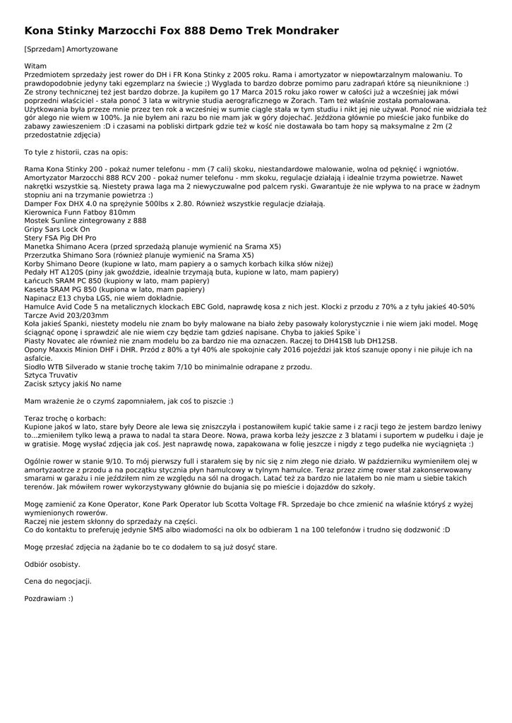 Kona Stinky Marzocchi Fox 888 Demo Trek Mondraker [Sprzedam] Amortyzowane Witam Przedmiotem sprzedaży jest rower do DH i FR Kona Stinky z 2005 roku. Rama i amortyzator w niepowtarzalnym malowaniu. To prawdopodobnie jedyny taki egzemplarz na świecie ;) Wyglada to bardzo dobrze pomimo paru zadrapań które są nieuniknione :) Ze strony technicznej też jest bardzo dobrze. Ja kupiłem go 17 Marca 2015 roku jako rower w całości już a wcześniej jak mówi poprzedni właściciel - stała ponoć 3 lata w witrynie studia aerograficznego w Żorach. Tam też właśnie została pomalowana. Użytkowania była przeze mnie przez ten rok a wcześniej w sumie ciągle stała w tym studiu i nikt jej nie używał. Ponoć nie widziała też gór alego nie wiem w 100%. Ja nie byłem ani razu bo nie mam jak w góry dojechać. Jeźdżona głównie po mieście jako funbike do zabawy zawieszeniem :D i czasami na pobliski dirtpark gdzie też w kość nie dostawała bo tam hopy są maksymalne z 2m (2 przedostatnie zdjęcia) To tyle z historii, czas na opis: Rama Kona Stinky 200 - pokaż numer telefonu - mm (7 cali) skoku, niestandardowe malowanie, wolna od pęknięć i wgniotów. Amortyzator Marzocchi 888 RCV 200 - pokaż numer telefonu - mm skoku, regulacje działają i idealnie trzyma powietrze. Nawet nakrętki wszystkie są. Niestety prawa laga ma 2 niewyczuwalne pod palcem ryski. Gwarantuje że nie wpływa to na prace w żadnym stopniu ani na trzymanie powietrza :) Damper Fox DHX 4.0 na sprężynie 500lbs x 2.80. Również wszystkie regulacje działają. Kierownica Funn Fatboy 810mm Mostek Sunline zintegrowany z 888 Gripy Sars Lock On Stery FSA Pig DH Pro Manetka Shimano Acera (przed sprzedażą planuje wymienić na Srama X5) Przerzutka Shimano Sora (również planuje wymienić na Srama X5) Korby Shimano Deore (kupione w lato, mam papiery a o samych korbach kilka słów niżej) Pedały HT A120S (piny jak gwoździe, idealnie trzymają buta, kupione w lato, mam papiery) Łańcuch SRAM PC 850 (kupiony w lato, mam papiery) Kaseta SRAM PG 850 (kupiona w lato, mam papiery) Napinacz E13 chyba LGS, nie wiem dokładnie. Hamulce Avid Code 5 na metalicznych klockach EBC Gold, naprawdę kosa z nich jest. Klocki z przodu z 70% a z tyłu jakieś 40-50% Tarcze Avid 203/203mm Koła jakieś Spanki, niestety modelu nie znam bo były malowane na biało żeby pasowały kolorystycznie i nie wiem jaki model. Mogę ściągnąć oponę i sprawdzić ale nie wiem czy będzie tam gdzieś napisane. Chyba to jakieś Spike`i Piasty Novatec ale również nie znam modelu bo za bardzo nie ma oznaczen. Raczej to DH41SB lub DH12SB. Opony Maxxis Minion DHF i DHR. Przód z 80% a tył 40% ale spokojnie cały 2016 pojeździ jak ktoś szanuje opony i nie piłuje ich na asfalcie. Siodło WTB Silverado w stanie trochę takim 7/10 bo minimalnie odrapane z przodu. Sztyca Truvativ Zacisk sztycy jakiś No name Mam wrażenie że o czymś zapomniałem, jak coś to piszcie :) Teraz trochę o korbach: Kupione jakoś w lato, stare były Deore ale lewa się zniszczyła i postanowiłem kupić takie same i z racji tego że jestem bardzo leniwy to...zmieniłem tylko lewą a prawa to nadal ta stara Deore. Nowa, prawa korba leży jeszcze z 3 blatami i suportem w pudełku i daje je w gratisie. Mogę wysłać zdjęcia jak coś. Jest naprawdę nowa, zapakowana w folię jeszcze i nigdy z tego pudełka nie wyciągnięta :) Ogólnie rower w stanie 9/10. To mój pierwszy full i starałem się by nic się z nim złego nie działo. W październiku wymieniłem olej w amortyzaotrze z przodu a na początku stycznia płyn hamulcowy w tylnym hamulce. Teraz przez zimę rower stał zakonserwowany smarami w garażu i nie jeździłem nim ze względu na sól na drogach. Latać też za bardzo nie latałem bo nie mam u siebie takich terenów. Jak mówiłem rower wykorzystywany głównie do bujania się po mieście i dojazdów do szkoły. Mogę zamienić za Kone Operator, Kone Park Operator lub Scotta Voltage FR. Sprzedaje bo chce zmienić na właśnie któryś z wyżej wymienionych rowerów. Raczej nie jestem skłonny do sprzedaży na części. Co do kontaktu to preferuję jedynie SMS albo wiadomości na olx bo odbieram 1 na 100 telefonów i trudno się dodzwonić :D Mogę przesłać zdjęcia na żądanie bo te co dodałem to są już dosyć stare. Odbiór osobisty. Cena do negocjacji. Pozdrawiam :) Informacje dodatkowe Stan Używany Ilość Oferta prywatna/sklepu Oferta prywatna Materiał ramy Aluminium Rozmiar ramy 15.5 Rozmiar kół (cale) 26" Waga (kg) Amortyzator przedni 2-półka Skok zawieszenia (mm) 200 System zawieszenia Czterozawiasowy Kąt główki Rodzaj dampera Sprężynowy Adres ogłoszenia http://rowerowybazar.com.pl/kona-stinky-marzocchi-fox-888-demo-trek-mondraker,o3469 Kontakt Mail: [email protected] Telefon: 535112839 Lokalizacja Majakowskiego 48b, Pszów Śląskie (Polska) Ogłoszenie dodano: 2016-02-10 01:15:05 Ogłoszenie wygasa: 2016-02-24 22:38:06 Powered by TCPDF (www.tcpdf.org)
