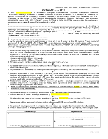 Załącznik 2 SIWZ- wzór umowy / Nr sprawy: SZPZLO/Z-09/2016 UMOWA Nr……./ 2016 W dniu ……………………..r. w Warszawie pomiędzy Samodzielnym Zespołem Publicznych Zakładów Lecznictwa Otwartego Warszawa – Wawer z siedzibą w 04-564 Warszawa, ul.J. Strusia 4/8, wpisaną do rejestru przedsiębiorców Krajowego Rejestru Sądowego prowadzonego przez Sąd Rejonowy dla m.st. Warszawy w Warszawie – XIII Wydział Gospodarczy Krajowego Rejestru Sądowego pod numerem 0000089156, numer NIP: 952-17-54-367, numer REGON: 013076183-00024 zwanym dalej Zamawiającym, reprezentowanym przez: Dyrektor Marię Aleksandrę Kąkol a ……………………………………………………………………………………………………….……… z siedzibą w ……………………………… ul. ………………………….. wpisaną do rejestru przedsiębiorców Krajowego Rejestru Sądowego prowadzonego przez Sąd Rejonowy dla m.st. ………………………. w ………………………………. Wydział Gospodarczy Krajowego Rejestru Sądowego pod nr …………………….., nr NIP: ……………………….., kapitał zakładowy/kapitał wpłacony: …………………………….. zł, zwaną dalej w niniejszej Umowie „Wykonawcą” , reprezentowaną przez: 1. ……………………….. - ……………………..…. 2. ……………………….. - ……………………….. w wyniku udzielenia zamówienia publicznego w trybie art. 4 pkt 8 ustawy z dnia 29 stycznia Prawo zamówień publicznych (t. j. Dz. U. z 2010 r. Nr 113 poz. 759 , ze zm.) zawarta została umowa o następującej treści: Zamawiający i Wykonawca, określani dalej również indywidualnie „Stroną” lub łącznie „Stronami”, zawierają Umowę o następującej treści: § 1. 1. Przedmiotem niniejszej Umowy jest: hurtowy zakup - dostawa fabrycznie nowych tub świetlnych w technologii LED do opraw oświetleniowych w Przychodniach Rejonowych PR1, PR2, PR6 Samodzielnego Zespołu Publicznych Zakładów Lecznictwa Otwartego Warszawa-Wawer z siedzibą w 04-564 Warszawa, ul.J. Strusia 4/8 w następujących ilościach: - tuba świetlna LED – 60cm: 1220 sztuk, - tuba świetlna LED – 120cm: 475 sztuk, 2. Niniejsze warunki handlowe obowiązują przez cały czas trwania umowy. § 2. 1. Sprzedaż fabrycznie nowych tub świetlnych w technologii LED odbywać się będzie w cenach oferowanych w formularzu ofertowym. 2. Wykonawca wraz z dostawą tub świetlnych w technologii LED dostarczy ich karty charakterystyki. § 3. 1. Płatność należności z tytułu transakcji dokonana będzie przez Zamawiającego przelewem na rachunek bankowy Wykonawcy wskazany w treści faktury VAT, w terminie 30 dni, liczonym od protokólarnego odbioru dostawy tub świetlnych w technologii LED oraz dnia wystawienia faktury. Za datę zapłaty uznaje się datę wpływu należności na rachunek bankowy Wykonawcy. 2. Niedokonanie zapłaty w terminie, o którym mowa w § 3 punkt 1 skutkuje naliczaniem przez Wykonawcę odsetek ustawowych od zaległej kwoty za każdy dzień opóźnienia oraz wezwaniem Zamawiającego do niezwłocznego uregulowania należności. 3. Kara za nieterminową dostawę /niezgodną z umową/ tub oświetleniowych: 0,25% za każdy dzień zwłoki liczona od kwoty netto umowy. § 4. Wykonawca odstępuje od wymogu ustanowienia przez Zamawiającego Zabezpieczenia. Umowa wchodzi w życie z dniem jej podpisania tj. ………………………… § 5. Niniejsza Umowa zawarta jest na czas określony, tj. od dnia …………… 2016r. do dnia 24.06.2016r. § 6. Wykonawca udziela gwarancji na tuby świetlne w technologii LED w wysokości 36 miesięcy. § 7. 1. W sprawach nieuregulowanych w niniejszej Umowie stosuje się przepisy Ogólnych Warunków Sprzedaży. 2. Umowę sporządzono w dwóch jednobrzmiących egzemplarzach, po jednym egzemplarzu dla każdej ze Stron. Zamawiający: 1. Wykonawca: 1. …………………………………………………. ( imię i nazwisko/a) 2. ………………………………………………………….. ……………………………………………………… ( imię i nazwisko oraz funkcje) ( imię i nazwisko/a) str. 1 z1